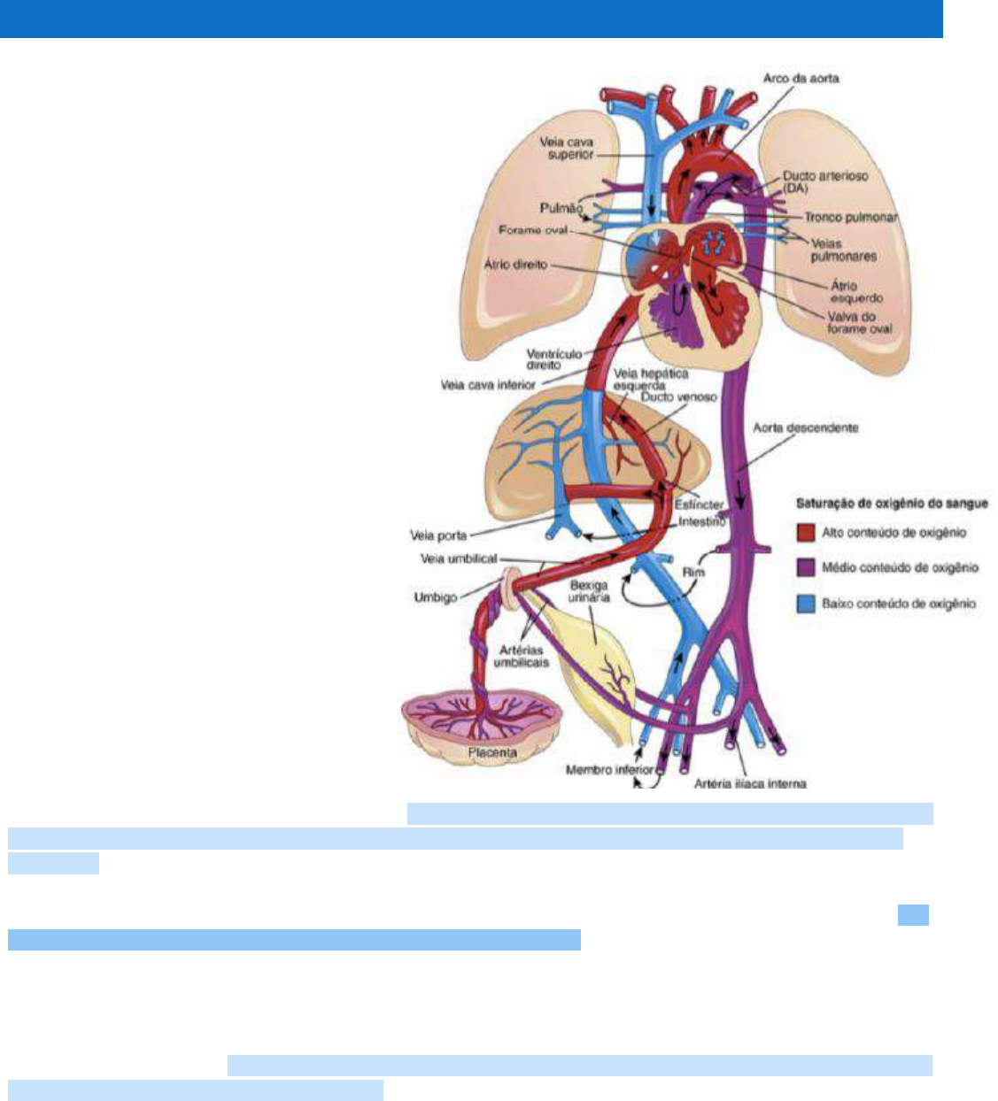 CIRCULAÇÃO FETAL Na circulação fetal existem algumas modificações presentes apenas no feto, pelo fato de os pulmões não estarem oxigenando o sangue. A conexão do feto com a placenta se dá por meio do cordão umbilical que, em seu interior, possui duas artérias (artérias umbilicais, que carregam sangue pobre em oxigênio para a placenta (feto-placenta) e uma veia (veia umbilical, que transporta sangue rico em oxigênio para o feto (placenta-feto). Essas estruturas são cercadas por um tecido conjuntivo mucoide conhecido como Geleia de Wharton (formado por tecido conjuntivo mucoide, e preenchido por um substancia chamada geleia de wharton. Possuí a uma consistência gelatinosa, pelo fato de não apresentar fibras). No feto o sangue oxigenado vem das trocas gasosas na placenta por difusão simples. Assim, o sangue oxigenado, chega da placenta através da veia umbilical (esta possui um esfíncter, que impede o retorno do sangue. E também, funciona como uma válvula, fechando-se temporariamente sempre que o fluxo sanguíneo aumenta demasiadamente na placenta, a fim de não promover uma sobrecarga fetal,) que se estende em direção o fígado. Alí, o sangue passa diretamente para o ducto venoso, um vaso fetal que comunica a veia umbilical com a veia cava inferior. É NA VEIA CAVA INFERIOR QUE OCORRE A PRIMEIRA MISTURA, POIS RECEBE SANGUE COM BAIXO TEOR DE O2 DOS MEMBROS INFERIORES E SANGUE RICO EM O2 DA VEIA UMBILICAL A veia cava inferior desemboca no coração pelo no átrio direito, e apesar de chegar sangue com alto conteúdo de oxigênio, há o 2ºponto de mistura, com sangue de baixo conteúdo vindo da veia cava superior. Como os pulmões não estão oxigenado o sangue, suas artérias e veias estão em vaso constrição ( ou seja, o seus calibres estão estreitos), isso causa aumento na pressão, e esta pressão acaba caindo no ventrículo direito e passa para o átrio direito, essa pressão faz com que o sangue no AD, seja direcionado através do forame oval para o átrio esquerdo. Assim, neste compartimento o sangue com ALTO TEOR DE OXIGÊNIO VINDO DA VEIA CAVA SE MISTURA COM O SANGUE POUCO OXIGENADO VINDO DAS VEIAS PULMONARES, já que os pulmões extra999em oxigênio e não o fornece OBS: O forame oval é de extrema importância na circulação fetal ao permitir que o sangue saia do átrio direito e vá diretamente para o átrio esquerdo. Isso porque caso ele não existisse ocorreria aquilo que ocorre na circulação adulta: o sangue iria do átrio direito para o ventrículo esquerdo e iria em direção aos pulmões. Isso não pode acontecer com os fetos por dois motivos: a) Os pulmões estão cheios de líquido amniótico, ou seja, encontram-se sob alta pressão (alta resistência) – assim, a força necessária que o ventrículo direito teria que exercer sob o pulmão seria muito alta, sobrecarregando-o. b) O sangue que chegaria no átrio esquerdo (vindo dos pulmões) seria pobre em oxigênio. Assim, o sangue que iria desembocar na artéria aorta e seria enviado aos órgãos inferiores teria um baixo teor de oxigênio. Em seguida, o átrio esquerdo se contrai (diástole), movendo o sangue em direção ao ventrículo esquerdo. Na sístole, o ventrículo irá se contrair e conduzirá esse sangue em direção à artéria aorta, por meio da válvula aórtica. (o sangue não retorna ao átrio esquerdo por causa da válvula mitral). Assim, o sangue deixa o coração pela artéria aorta e cai na aorta descendente. O sangue com alto teor de oxigênio encontra-se com o sangue de médio teor proveniente do ducto arterial, resultando em um oxigênio médio na porção descendente da aorta (ou seja 4ª ponto de mistura, na artéria aorta) O ducto arterial, ao desviar o sangue da artéria pulmonar para a artéria aorta, protege os pulmões da sobrecarga e permite que o ventrículo direito se fortaleça para a sua total capacidade funcional ao nascimento. O sangue passa pela artéria aorta descendente, que irá levar esse sangue desoxigenado para as artérias umbilicais, que levará para ser oxigenado na placenta. CIRCULAÇÃO NEONATAL Após o nascimento a geleia de Wharton, que envolve o cordão umbilical (formado de tecido conjuntivo mucoide), começa a contrair e assim o diminui o fluxo de sangue placentário. Dessa forma quando o cordão para de pulsar, e portanto é nesse momento que deve-se corta-lo. Assim o sangue na veia umbilical começa a coagular, e será transformado em LIGAMENTO REDONDO HEPÁTICO . Em seguida o ducto venoso se fecha e começa a fibrosar, se transformando em LIGAMENTO VENOSO . Como a pressão é diminuída com o tempo o forame oval se fecha, formando a FOSSA OVAL . O ducto arterioso se oblitera, por vasoconstrição, de maneira que a circulação pulmonar aumenta; a partir daí, maior quantidade de sangue se dirige aos vasos pulmonares e depois ao átrio esquerdo, aumentado aí a pressão, que supera a existente no átrio direito, em seguida ocorre o fechamento do ducto arterioso, e formando o LIGAMENTO ARTERIAL . E por último as artérias umbilicais se obliteram e fibrosam , transformando em LIGAMENTOS UMBILICAIS
