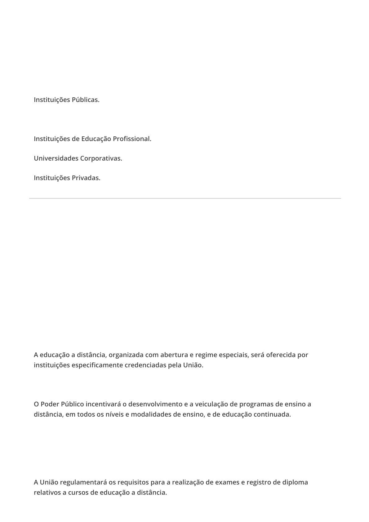 11/05/2021 Comentários https://sereduc.blackboard.com/ultra/courses/_39586_1/outline/assessment/_3258651_1/overview/attempt/_10767610_1/review/inline-feedback?… 1/6 Ocultar opções de resposta Ocultar opções de resposta Pergunta 1 -- /1 Instituições que possiblitaram a evolução da EaD no período da década de 90 ao ano de 2003: Instituições Públicas. Resposta corretaInstituições de Ensino Superior. Instituições de Educação Profissional. Universidades Corporativas. Instituições Privadas. Pergunta 2 -- /1 O artigo 80 da LDB concede a Educação a Distância a sua caracterização legal, estabelecendo as diretrizes básicas para essa modalidade. Assinale abaixo a alternativa que não corresponde a essas diretrizes: A educação a distância, organizada com abertura e regime especiais, será oferecida por instituições especificamente credenciadas pela União. Resposta corretaA educação a distância gozará do mesmo tratamento da educação presencial. O Poder Público incentivará o desenvolvimento e a veiculação de programas de ensino a distância, em todos os níveis e modalidades de ensino, e de educação continuada. Incorreta: As normas para produção, controle e avaliação de programas de educação a distância e a autorização para sua implementação, caberão aos respectivos sistemas de ensino, podendo haver cooperação e integração entre os diferentes sistemas. A União regulamentará os requisitos para a realização de exames e registro de diploma relativos a cursos de educação a distância. 11/05/2021 Comentários https://sereduc.blackboard.com/ultra/courses/_39586_1/outline/assessment/_3258651_1/overview/attempt/_10767610_1/review/inline-feedback?… 2/6 Ocultar opções de resposta Ocultar opções de resposta Pergunta 3 -- /1 O estudante EaD tem um perfil que contempla várias características responsáveis para que seu processo de aprendizagem seja efetivo. Assinale abaixo a característica que possibilita o uso das ferramentas virtuais disponíveis na internet, conhecendo e utilizando aplicativos e sistemas computacionais com muita habilidade: Pró atividade Disciplina Resposta corretaFluência digital Curiosidade Foco Pergunta 4 -- /1 Qual o aspecto que está diretamente relacionadocom a motivação dentro do processo de ensino e aprendizagem? Foco Interatividade Incorreta: Disciplina Resposta corretaRecompensa 11/05/2021 Comentários https://sereduc.blackboard.com/ultra/courses/_39586_1/outline/assessment/_3258651_1/overview/attempt/_10767610_1/review/inline-feedback?… 3/6 Ocultar opções de resposta Ocultar opções de resposta Objetivo Pergunta 5 -- /1 Estudamos que a Web usa o protocolo HTTP para promover a transferência de informações na internet, e depende de browsers (navegadores como Internet Explorer e Chrome) para apresentar tudo isso ao internauta. A Web evoluiu bastante desde sua primeira versão, e hoje temos a Web, 2.0, com características que marcam os seus avanços. Assinale a alternativa que não corresponde a uma característica da WEB 2.0 Estimula a inteligência coletiva e colaboração a partir do momento que o usuário passa a interagir de forma ativa e colaborativa. Hospeda inúmeros programas e serviços, não se limitando apenas a publicação de conteúdos. Resposta corretaÉ uma rede que conecta milhões de computadores pelo mundo. Gera conhecimento e associações através de tags que ajudam no rastreamento das informações. Os usuários são codesenvolvedores . Pergunta 6 -- /1 Os processos de ensino e aprendizagem que acontecem na modalidade da EaD, são aaparados por várias estratégias que têm por objetivo aproximar os cursistas, mesmo que virtualmente. Assinale abaixo a estratégia de nossa metodologia de ensino a distância que se configura por ser uma atividade síncrona: 11/05/2021 Comentários https://sereduc.blackboard.com/ultra/courses/_39586_1/outline/assessment/_3258651_1/overview/attempt/_10767610_1/review/inline-feedback?… 4/6 Ocultar opções de resposta Resposta corretaWeb Conferência Fórum Mensagens AOLs Emails Pergunta 7 -- /1 Para o sucesso de seu percurso formativo na EaD, é muito importante que as interações com os colegas sejam conduzidas de forma assertiva. Estudamos algumas atitudes que devem ser aplicadas nesses momentos. Assinale a alternativa incorreta: Incorreta: Clareza e educação na organização das tarefas em grupo são fundamentais. Informações sobre datas e endereços devem vir completas no e- mail. Devemos usar números ou marcadores para lista de itens ou perguntas a fazer: 1 – Qual o dia da reunião?, 2 – Qual o horário?, 3 – Qual a duração? Deve-se tratar do assunto principal da mensagem logo no início e dos detalhes nos parágrafos seguintes. Resposta correta Devemos caprichar no assunto do e-mail, colocando detalhadamente o título do mesmo. Pergunta 8 -- /1 11/05/2021 Comentários https://sereduc.blackboard.com/ultra/courses/_39586_1/outline/assessment/_3258651_1/overview/attempt/_10767610_1/review/inline-feedback?… 5/6 Ocultar opções de resposta Ocultar opções de resposta O AVA é “ ________________, pois permite, por meio de links, a visita a outros ambientes e materiais para conhecimentos mais aprofundados.” Assinale a alternativa que preenche corretamente a lacuna do texto. dinâmico completo Resposta corretahipermidiático complementar limitado Pergunta 9 -- /1 Conforme estudamos, “Existem cursos presenciais com discussões virtuais e também entregas virtuais de conteúdo com discussões presenciais, o que se denomina ‘Soluções Integradas’”. Assinale a alternativa que corresponde a um termo usado para caracterizar essas soluções: U-Learning. Resposta corretaBlendend. Incorreta: E-Learning. Tecnologias híbridas. Metodologias Ativa. Pergunta 10 -- /1 11/05/2021 Comentários https://sereduc.blackboard.com/ultra/courses/_39586_1/outline/assessment/_3258651_1/overview/attempt/_10767610_1/review/inline-feedback?…