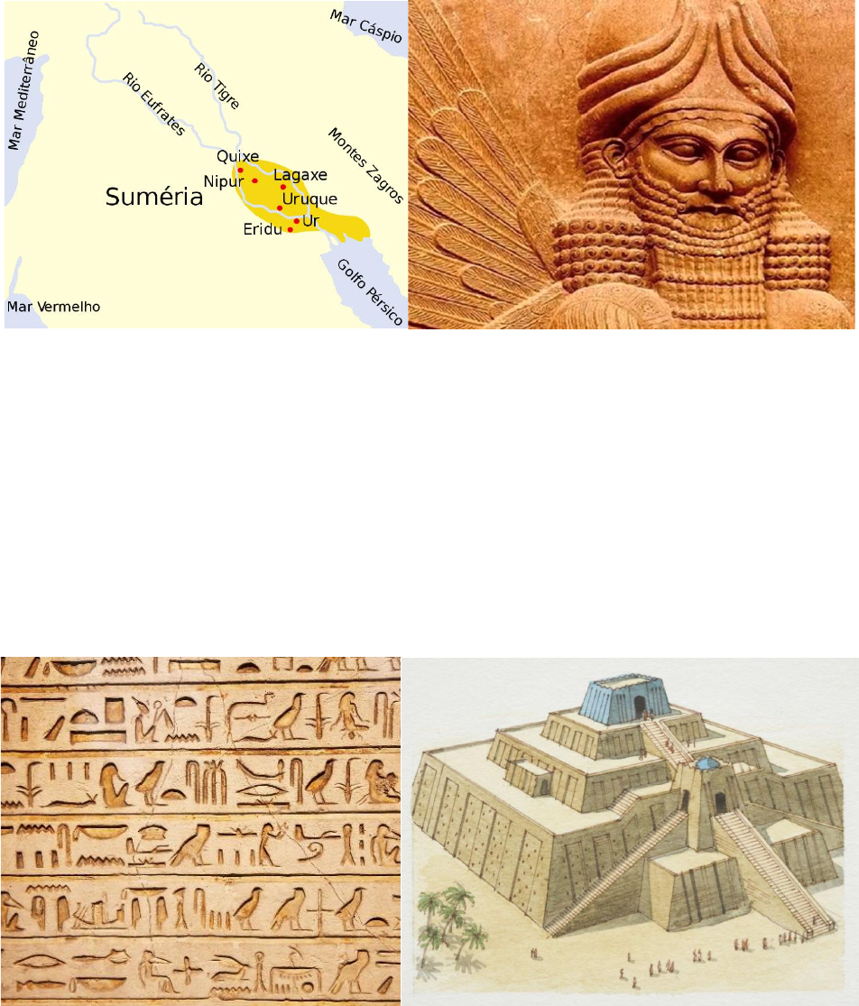 Sumérios Habitantes da Suméria, sul da Mesopotâmia, onde atualmente se encontra o Iraque. Acredita-se que foram os primeiros povos a se desenvolver na região, localizada entre o Rio Tigre e o Rio Eufrates. Organização Política → poder descentralizado em várias Cidades-Estado Economia → Agricultura (sistema de irrigação complexo) e Comércio (artesanato, cerâmica) Cultura → Escrita Cuneiforme(desenvolvida por fins administrativos, religiosos e para comunicação) , Arquitetura (templos religiosos) Religião → Politeísmo