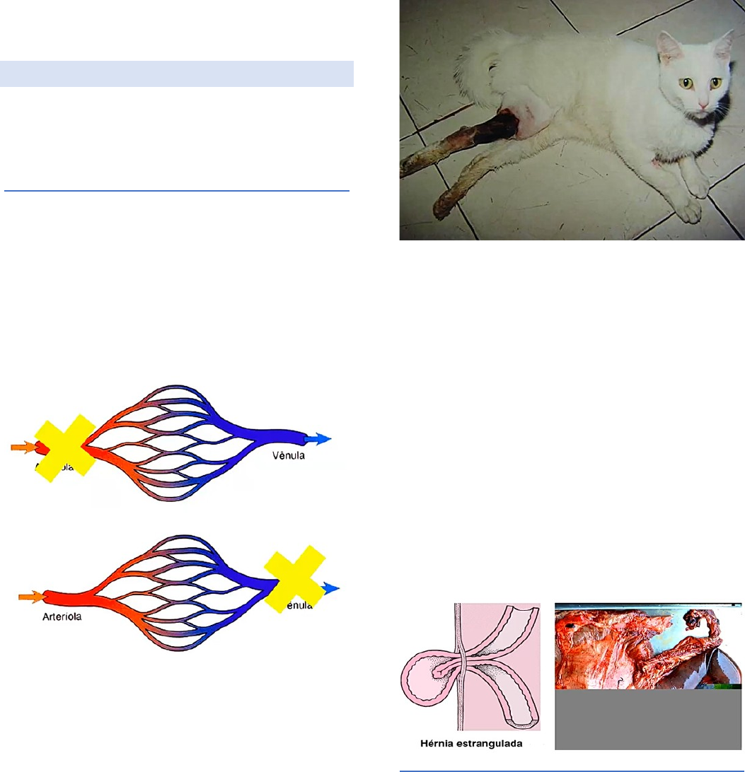 Isquemia e infarto Isquemia - É a redução ou falta de fluxo sanguíneo a um tecido ou parte do organismo; - Ocasiona hipóxia ou anóxia > diminui a tensão de oxigênio; Causas - Obstrução parcial ou total da luz vascular: · Artérias; · Veias; · Microcirculação. - Leva ao quadro de hipoperfusão tecidual sistêmica; - Tecido que era para estar sendo perfundido/drenado não faz as trocas gasosas; Obstrução total ou parcial de artérias: - Principal causa de isquemia; - Associado à aterosclerose; - Obstrução intravascular; - Compressões extrínsecas ou espasmos na parede vascular. Obstrução intravascular: - Aterosclerose; - Trombose arterial; - Embolia; - Arterites. Compressões extrínsecas ou espasmos na parede vascular: - Compressões (neoplasia, inflamações); - Decúbito prolongado; - Síndrome compartimental (órgãos); - Espasmos vasculares (desequilíbrio vasodilatadores e vasoconstritores). Gato. Cardiomiopatia hipertrófica. Gangrena seca (necrose isquêmica). - Áreas limítrofes (circulações terminais): cérebro e intestino grosso > facilmente afetados por necrose. Obstrução total ou parcial da microcirculação: - Aumento na viscosidade sangue; - CID; - Úlceras de decúbito; - Embolia gasosa ou de gordura; - Parasitas intracelulares. Obstrução total ou parcial de veias: - Trombose venosa; - Compressão extrínseca; - Congestão/edema; - Hérnia intestinal estrangulada; - Vólvulo intestinal; - Torção de testículo, ovários ou neoplasias. Consequências da isquemia Anatomia do suprimento vascular: - Pulmão dupla circulação (arteríolas pulmonares e brônquicas); - Fígado; - Rins e baço circulação terminal. Velocidade da oclusão: - Lenta. Vulnerabilidade do tecido: - Neurônios (sobrevive de 3 a 4 minutos sem oxigênio); - Cardiomiócitos (20 a 30 minutos); - Fibroblastos (horas). - Obstrução de artéria coronária > lesão hiperaguda e crônica. Infarto - Consequência de uma área de isquemia; - Área de necrose isquêmica aguda; - Oclusão da irrigação ou drenagem; - Isquemia > perda de fluxo para uma determinada área; - Acontece rapidamente. Causas - Trombos (ativação excessiva dos processos hemostáticos normais); - Êmbolos (corpos estranhos que se deslocam pela circulação). Fatores que influenciam o desenvolvimento e consequência do infarto - Circulação colateral: disponibilidade de um fluxo sanguíneo alternativo (pulmão e fígado: baço e rim); - Período de desenvolvimento da oclusão: lentamente (crônico) circulações alternativas; - Artérias e veias; - Vulnerabilidade do tecido em hipóxia (miocárdio e neurônios); - Conteúdo sanguíneo de oxigênio: indivíduo anêmico e sadio; - Duração da isquemia. Aporte sanguíneo dos órgãos - Cérebro, rins, coração e baço – aporte único; - Músculo e TGI – várias anastomoses; - Pulmão e fígado – aporte duplo. - Maioria dos infartos – vermelho escuro > hemorragia de pequenos vasos; - Após a necrose – branco > necrose, edema, hemólise. Classificação Infarto branco ou anêmico – morfologia: - Forma macroscópica > superfície serosa com margens; - Forma microscópica > tempo de ocorrência x lesão. - Após alguns dias as células inflamatórias invadem o tecido necrótico; - Resíduos são fagocitados; - Formando tecido de granulação e após fibrose – cicatrização. Rim com infarto branco (anêmico). Área triangular com centro branco, área de necrose de coagulação. Infarto branco com área de cicatrização. Área de necrose na musculatura peitoral de ave. Área de necrose na musculatura de bovino. Área de necrose no miocárdio. Infarto vermelho ou hemorrágico – morfologia: - Depende de oclusão venosa/arterial, circulação colateral/terminal, textura do tecido e restabelecimento do fluxo. Baço. Cérebro. Rins. Pulmão. Infarto séptico/asséptico - Presença/ausência de infecção microbiana; - Importância clínica: depende da localização, tamanho da lesão; - Destino da área de infarto: reparação/regeneração. Consequências - Dependem do: · Fluxo sanguíneo; · Tecido em questão; · Tipo de obstrução; · Agente obstrutivo.
