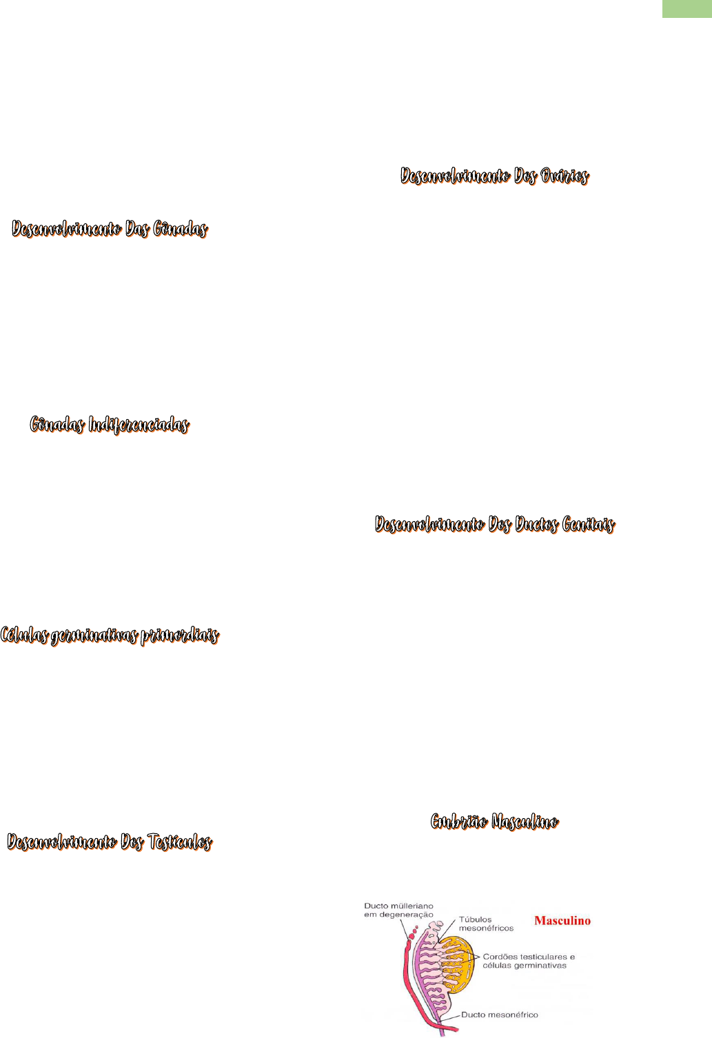 1 AMEC Ana Carolina De Alvarez MED103 Embriologia do genital As características sexuais são definidas a partir da fecundação do espermatozoide x ou y no ovócito. As características masculinas e femininas só começam a se desenvolver a partir da sétima semana. Os sistemas iniciais de ambos os sexos são parecidos, é um estágio indiferenciado do desenvolvimento sexual As gônadas (testículos ou ovários) são órgãos que produzem as células sexuais (espermatozoides ou oócitos). Elas são derivadas de três fontes: ▪ Mesotélio (epitélio mesodérmico) revestindo a parede abdominal posterior; ▪ Mesênquima subjacente (tecido conjuntivo embrionário); ▪ Células germinativas primordiais (primeiras células sexuais indiferenciadas). Ocorrem durante quinta semana quando uma área de espessamento do mesotélio subjacente, forma uma adjacência próximo ao mesonefro, as cristas gonodais. Os cordões gonodais, crescem para dentro do mesênquima subjacente. Agora as gônadas indiferenciadas são formadas por um córtex externo e da medula interna. Nos embriões cromossômicos XX, o córtex se diferencia em ovários e a medula ira regredir, enquanto em embriões XY, a medula ira se diferenciar em testículos e o córtex regride. São células sexuais grandes e esféricas. Podem ser identificadas a partir dos 24 dias de gestação, entre as células endodermics de vesícula umbilical (perto da origem do alantoide). Quando o embrião se dobra, a parte dorsal da vesícula, umbilical é incorporada no embrião. Com isso, as cédulas germinativas primordiais migram ao longo do mesentério dorsal do intestino posterior para as cristas gonadais. Na sexta semana, elas penetram no mesênquima subjacente, sendo incorporadas aos cordões gonodais. O fator determinante dos testículos, faz com que os cordões seminíferos se condensem e irão se deslocar para dentro da medula da gônada indiferenciada, logo. eles se ramificam e se anastomosam para formarem a rede testicular(rede de canais). Os cordões seminíferos se desenvolvem em túbulos seminíferos, túbulos retos e rede testicular. Os túbulos seminíferos serão separados pelo mesênquima que dá origem às células intersticiais (células de Leydig). Na oitava semana, essas células começam a secretar hormônios androgênicos (testosterona e Androstenediona), que irão induzir a diferenciação masculina dos ductos mesonéfricos e da genitália externa. A gonadotrofina coriônica, estimula a produção de testosterona, atingindo valores de pico entre a oitava e decima segunda semanas. O desenvolvimento gonadal feminino é mais lento. Os ovários não podem ser histologicamente identificados ate a decima semana. Os cordões gonadais não são proeminentes no ovário em desenvolvimento, porem eles se estendem adentro da medula e formam um ovário rudimentar . a rede de canais e os cordões, se degeneram e desaparecem. cordões corticais estendem-se do epitélio de superfície do ovário em desenvolvimento para dentro do mesênquima subjacente durante o período fetal inicial. Esse epitélio é derivado do mesotélio do peritônio. Conforme os cordões corticais vao aumentando de tamanho, as células germinativas iniciais vao se incorporando a ele. Com 16 semanas, esses cordões começam a se romper em grupos de células foliculares achatadas derivadas do epitélio de superfície. A mitose ativa das oogônias ocorre durante a vida fetal, produzindo todos os folículos primários de uma mulher, não havendo produção após o nascimento. Durante a quinta e sexta semana, o sistema genital não se diferencia e estão presentes dois pares de ductos genitais. • Ductos de Wolf (ductos mesonéfricos): Desempenham uma parte importante no desenvolvimento do sistema reprodutor masculino • Ductos de Muller (ductos paramesonéfricos): Têm um papel condutor no desenvolvimento do sistema reprodutor feminino. Os ductos paramesonéfricos se desenvolvem laterais às gônadas e aos ductos mesonéfricos em cada lado a partir de invaginações longitudinais do mesotélio nos aspectos laterais dos mesonefros. As bordas se fundem formando os ductos paramesonefricos. O ducto paramesonéfrico vai se degenerar e o ducto mesonéfrico vai se transformar em epidídimo, ducto deferente e ducto ejaculatório. 2 AMEC Ana Carolina De Alvarez MED103 O ducto paramesonéfrico vai formar as trompas, o útero e a vagina e o ducto mesonéfrico vai se degenerar A Testosterona é a responsável por estimular os ductos mesonefricos em formar os ductos genitais masculinos. O hormônio antimuleriano faz com que os paramesonefricos regridam. Na oitava semana, sob influencia da testosterona, parte proximal de cada ducto mesonéfrico se torna altamente enrolada, para formar o epidídimo. Conforme o mesonefro vai se regenerando, alguns tubos ainda persistem, sendo transformados em ductos eferentes. Esses ductos se abrem em direção ao ducto do epidídimo. Distal ao epidídimo, o ducto mesonéfrico adquire um revestimento espesso de musculo liso e se torna o ducto deferente. Se originam a partir das invaginações das laterais da extremidade caudal dos ductos mesonéfricos. Essas, irão produzir um liquido que formara a maior parte do volume ejaculado, e nutre os espermatozoides. Parte do ducto mesonéfrico entre o ducto dessa glândula e da uretra se torna o ducto ejaculatório O epitélio glandular da próstata se diferencia a partir dessas células endodérmicas e o mesênquima associado diferencia- se no estroma. Desenvolvem-se a partir de evaginações derivadas da parte esponjosa da uretra. Com a ausência de testosterona em embriões femininos, os ductos mesonéfricos regridem. Permanecem alguns remanescentes Os ductos paramesonefricos desenvolvem- se devido à ausência de SIM (Substância Inibidora Mulleriana). O desenvolvimento sexual feminino durante o período fetal não depende da presença de ovários ou hormônios. Mais tarde, estrogênios produzidos pelos ov