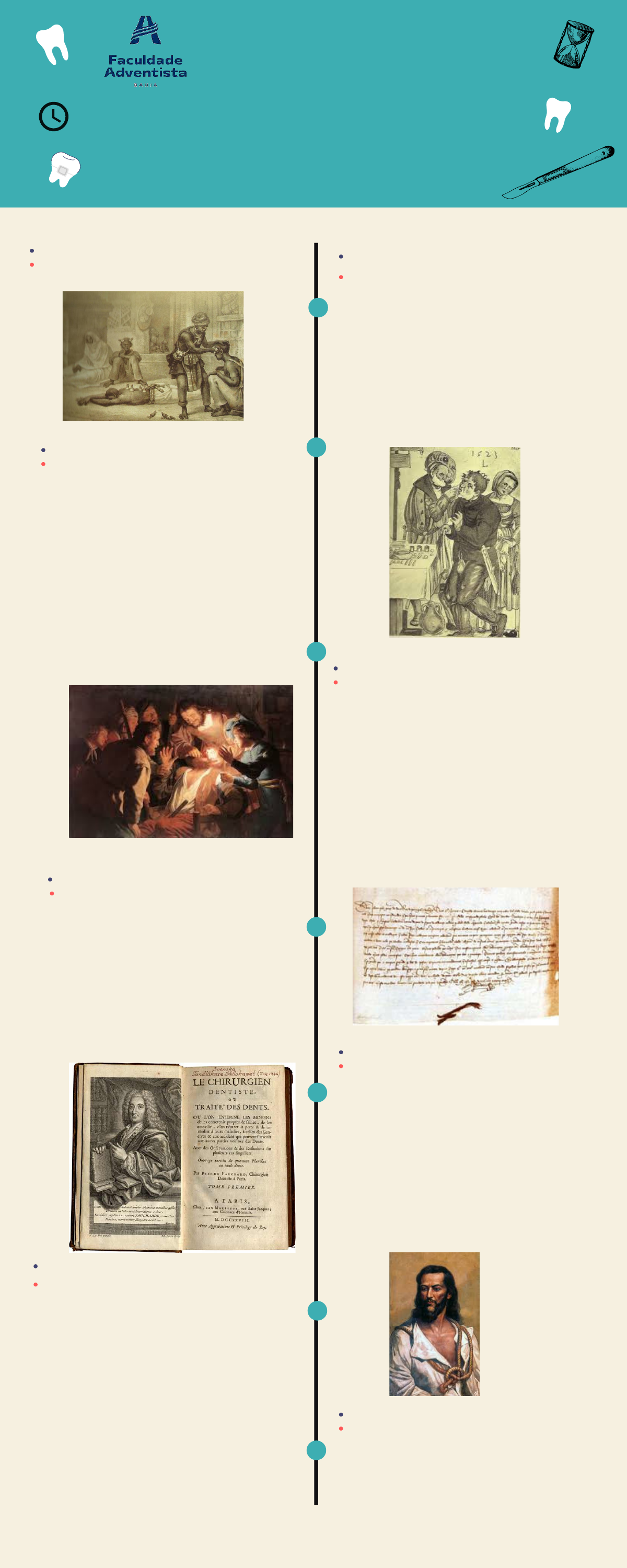 MANEIRAS EFICAZES DE ESTUDAR ANTES DOS EXAMES LINHA DO TEMPO ODONTOLOGIA - BRASIL Assim como nos demais países da Europa, no Brasil Colonial, não existia um especialista para realizar tratamentos dentais. Havia a figura do tira-dentes com sua "caixa de horrores"(faca de formas e tamanhos diferentes, alavancas, boticões), o que só era procurado como último recurso. PRIMEIRO DOCUMENTO NORMATIVO 1629 - Em 09 de novembro de 1629 a Carta Régia é criada citando os barbeiros e o Regimento do Oficio de Cirurgião dentário. "[...] no Brasil, os acometidos por doenças dentárias procuravam sozinhos ações contra a dor de dentes, buscavam formas para tratar tal patologia, sendo o cuidado feito por meio benzeduras, rezas, e uso de medicamentos à guisa de óleo de cravo [...]." Ainda no período colonial muitos barbeiros ou "sangradores" vieram de Portugal para exercer a arte dentária. Existe também o relato de um português que ao ser encontrado por uma tribo indígena com muita dor de dente foi oferecido uma espécie de aparelho de madeira para extração. (PEREIRA, 2012) PATRONO DA ODONTOLOGIA- BRASIL 1756 - 1792 - Joaquim José da Silva Xavier (Tiradentes) foi dentista, tropeiro, minerador, comerciante, militar e ativista político, se tornou herói por ser um dos líderes da Inconfidência mineira. Allan Israel Fortaleza Santos 2º Período de Odontologia 1500 D.C 1782- REAL JUNTA DE PRONTO- MEDICATO Criado para exame e expedição de cartas e licenciamento das "pessoas que tirassem dentes". PAI DA ODONTOLOGIA MODERNA 1728 - A odontologia começou a ganhar mais especificidade devido aos avanços de Pierre Fauchard, francês que se tornou conhecido como o pai da odontologia moderna. Mesmo não sendo brasileiro, suas obras chegaram aos poucos e também revolucionaram a odontologia do Brasil. PERÍODO GOVERNAMENTAL MARCO ECONÔMICO LEGENDAS: Pau brasil, algodão, tabaco, cana de açúcar. Período Colonial Período Colonial Período Colonial Pau brasil, algodão, tabaco, cana de açúcar. Pau brasil, algodão, tabaco, cana de açúcar. Período Colonial Pau brasil, algodão, tabaco, cana de açúcar. Período Colonial Ciclo do ouro, cana de açúcar, Período Colonial Ciclo do ouro, cana de açúcar, Ciclo do ouro, cana de açúcar, Período Colonial 1884- Primeira Faculdade de Odontologia vinculado simultaneamente às faculdades de Medicina do Rio de Janeiro e Bahia. 1900- Novas Faculdades surgem com o curso de Odontologia, entre elas a Escola de Odontologia de São Paulo. 1950- A Odontologia teve autonomia como campo do conhecimento definida. 1964- A instituição do Conselho Federal de Odontologia e dos Conselhos Regionais de Odontologia e a regulamentação do exercício da Odontologia em todo o território nacional. 1811- É outorgado que é necessário diploma para liberação de práticas odontológicas 1800 - Arte dentária é considerada profissão autônoma no Brasil 1808 - Chegada da Família Real ao Brasil. Houve uma preocupação maior com relação a saúde e saneamento básico. Período Colonial Ciclo do ouro, diamante, cana de açúcar. Período Imperial Período Imperial Período Imperial Ciclo do ouro, diamante, cana de açúcar. Ciclo do ouro, diamante, cana de açúcar. Ciclo do café, ciclo da erva mate, ciclo da borracha. Período Republicano Ciclo do café, ciclo da erva mate, ciclo da borracha. Estado Novo Industrialização e Desenvolvimentismo. Regime Militar Industrialização, Desenvolvimentismo, "Milagre econômico". 1950-1980 Sistema Incremental- Surge no EUA, visava a prevenção da cárie em crianças, acreditando que atingindo tal faixa etária, na fase adulta não teriam a doença cárie. Logo o modelo chegou ao Brasil. Um grande avanço foi o programa de serviço público odontológico que adicionou fluoretação na rede hídrica de abastecimento. 1942- Surgimento do Serviço Especial de Saúde no Brasil (SESP) pelo governo de Getulio Vargas. Estado Novo Industrialização e Desenvolvimentismo. 1970 Odontologia Simplificada - surge com o objetivo de simplificar a tecnologia, diminuir custos e ampliar o acesso a um maior número de pessoas. Regime Militar Industrialização, Desenvolvimentismo, "Milagre econômico". 1808 - Criação da primeira Organização Nacional de Saúde Pública no Brasil. 1828- Foi promulgada lei de Municipalização dos Serviços de Saúde. Período Imperial Ciclo do café, ciclo da erva mate, ciclo da borracha. 1837- Imunização compulsória das crianças contra a varíola. Período Imperial Ciclo do ouro, diamante, cana de açúcar. 1903- Campanha de Imunização projetada por Oswaldo Cruz contra a Febre Amarela e Peste bubônica. Além de influenciar na melhoria do saneamento básico. Período Republicano Ciclo do café, ciclo da erva mate, ciclo da borracha. Referências bibliográficas: PEREIRA, Wander. Uma História da Odontologia no Brasil. História e Perspectiva. Uberlândia. 2012. Disponível em: < http://www.seer.ufu.br/index.php/historiaperspectivas/article/view/21268/11525 >. Acesso em: 23/08/2020 FRATUCCI, Maristela.V.B; VASCONCELOS, Erico. M. Breve histórico das práticas de Saúde Bucal. Práticas de saúde bucal. UnA-SUS UNIFESP. 2013. Disponível em: < https://www.unasus.unifesp.br/biblioteca_virtual/esf/3/unidades_conteudos/unidade24o/p_01.htm > . Acesso em: 23/08/2020. SPYERE, Patrícia. R. HISTÓRIA DA ODONTOLOGIA NO BRASIL. Casa da Cultura de Piumhi. Minas Gerais. Disponível em: < http://museudasprofissoes.blogspot.com/p/historia-da-odontologia-no-brasil.html > . Acesso em: 24/08/2020. História econômica do Brasil. In: Wikipédia: a enciclopédia livre. Disponível em: <https://pt.wikipedia.org/wiki/Hist%C3%B3ria_econ%C3%B4mica_do_Brasil> Acesso em: 30/08/2020. NICKEL, D.A; LIMA, F.G; SILVA, B.B. Modelos assistenciais em saúde bucal no Brasil. Cad. Saúde Pública. Rio de Janeiro. 2008. 2004- O Brasil Sorridente foi lançado pelo Ministério da Saúde para ampliar o acesso ao tratamento odontológic