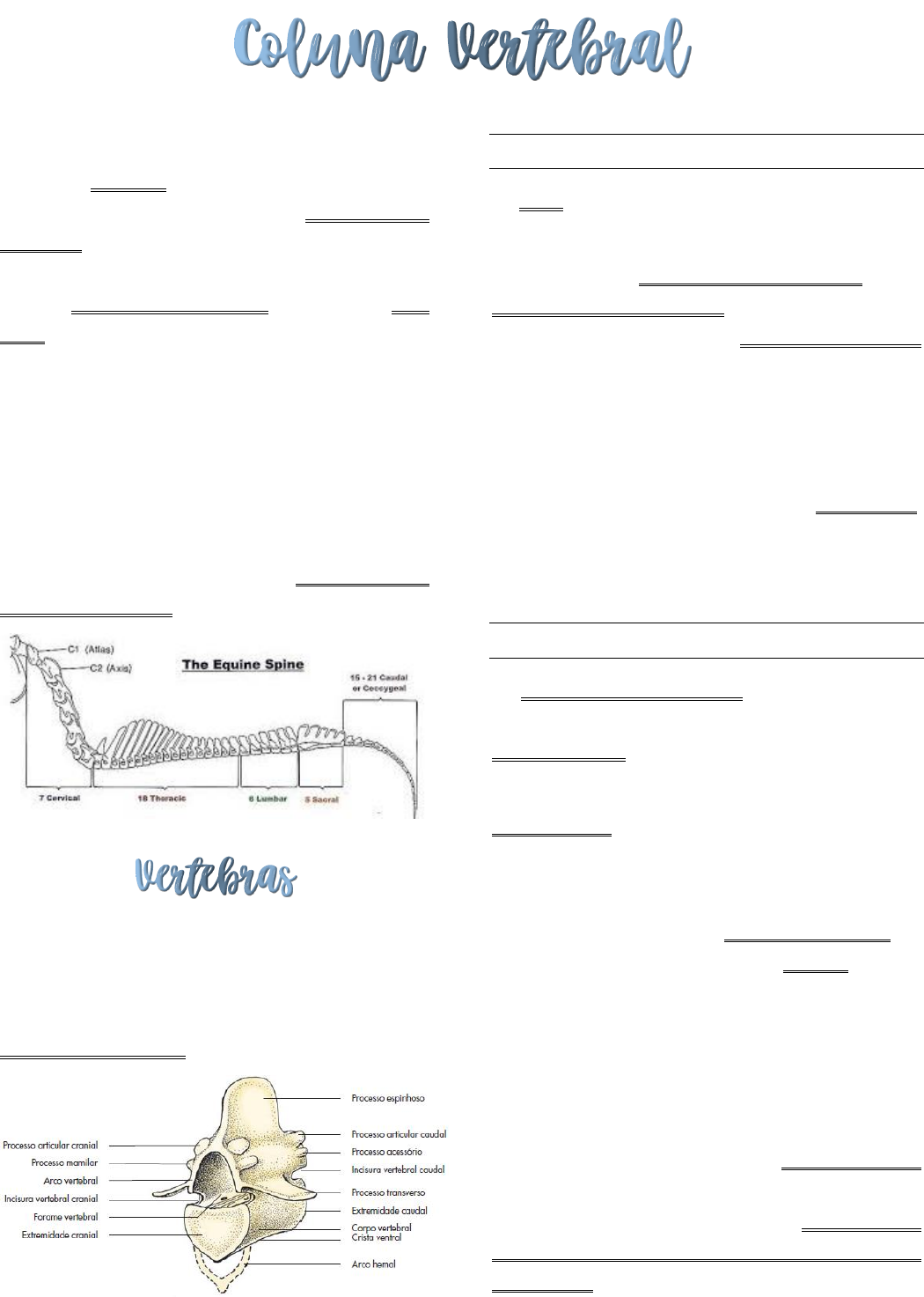 - A coluna vertebral é formada por uma série de ossos chamados vértebras. Ela consiste em uma cadeia mediana, ímpar, sólida e flexível de ossos curtos e irregulares que se estendem do crânio (fornece os movimentos da cabeça) até a extremidade da cauda (tem início no forame magno no crânio e término no canal sacral); - Sustenta o tórax e os órgãos principais da circulação, da respiração e da digestão; assume a função central como parte do sistema locomotor ao formar uma ponte entre os membros torácicos e os membros pélvicos; - As modificações apresentadas pelas vértebras e a parte do corpo na qual estão inseridas permitem a divisão da coluna vertebral em cinco regiões: cervical, torácica, lombar, sacral e caudal; - Embora as vértebras das diferentes regiões cumpram funções diferentes e apresentem características próprias, todas elas compartilham uma estrutura básica: corpo, arco e processos; CORPO - O corpo é a massa ventral prismática ou cilíndrica sobre a qual se assentam as outras partes; - Apresenta uma extremidade cranial convexa e uma extremidade caudal côncava, que se inserem nas vértebras adjacentes por discos intervertebrais fibrocartilaginosos; - A face dorsal do corpo da vértebra é marcada por sulcos longitudinais, forames nutrícios e uma ondulação mediana para a fixação de ligamentos (entra na formação do canal vertebral). A face ventral possui a crista ventral, que varia em tamanho dependendo da região da coluna vertebral; ARCO - O arco vertebral ou arco neural se forma sobre a face dorsal do corpo vertebral e, desse modo, delimita um forame vertebral; - Os forames vertebrais de cada vértebra constituem o canal vertebral, que abrange a medula espinal, suas meninges, os nervos espinais, os vasos sanguíneos e o tecido conectivo; - Cada arco é composto por dois pedículos laterais. As bases dos pedículos apresentam incisuras. Quando vértebras sucessivas se articulam, as incisuras de cada um dos lados das vértebras adjacentes delineiam os forames intervertebrais; - No sentido dorsal, a maior parte dos arcos vertebrais se encaixa sem deixar espaços, mas há três locais na coluna vertebral onde se forma um espaço interarcos (entre os arcos das vértebras adjacentes). Tais espaços têm importância clínica, pois possibilitam acesso ao canal vertebral para injeções ou para obter amostras do líquido cerebrospinal; - Esses espaços são o espaço atlanto-occipital (entre o osso occipital e o atlas), espaço atlantoaxial (entre o atlas e o áxis) e o espaço lombossacral (entre a última vértebra lombar e o sacro); PROCESSOS - Cada vértebra apresenta uma determinada quantidade de processos para a fixação de músculos e ligamentos e para a articulação com as vértebras adjacentes. Os seguintes processos podem estar presentes: - Um processo dorsal ou espinhoso na linha mediodorsal do arco vertebral; - Quatro processos articulares, dois na extremidade cranial e dois na extremidade caudal. Apresentam superfícies articulares adaptadas àquelas das vértebras adjacentes e a superfície restante é rugosa; - Dois processos transversos que se projetam lateralmente a partir da base do arco vertebral; - Dois processos mamilares entre os processos articulares transverso e cranial das vértebras torácicas e lombares; - Das sete vértebras que compõem a base do pescoço, as duas primeiras recebem nomes especiais; - A primeira (atlas) e a segunda (áxis) vértebras cervicais são extremamente modificadas para permitir a livre movimentação da cabeça; ATLAS - Aparentemente não possui corpo, mas consiste em duas massas laterais unidas por um arco dorsal e outro ventral, os quais constituem um anel ósseo; - Um processo transverso prolongado se projeta lateralmente de cada massa, esses processos planos são chamados de asas do atlas (propiciam fixação para a musculatura dorsal e ventral, a qual é responsável pela movimentação da cabeça para cima e para baixo, e compõem a conexão muscular entre a coluna e a face nucal do osso occipital); - A face ventral da asa é escavada para formar a fossa do atlas. Sua base é perfurada pelo forame alar, ou em carnívoros pela incisura alar. O forame vertebral lateral se abre na parte craniodorsal do arco vertebral. O forame transverso é um canal curto que atravessa a parte caudal da asa do atlas e não está presente em ruminantes; - A face cranial do arco ventral do atlas é escavada para se articular com os côndilos occipitais. A face dorsal do arco ventral apresenta uma face articular côncava transversa caudal, a fóvea do dente, a qual se articula com o dente do áxis; ÁXIS - Forma o eixo sobre o qual o atlas, e consequentemente a cabeça, giram. Seu corpo cilíndrico apresenta uma crista ventral bem-desenvolvida. A extremidade cranial do corpo se caracteriza pelo dente situado centralmente, o qual é visto como o corpo deslocado do atlas com base em seu desenvolvimento. Ele é semelhante a um bastão em carnívoros e a um bico em outras espécies; - O arco do áxis possui o processo espinhoso alongado e protuberante, o qual se projeta sobre a extremidade cranial e caudal do corpo vertebral em carnívoros e apenas na extremidade caudal no suíno. Ele é uma lâmina óssea retangular em ruminantes e se bifurca caudalmente no equino; - O processo espinhoso conflui com os processos articulares caudais em carnívoros e equinos, mas permanece separado em ruminantes e no suíno; - Os processos transversos pares são perfurados na direção da base pelo forame transverso. A incisura vertebral cranial, presente em carnívoros, é substituída por um forame vertebral lateral nos outros mamíferos domésticos; RESTANTE - Os corpos das vértebras cervicais restantes se tornam cada vez mais curtos do sentido cranial ao caudal. As faces ventrais da 3ª para a 5ª vértebra cervical possuem uma crista ventral firme, a qual se torna indistinta ou ausente na 6ª e 7ª vértebras. A extre