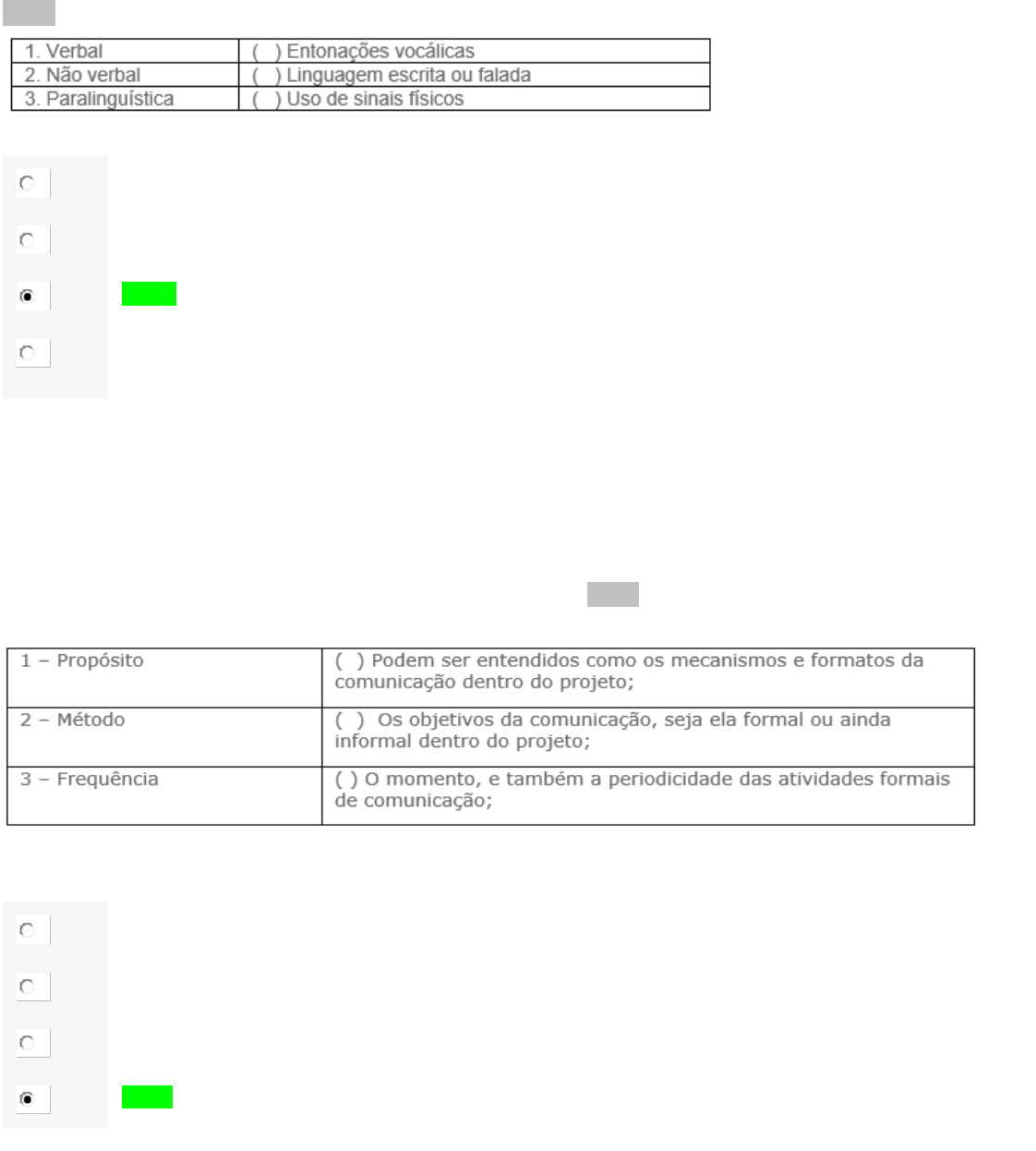 APOL Gestão da Comunicação em Projetos Questão 1 - Muitos são os estudos sobre os diferentes tipos de comunicação e seus estilos. Para que a comunicação aconteça de forma clara, é necessário escolher um estilo que facilite o entendimento por parte do receptor. A respeito dos tipos de comunicação, conforme os conteúdos da Rota 1 da disciplina Gestão da Comunicação em Projetos, enumere, de acordo com as explicações que se relacionam a cada um dos elementos a seguir: Tipos de comunicação Tipos Uso Verbal Linguagem escrita ou falada Não verbal Uso de sinais físicos Paralinguística Entonações vocálicas Pág 9 Agora, selecione a alternativa que apresenta a sequência correta: A 1- 2- 3 B 2- 3- 1 C 3- 1- 2 D 1- 3- 2 Questão 2 - Segundo Chaves et al. ( 2010) mesmo que detalhes possam variar nos planos de comunicação em projetos, por conta da complexidade, tamanho e duração do projeto, todo plano deve conter três aspectos básicos. Esses aspectos são importantes para garantir a aderência do que está sendo planejado com a realidade encontrada em projetos. A respeito desses aspectos, conforme os conteúdos trabalhados na aula 4, da disciplina Gestão da Comunicação em Projetos, enumere, de acordo com as explicações que se relacionam a cada um dos elementos a seguir: Como primeiro aspecto, podese citar o propósito; ou seja, os objetivos da comunicação, seja ela formal ou ainda informal dentro do projeto. O segundo aspecto é o método; podem ser entendidos como os mecanismos e formatos da comunicação dentro do projeto. Por fim, como terceiro e último aspecto, pode-se apresentar a frequência; ou seja, o momento, e também a periodicidade das atividades formais de comunicação Pág 5 Agora, assinale a alternativa que apresenta a sequência correta: A 3, 2, 1 B 1, 2, 3 C 3, 1, 2 D 2, 1, 3 3/5 - Sobre a área de comunicação em projetos, conforme conteúdos trabalhados na aula 3 da disciplina Gestão da Comunicação em Projetos, verificam-se três processos em três diferentes grupos de gerenciamento de projetos. Assim, analise as afirmativas a seguir: Exclusivamente sobre a área de comunicação em projetos, verificam-se três processos em três diferentes grupos de gerenciamento de projetos. Existe um processo no grupo de planejamento, um no grupo de monitoramento e controle e um processo pertencente ao grupo de execução em projetos. I . Existe um processo no grupo de planejamento; V II . Um no grupo de monitoramento e controle; V III. Um processo pertencente ao grupo de encerramento em projetos; F Assinale a alternativa correta: Exclusivamente sobre a área de comunicação em projetos, verificam-se três processos em três diferentes grupos de gerenciamento de projetos. Existe um processo no grupo de planejamento, um no grupo de monitoramento e controle e um processo pertencente ao grupo de execução em projetos. Pág 10 A estão corretas somente as afirmativas I e III; B estão corretas somente as afirmativas I e II. C estão corretas somente as afirmativas II e III. D Todas estão corretas. Questão 4 - De acordo com os conteúdos trabalhados na aula 6, da disciplina Gestão da Comunicação em Projetos, as ferramentas ou técnicas disponíveis para a realização processo de monitoramento das comunicações são: Já como ferramentas ou técnicas disponíveis para a realização deste processo, podemos citar: Opinião especializada; Sistema de informações de gerenciamento de projetos; Análise de dados; Habilidades interpessoais e de equipe; e a realização de Reuniões. Pág 3 A Opinião especializada; Sistema de informações de gerenciamento de projetos; Análise de dados; Habilidades interpessoais e de equipe; e Fatores ambientais da empresa. B Opinião especializada; Sistema de informações de gerenciamento de projetos; Análise de dados; Habilidades interpessoais e de equipe; e a realização de Reuniões. C Sistema de informações de gerenciamento de projetos; Solicitações de mudança; Análise de dados; Habilidades interpessoais e de equipe; e a realização de Reuniões. D Opinião especializada; Sistema de informações de gerenciamento de projetos; Análise de dados; Habilidades interpessoais e de equipe; realização de Reuniões e a Atualizações de documentos do projeto. Questão 5 - Conforme a Rota 2, da disciplina Gestão da Comunicação em Projetos, o gerente de projetos deve se empenhar no cumprimento dos objetivos do projeto, bem como na atualização de conhecimentos e no treinamento de habilidades necessárias para o desempenho de sua função. São habilidades necessárias para esse gerente: Atenção à sua formação; Cuidado na condução das equipes; Proatividade em superar desafios profissionais e os do projeto; Utilização plena de uma comunicação com todos os interessados no projeto. Pág 14 Analise as assertivas abaixo em realçai as habilidades necessárias para esse gerente são: I - Atenção à sua formação; V II- Cuidado na condução das equipes; V III- Proatividade em superar desafios profissionais e os do projeto; V IV Utilização plena de uma comunicação com todos os interessados no projeto. V Assinale a alternativa correta: A estão corretas apenas as assertivas I e II. B estão corretas apenas as assertivas I ,III, IV. C estão corretas apenas as assertivas II, III e IV. D todas estão corretas. Questão 6 - De acordo com (PMI, 2017), o PMBOK® organiza as ações relacionadas a projetos em 10 diferentes áreas do conhecimento e cada uma possui uma sequência de divisão. A respeito dessa divisão, de acordo com os conteúdos trabalhados na Rota 3 da disciplina Gestão da Comunicação em Projetos, enumere, as explicações a cada um dos elementos: Como entradas, entendem-se os requisitos necessários para se desenvolver determinada área do gerenciamento. As ferramentas e técnicas podem ser compreendidas como as 10 habilidades e os procedimentos necessários para se completar as aç
