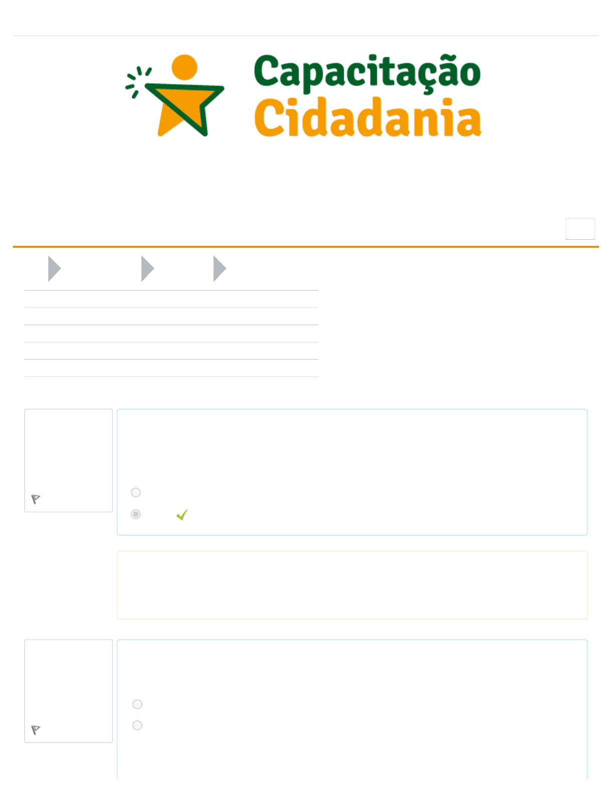 Buscar cursos Questão 1 Correto Atingiu 0,50 de 0,50 Marcar questão Questão 2 Correto Atingiu 0,50 de 0,50 Marcar questão Medidas Socioeducativas em Meio aberto - Julho a Agosto/2021 Iniciado em terça, 3 Ago 2021, 22:01 Estado Finalizada Concluída em quarta, 4 Ago 2021, 00:18 Tempo empregado 2 horas 16 minutos Notas 9,50/10,00 Avaliar 95,00 de um máximo de 100,00 Assinale a afirmativa como Verdadeira ou Falsa: A proteção Social é dividida em três segmentos: básica, média e alta. Escolha uma opção: Verdadeiro Falso • A proteção social tem dois níveis: básica e especial, esta última de média e alta complexidade. A resposta correta é 'Falso'. Assinale a alternativa verdadeira sobre a percepção acerca da infância: Escolha uma: a. A noção de infância no Brasil surge com a Constituição Federal de 1988. b. A noção de infância e adolescência é antiga e vem desde os primórdios da humanidade. Mensagens JEVERSON BRUNO DA CONCEICAO MARTINS MSEMA202107 Teste Final TESTE FINAL http://www.mds.gov.br/ead/ava http://www.mds.gov.br/ead/ava/message/index.php http://www.mds.gov.br/ead/ava/ http://www.mds.gov.br/ead/ava/course/view.php?id=1042 http://www.mds.gov.br/ead/ava/course/view.php?id=1042§ion=3 http://www.mds.gov.br/ead/ava/mod/quiz/view.php?id=20150 Questão 3 Correto Atingiu 0,50 de 0,50 Marcar questão Questão 4 Correto Atingiu 0,50 de 0,50 Marcar questão c. A noção de infância remonta a Idade Média e considerava as crianças aptas ao trabalho. d. A noção de infância é legalmente admitida no Brasil com o Código de Menores de 1927. Sua resposta está correta. • A infância e adolescência não são dados estáticos ou atemporais. No Brasil, elas só surgem legalmente com o código de 1927. A resposta correta é: A noção de infância é legalmente admitida no Brasil com o Código de Menores de 1927.. Sobre o Plano Individual de Atendimento é incorreto afirmar: Escolha uma: a. A construção metodológica desse instrumento pode ser dividida em quatro momentos articulados: acolhida; análise situacional; planejamento; monitoramento e avaliação. b. É necessário elaborar um PIA para o adolescente no cumprimento do ato infracional e outro PIA para a família, especialmente àquelas em situação de vulnerabilidade social. c. O PIA é um processo e não apenas um relatório ou o cumprimento de uma exigência legal, ele é um instrumento vivo que deve ser atualizado de acordo com as demandas do adolescente. d. O PIA não pode ser usado como instrumento de ameaça ao adolescente pelo descumprimento de alguma meta. Sua resposta está correta. Resposta: Art. 53. O PIA será elaborado sob a responsabilidade da equipe técnica do respectivo programa de atendimento, com a participação efetiva do adolescente e de sua família, representada por seus pais ou responsável. A resposta correta é: É necessário elaborar um PIA para o adolescente no cumprimento do ato infracional e outro PIA para a família, especialmente àquelas em situação de vulnerabilidade social.. Marque a afirmação falsa: Escolha uma: a. A Liberdade Assistida é uma boa opção para adolescentes egressos do meio fechado. Questão 5 Correto Atingiu 0,50 de 0,50 Marcar questão Questão 6 Correto Atingiu 0,50 de 0,50 Marcar questão b. A Liberdade Assistida se diferencia da Liberdade Vigiada por seu caráter protetivo e vinculado à doutrina da proteção integral c. O tempo máximo de duração da medida de liberdade assistida é de 03 anos ou até o cumprimento da maioridade. Sua resposta está correta. • A LA não pode ser usada como política de egressos, uma vez que o egresso não tem mais nenhuma pendência com o sistema de justiça. A resposta correta é: A Liberdade Assistida é uma boa opção para adolescentes egressos do meio fechado.. A territorialização do atendimento é fundamental, sobre ela podemos dizer que é incorreto afirmar: Escolha uma: a. O território deve sempre observar a dimensão do simbólico, da experiência, do vivido pelo adolescente e sua família e não só o endereço residencial. b. Espaços sem interação social não são territórios. c. É limitada a compressão do técnico sobre o caso ao deter-se apenas ao bairro que o adolescente mora, achando que é ali em que o mundo dele acontece. d. Se o adolescente mora em outra área de abrangência, mas só aceita ser atendido em outro CREAS, seu atendimento será suspenso até a aceitação de sua parte pelo CREAS de referência. Sua resposta está correta. • O serviço deve observar as especificidades do caso e respeitar as demandas postas pelo usuário, reconhecendo seus limites institucionais, mas jamais suspender o atendimento. A resposta correta é: Se o adolescente mora em outra área de abrangência, mas só aceita ser atendido em outro CREAS, seu atendimento será suspenso até a aceitação de sua parte pelo CREAS de referência. . Assinale a afirmativa como verdadeira ou falsa: O adolescente não precisa tornar-se líder em movimentos sociais, escolares ou comunitários para desenvolver autonomia e protagonismo, mas sim quando consegue refletir criticamente sobre seu lugar no mundo e as possibilidades de questionamento das situações postas pela cultura e pela história. Escolha uma opção: Verdadeiro Questão 7 Correto Atingiu 0,50 de 0,50 Marcar questão Questão 8 Correto Atingiu 0,50 de 0,50 Marcar questão Questão 9 Correto Atingiu 0,50 de 0,50 Falso A resposta correta é 'Verdadeiro' Assinale a afirmativa como Verdadeira ou Falsa: De forma a não estigmatizar o adolescente, as demandas relacionadas à saúde sexual e reprodutiva só devem ser tratadas quando do manifesto interesse deste sobre o assunto. Escolha uma opção: Verdadeiro Falso • Deve-se trabalhar de forma aberta com os adolescentes questões relacionadas a sexualidade, inclusive de forma preventiva. A resposta correta é 'Falso'. Marque a resposta correspondente sobre as medidas de Liberdade Assistida (LA) e 