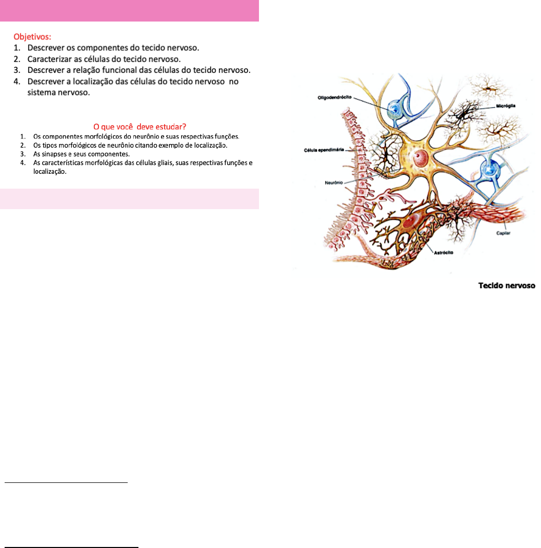 TECIDO NERVOSO E SISTEMA NERVOSO TECIDO NERVOSO O tecido nervoso é um dos principais componentes do sistema nervoso. Se analisarmos o sistema nervoso, percebo que esse sistema esta ligado a coordenação de atividades no organismo, ou seja, ele consegue receber informação, codificar essa informação e enviar uma resposta. Ex: a visão – a visão esta diretamente ligada ao sistema nervoso, conseguimos enxergar, interpretar o que estamos enxergando e enviar uma resposta em relação aquilo que você esta vendo, e quem faz isso é o sistema nervoso. No sistema nervoso encontramos o tecido nervoso. Para que eu entenda como o tecido nervoso está distribuído no sistema nervoso preciso recordar a divisão anatômica do sistema nervoso, topograficamente como ele esta organizado. SISTEMA NERVOSO CENTRAL © Encéfalo © Medula espinal SISTEMA NERVOSO PERIFÉRICO © Nervos © Gânglios © Terminações nervosas No encéfalo, na medula, nos nervos, gânglios e terminações nervosas eu encontro elementos do tecido nervoso. Na região do crânio temos o encéfalo, saindo da base do crânio temos a medula espinhal, saindo do encéfalo e medula espinhal temos nervos e no meio do caminho gânglios nervosos e na extremidade encontramos terminações nervosas = são nessas estruturas que eu tenho tecido nervoso. Quando eu falo de um receptor sensorial estou falando de um componente do tecido nervoso, esse receptor sensorial que é componente do tecido nervoso ele faz parte de um órgão, por exemplo da pele. Toda vez que eu olhar o SNC e o SNP vou encontrar elementos que tem em sua constituição o tecido nervoso. Quando olhamos para o tecido nervoso o que nos chama a atenção é essa célula que chamamos de neurônio ou célula nervosa. Do ponto de vista funcional essa célula representa a unidade funcional do tecido nervoso. Temos as atividades relacionadas com a coordenação, com a recepção, processamento da informação que está ligada ao neurônio. Ex: quando falo que eu tenho algum objeto tocando sob a pele, tenho a parte sensorial e quem percebeu isso foram estruturas do neurônio. A informação esta se propagando até o SNC para que eu identifique que tipo de objeto é esse e quem fez essa propagação foi o neurônio. Lá no SNC temos uma identificação desse objeto, quem faz essa identificação é o neurônio. Quando falamos em neurônio estamos falando em unidade funcional do tecido nervoso. Consequentemente unidade funcional do sistema nervoso. PARA O NEURÔNIO FUNCIONAR PRECISO DE CÉLULAS QUE NÃO SÃO CÉLULAS NERVOSAS, SÃO CHAMADAS CÉLULAS GLIAIS OU CÉLULAS DA GLIA OU NEUROGLIA: O oligodendrócito por exemplo, esta no tecido nervoso, mas ele não é uma célula nervosa. Vamos ver que o papel dele esta ligado a produção da bainha de mielina e bainha de mielina esta diretamente ligada a propagação do impulso nervoso. Microglia ou microgliócito: vimos que temos o macrófago que é uma célula fagocitária apresentadora de antígeno, o microgliócito faz a mesma coisa, posso dizer que a célula da microglia ou microgliócito é responsável pela defesa do tecido nervoso, é essa célula que reconhece o elemento estranho, fagocita e desencadeia resposta imunológica, ativa o sistema imunológico. Astrócito: ele vai ficar entre o vaso sanguíneo e o neurônio, ele vai formar uma barreira que é chamada de barreira hematoencefálica, é ele quem faz a transferência de substancias do vaso para o neurônio, é ele quem faz o intercambio entre o vaso sanguíneo e o neurônio. RETOMANDO, OLIGODENDRÓCITO, MICROGLIÓCITO, ASTRÓCITO NÃO SÃO CÉLULAS NERVOSAS, MAS SÃO ENCONTRADAS NO TECIDO NERVOSO. Além dessas 3 células vai aparecer uma outra que reveste as cavidades do SNC, lembrando que na medula tem o canal central da medula, no encéfalo encontramos os ventrículos que são cavidades, essas cavidades são revestidas pelas células ependimares e essas células ependimares formam uma barreira entre o liquido cefalorraquidiano que circula dentro das cavidades e o tecido nervoso. Falou em tecido nervoso, temos a célula nervosa que é a nossa unidade funcional, é a célula que é responsável pelas atividades do sistema nervoso. Só que para ela funcionar eu preciso de um conjunto de células acessórias que são as chamadas células gliais ou neuroglios. NEURÔNIO Quando falo em neurônio estou falando na unidade funcional do tecido nervoso. Essa célula tem um aspecto morfológico estrelar, ela possui vários prolongamentos citoplasmáticos, esses prolongamentos citoplasmáticos vão receber nomes particulares, podem ser chamados de dendritos ou axônio, tudo vai depender do que nós temos na extremidade. Se eu olhar na extremidade do axônio vou encontrar uma estrutura que recebe o nome de botão terminal/telodendro. Quando olho nos dendritos essa estrutura (botão terminal) não aparece. A presença do botão terminal vai dizer para nós que esse prolongamento é o axônio e que ele vai ser responsável pela propagação do impulso nervoso do neurônio para uma célula seguinte. Ex: se tenho uma lesão na mão, tendo a tirar a mão do lugar que está provocando essa lesão, quem estimula a contração muscular é o sistema nervoso - mas quem do sistema nervoso vai estar ligado com a fibra muscular para que a fibra muscular seja estimulada? O axônio, pois aqui dentro tem estruturas chamadas de vesículas sinápticas, é aqui dentro dessas vesículas sinápticas que encontro os neurotransmissores. Podemos falar com segurança que o axônio ele é especializado na propagação, condução do estímulo do impulso nervoso. Agora, quando olho para os dendritos encontro prolongamentos de membrana e esses prolongamentos de membrana aumentam a superfície de contato do neurônio com o MEC, eles aumentam a superfície de contato da célula nervosa com o meio externo. Podemos falar que os dendritos são especializados na recepção do estímulo que vai gerar o impulso nervoso.