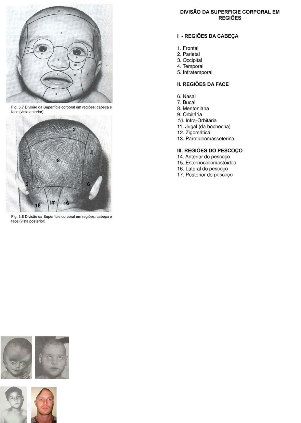 Exame físico de cabeça e pescoço Há presença de gânglios na região pré-auricular, retro-auricular, mentoniana, submandibular cervical anterior e posterior e subclavicular. Ao examinar cabeça, atentar-se: • Forma e tamanho; • Deformações localizadas; • Depressões; • Posição e movimentos; • Couro cabeludo (investigar alopecia); • Inspeção geral da face; • Inspeção das sobrancelhas, pálpebras, conjuntiva, olhos e pavilhão auricular. Macrocefalia, desvio de olhar. 2- Crânio assimétrico com depressão no hemisfério direito (craniectomia) Couro cabeludo • Tipo de implantação: mais baixa em mulheres e ‘’entradas’’ laterais em homens; • Sobre a distribuição: alopecia e calvície; • Analisar também a quantidade, buscando lesões, descamações ou nódulos. Cavidade oral e nariz • Analisar: lábios, mucosa oral, suco vestibular, gengiva, língua, dentes, glândulas salivares e articulação temporomandibular. • Saliva: 15 ml/hora. • Buscar por lesões e ulcerações; analisar as tonsilas (hipertrofia, pus); caída do palato mole (sinal da cortina – ocorre em acometimento do IX/X par craniano). • Lábios: alterações de cor, forma, fissura, lesões, palpar textura, consistência e flexibilidade; • Língua: movimentação, lesões, tamanho, sempre analisando todas as superfícies (lateral, dorso, base e ventral); • ATM: abertura e fechamento da boca (35-55mm), palpando pré-tragus ou pós-tragus (rotação, ruídos, uniformidade, dor); • Nariz: as fossas nasais constituem o segmento inicial da árvore respiratória, comunicando-se com o exterior através das narinas, revestidas pela membrana de Schneider. • Seios paranasais: cavidades preenchidas por ar situadas nos ossos do crânio. Pescoço • Analisar forma, contraturas, deformidades, ausculta carotídea, gânglios, tireoide, parótida, paratireoides, secreção e fístula; • Ausculta de sopro na carótida pode ser prognóstico de AVC; • Gânglios: localização, tamanho ou volume, consistência, mobilidade, sensibilidade, alterações da pele e outros locais; • Tireoide Inspeção: normalmente não é visualizada, estender a cabeça e deglutir Palpação: posterior (paciente sentado, mão direita apalpa lobo esquerdo afastando o es- ternocleidomastoideo) e anterior (paciente sentado ou em pé, polegar palpa a glândula e outros dedos se fixam na regiõo supraclavicular Em casos de tireotoxicose, realizar a ausculta. Orelha Técnicas do exame Deve ser realizado em ambiente silencioso e bem iluminado, com o auxílio de um otoscópio. Inspeção e palpação do pavilhão auricular: buscar palpações e tumorações. Caso o paciente queixe de otalgia: Otoscopia: usar o maior espéculo que o meato acomodar, segurar firme o pavilhão auricular, tracionando-o para cima e para trás. Introduzir o espéculo direcionando-o um pouco para baixo e para frente.