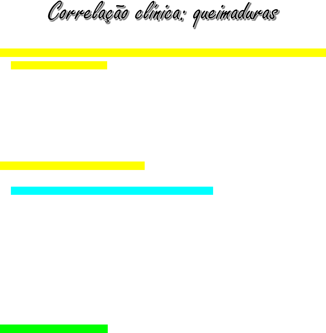 1. CARACTERIZAÇÃO DA QUEIMADURA + DIFERENÇAS ENTRE AS QUEIMADURAS E OUTROS TIPOS DE LESÕES ❖ Elas se caracterizam pela ação direta ou indireta de calor sobre o corpo, em razão do contato com chamas, líquidos aquecidos, frio extremo, substâncias químicas, corrente elétrica e radiação; ❖ A diferença entre as queimaduras e outros tipos de lesões são as consequências que elas podem provocar, uma vez que a progressão da queimadura está intimamente relacionada com a extensão da sua resposta inflamatória (ou seja, quanto mais profunda a queimadura, maior o processo inflamatório do indivíduo acometido). 2. CLASSIFICAÇÃO DAS QUEIMADURAS 2.1 DE ACORDO COM A PROFUNDIDADE DA QUEIMADURA ➢ Assim, podemos classificar a queimadura de duas maneiras. A primeira maneira é de acordo com o grau da sua profundidade, levando em consideração que efeitos fisiopatológicos e metabólicos das queimaduras podem atingir as camadas da epiderme, derme e/ou subcutâneo nessas situações de trauma, podendo ser: a) Queimadura de primeiro grau, quando atinge a epiderme; b) Queimadura de segundo grau, podendo ser superficial ou profunda. Nas superficiais, acomete-se a epiderme e o terço superior da derme, enquanto nas profundas atinge-se a epiderme e a derme; c) Queimadura de terceiro grau: a pele é totalmente destruída, incluindo a epiderme, a derme e o subcutâneo, podendo atingir ossos, articulações e cavidades. OBSERVAÇÃO: SOBRE A PELE ✓ A pele íntegra reveste o corpo humano protegendo contra agressões externas (como fungos, bactérias e fatores ambientais), e é responsável por múltiplas funções como a homeostase e o controle da perda de líquidos e eletrólitos e a termorregulação; ✓ De um modo geral, em pequenas lesões, a queimadura pode acometer exclusivamente o tegumento cutâneo, com alterações relacionadas à fisiopatologia da cicatrização e mínimas repercussões ao organismo. Porém, em lesões mais extensas e profundas, pode acarretar a perda das funções principais do tegumento e o surgimento de mecanismos de resposta inflamatória sistêmica com choque hipovolêmico, insuficiência de múltiplos órgãos e óbito, nos casos mais extremos. ✓ A pele é formada por três camadas sobrepostas, a epiderme, a derme e a hipoderme: a) Epiderme é a camada mais superficial, que forma uma barreira protetora sobre o corpo; b) Derme é a camada intermediária da pele, que confere tonicidade, elasticidade e equilíbrio à pele pela presença das fibras de colágeno, elastina e gel coloidal; c) Hipoderme ou subcutâneo é um tecido grosso subcutâneo formado por células de gordura, responsável pelo deslizamento da pele sobre as estruturas onde se apoia. ✓ Assim, o trauma provocado pela queimadura resulta em efeitos fisiopatológicos e metabólicos nessas camadas; ✓ Diante disso, as queimaduras podem ser classificada nas maneiras mencionadas acima; ✓ Algumas literaturas consideram as queimaduras de quarto grau, quando, além de acometer todas as camadas da pele, ossos, articulações e cavidades, também costumam deixar a vítima carbonizada; ✓ Nomes das áreas das queimaduras: a) Área de coagulação: ao centro, área de contato com o agente da queimadura; b) Área de estase: adjacente à área de contato, apresenta perfusão sanguínea reudizda; c) Área de hiperemia: aumento local da perfusão. 2.2 DE ACORDO COM A SUPERFÍCIE CORPORAL ATINGIDA ➢ A outra maneira de classificar a queimadura é de acordo com a porcentagem de superfície corpórea atingida com o trauma, levando em consideração a área total queimada. Assim, dividindo anatomicamente as regiões corporais, cada uma delas corresponde a um percentual queimado, diferindo- se quantitativamente entre adultos e crianças; a) Num adulto: a cabeça corresponde a 9% da área queimada, sendo 4,5% para a face anterior e 4,5% para a face posterior; um braço corresponde a 9%, sendo 4,5% para cada face e totalizando 18% para os dois braços; uma perna corresponde a 18%, sendo 9% cada face e totalizando 36% para ambas as pernas; o tórax corresponde a um total de 36%, sendo 18% para cada face e 9% para cada face superior e inferior. Por fim, a região do períneo corresponde a 1%; b) Nas crianças: para as crianças, o tamanho da cabeça dobra, correspondendo a 18% da área queimada, sendo 9% para cada face e, além disso, o tamanho da perna também se altera, sendo 13,5% para cada perna, totalizando 27% ambas as pernas. As outras regiões apresentam os mesmos valores percentuais para adultos e crianças. ➢ Para os adultos, as grandes queimaduras ocorrem quando esse percentual é superior a 30%, enquanto, nas crianças, superior a 20%. Essas grandes queimaduras podem ser associadas a fraturas ou lesões graves dos tecidos moles, podendo ser decorrentes, principalmente de queimaduras elétricas e queimaduras químicas profundas, podendo afetar o paciente com outras doenças subjacentes, como a cardiopatia. 3. MANIFESTAÇÕES DAS QUEIMADURAS ❖ As queimaduras podem se manifestar de duas maneiras no corpo, tanto de maneira local, como de maneira sistêmica, quando afetam múltiplos órgãos. 3.1 MANIFESTAÇÕES LOCAIS ➢ No caso das manifestações locais, podemos observar: a) A ausência de sudorese; b) Dores intensas, que podem progredir para uma manifestação sistêmica (o choque); c) Destruição de tecidos; d) Escara (tecido duro e morto causado por queimaduras profundas), cicatrizes e contraturas (resultados da cura de queimaduras profundas. Dependendo da extensão da queimadura, deformidades por contratura podem aparecer nas articulações. Se a queimadura estiver próxima às articulações, a função pode ser gravemente comprometida; e) A perda de líquidos corporais também pode ocorrer; f) Em resposta à lesão térmica, também ocorre liberação de agentes vasoativos (como a histamina, a serotonina, a bradicina e os leucotrines, que são fatores ativadores de plaquetas → mediador