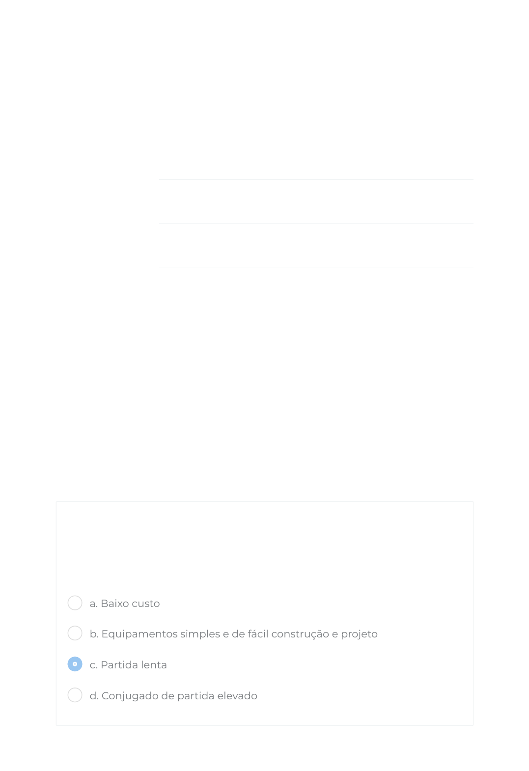 Painel / Minhas Disciplinas / 20A101 / Aula 05 - CHAVES DE PARTIDA / Atividade 05 Acionamentos Elétricos Iniciado em sexta, 6 Ago 2021, 00:07 Estado Finalizada Concluída em sexta, 6 Ago 2021, 00:20 Tempo empregado 13 minutos 13 segundos Avaliar 10,00 de um máximo de 10,00(100%) Questão 1 Correto Atingiu 1,00 de 1,00 Fazem parte das vantagens de uma chave de partida direta exceto: Escolha uma opção: a. Baixo custo b. Equipamentos simples e de fácil construção e projeto c. Partida lenta d. Conjugado de partida elevado https://ava.politecnicabr.com.br/my/ https://ava.politecnicabr.com.br/course/view.php?id=935 https://ava.politecnicabr.com.br/course/view.php?id=935#section-6 https://ava.politecnicabr.com.br/mod/quiz/view.php?id=26387 https://ava.politecnicabr.com.br/ Questão 2 Correto Atingiu 1,00 de 1,00 Esse diagrama de força abaixo pertence a qual tipo de partida? Escolha uma opção: a. partida estrela-triângulo b. partida direta c. partida com reversora d. partida compensadora https://ava.politecnicabr.com.br/ Questão 3 Correto Atingiu 1,00 de 1,00 A partida estrela-triangulo consiste na alimentação do motor com um amento de tensão nas bobinas durante a sua partida. Escolha uma opção: Verdadeiro Falso https://ava.politecnicabr.com.br/ Questão 4 Correto Atingiu 1,00 de 1,00 Esse diagrama de comando abaixo pertence a qual tipo de partida? Escolha uma opção: a. partida estrela-triângulo b. partida com reversora c. partida compensadora d. partida direta https://ava.politecnicabr.com.br/ Questão 5 Correto Atingiu 1,00 de 1,00 A partida direta é a forma mais simples de partir um motor elétrico, na qual as três fases são ligadas diretamente ao motor, ocorrendo um pico de corrente. Escolha uma opção: Verdadeiro Falso https://ava.politecnicabr.com.br/ Questão 6 Correto Atingiu 1,00 de 1,00 Esse diagrama de força abaixo pertence a qual tipo de partida? Escolha uma opção: a. partida direta b. partida com reversora c. partida estrela-triângulo d. partida compensadora https://ava.politecnicabr.com.br/ Questão 7 Correto Atingiu 1,00 de 1,00 Na partida direta, a corrente de partida é inversamente proporcional à tensão de alimentação e aumenta à medida que a velocidade diminui. Escolha uma opção: Verdadeiro Falso https://ava.politecnicabr.com.br/ Questão 8 Correto Atingiu 1,00 de 1,00 Esse diagrama de comando abaixo pertence a qual tipo de partida? Escolha uma opção: a. partida compensadora b. partida estrela-triângulo c. partida direta d. partida com reversora https://ava.politecnicabr.com.br/ Questão 9 Correto Atingiu 1,00 de 1,00 Esse diagrama de comando abaixo pertence a qual tipo de partida? Escolha uma opção: a. partida compensadora b. partida estrela-triângulo c. partida com reversora d. partida direta https://ava.politecnicabr.com.br/ Questão 10 Correto Atingiu 1,00 de 1,00 Esse diagrama de força abaixo pertence a qual tipo de partida? Escolha uma opção: a. partida compensadora b. partida com reversora c. partida estrela-triângulo d. partida direta https://ava.politecnicabr.com.br/ © 2020 - Escola Politécnica Brasileira Entre em Contato https://www.politecnicabr.com.br 0800 084 2627 indisponível devido a pandemia de COVID-19, use outro canal! 0800 084 2627 comercial@politecnicabr.com.br Links Úteis Dicas da nossa Diretora Acadêmica Planner de Estudos Declaração de Matrícula Orientações do AVA Abertura de Ticket Fale com o Tutor Cronograma de Estudos Manual de Estágio Manual de Competência Siga-nos nas redes sociais https://ava.politecnicabr.com.br/mod/quiz/0 https://www.politecnicabr.com.br/ mailto:comercial@politecnicabr.com.br https://soundcloud.com/user-501638417/sets/escola-politecnica-brasileira https://storage.googleapis.com/sirius-pubstore/semestre_plannerdeestudo%20poli.pdf https://storage.googleapis.com/sirius-pubstore/declaracao_matricula.pdf https://storage.googleapis.com/sirius-pubstore/orientacoes_ava.pdf https://storage.googleapis.com/sirius-pubstore/abertura_ticket.pdf https://storage.googleapis.com/sirius-pubstore/fale_com_tutor.pdf https://storage.googleapis.com/sirius-pubstore/cronograma_estudos.pdf https://storage.googleapis.com/sirius-pubstore/manual_estagio.pdf https://storage.googleapis.com/sirius-pubstore/manual_competencia.pdf https://www.facebook.com/politecnicabr https://www.instagram.com/politecnicabr_oficial https://ava.politecnicabr.com.br/