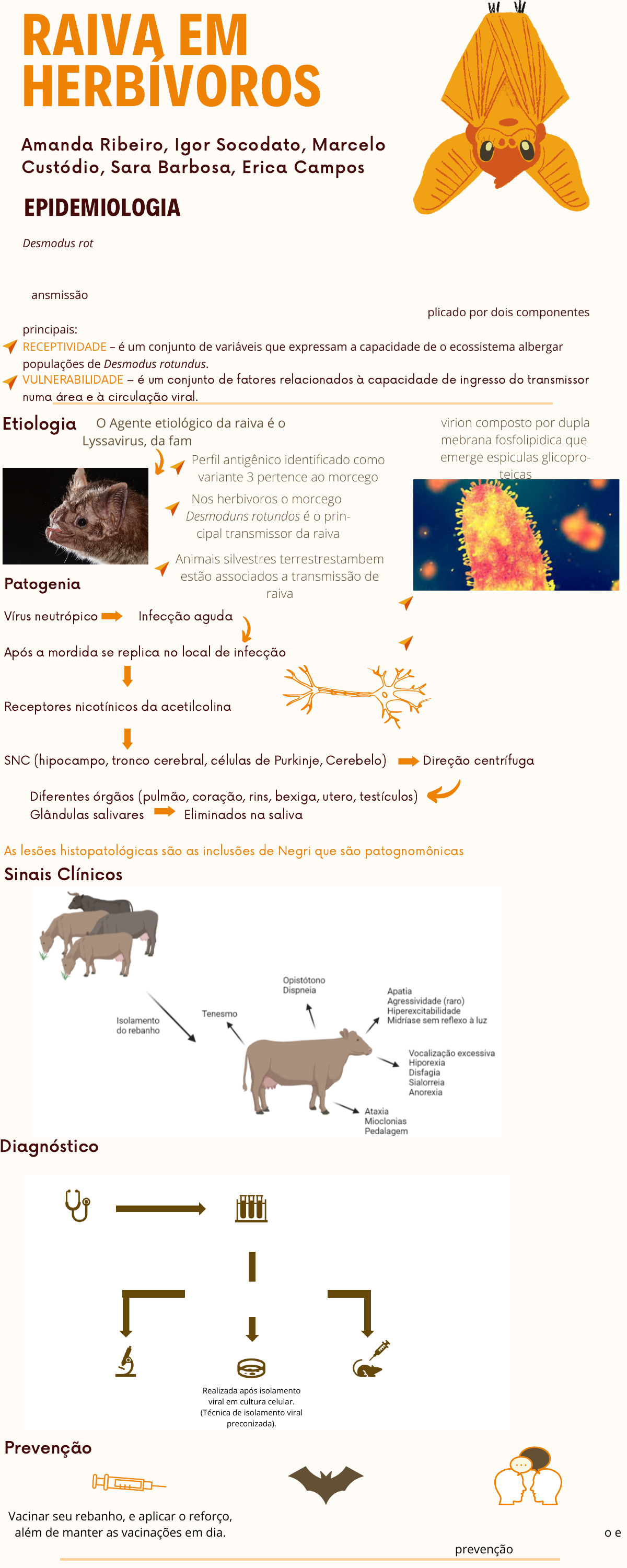 Patogenia As lesões histopatológicas são as inclusões de Negri que são patognomônicas Vírus neutrópico Infecção aguda Após a mordida se replica no local de infecção Receptores nicotínicos da acetilcolina SNC (hipocampo, tronco cerebral, células de Purkinje, Cerebelo) Direção centrífuga Diferentes órgãos (pulmão, coração, rins, bexiga, utero, testículos) Glândulas salivares Eliminados na saliva Etiologia Sinais Clínicos Diagnóstico Nos herbivoros o morcego Desmoduns rotundos é o prin- cipal transmissor da raiva virion composto por dupla mebrana fosfolipidica que emerge espiculas glicopro- teicas Animais silvestres terrestrestambem estão associados a transmissão de raiva Perfil antigênico identificado como variante 3 pertence ao morcego Prevenção Vacinar seu rebanho, e aplicar o reforço, além de manter as vacinações em dia. Realizada após isolamento viral em cultura celular. (Técnica de isolamento viral preconizada). RAIVA EM HERBÍVOROS Amanda Ribeiro, Igor Socodato, Marcelo Custódio, Sara Barbosa, Erica Campos VULNERABILIDADE – é um conjunto de fatores relacionados à capacidade de ingresso do transmissor numa área e à circulação viral. Desmodus rotundus: esses herbívoros são hospedeiros acidentais do vírus da raiva, pois, apesar de participar da cadeia epidemiológica da raiva rural, somente contribuem como sentinelas à existência de vírus. Sua participação nesse processo restringe-se ao óbito do animal, não havendo envolvimento no processo de transmissão a outras espécies, salvo quando de forma acidental. Dadas as características da interação do D. rotundus com o meio ambiente, o risco da raiva nos herbívoros pode ser explicado por dois componentes principais: RECEPTIVIDADE – é um conjunto de variáveis que expressam a capacidade de o ecossistema albergar populações de Desmodus rotundus. EPIDEMIOLOGIA O Agente etiológico da raiva é o Lyssavirus, da família Rhabdoviridae Diagnóstico laboratorial Conclusivo apenas com amostras post mortem preferencialmente amostras do SNC. Sinais clínicos compatíveis suspeita clínica. Teste de imunofluorescência indireta (IFD) Identifica o antígeno viral. Realizado diretamente em impressões teciduais em lâmina de microscopia. Realizada em isolamento viral em camundongo. Camundongos jovens são inoculados intracerebralmente , sacrificados 5,7,9,11 dias após a inoculação e examinados através do IFD. morfologia caracteristica bala de revolver filamento único de RNA negativo Manter o controle das colônias de morcegos hematófagos Orientar aos produtores locais sobre a importância da vacinação e prevenção contra a raiva