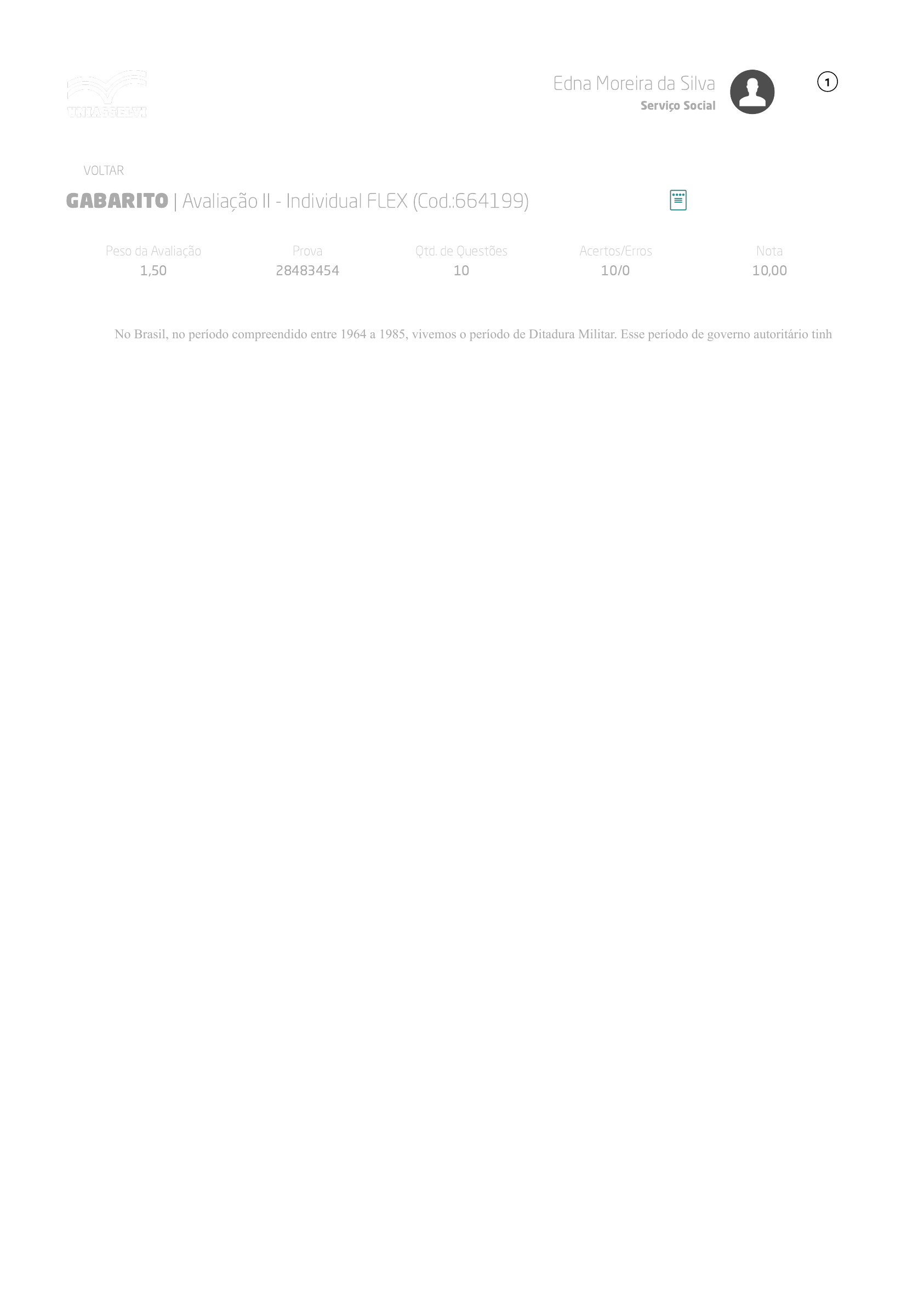 06/08/2021 AVA https://ava2.uniasselvi.com.br/subject/grades-and-tests/answer-book/eyJ0ZXN0Ijp7InRlc3RDb2RlIjoiNjY0MTk5IiwiZGVzY3JpcHRpb24iOiJBdmFsaWHn428gSUkgLSBJbmRpdmlkdWFsIEZMRVggIiwicGFyYW1ldGVy… 1/4 GABARITO | Avaliação II - Individual FLEX (Cod.:664199) Peso da Avaliação 1,50 Prova 28483454 Qtd. de Questões 10 Acertos/Erros 10/0 Nota 10,00 No Brasil, no período compreendido entre 1964 a 1985, vivemos o período de Ditadura Militar. Esse período de governo autoritário tinha por objetivo criar estratégias para que o regime se fortalecesse e que perdurasse no poder. Com relação a isso, associe os itens, utilizando o código a seguir: I- 1964 a 1966. II- 1967 a 1969. III- 1970 a 1973. IV- 1974 a 1985. ( ) Presidente Ernesto Geisel e João Figueiredo iniciam o processo de abertura política. ( ) Presidente Castelo Branco assume instituindo um modelo autoritário e rompendo com a prática populista de governos anteriores. ( ) Presidente Costa e Silva, reafirmando o modelo autoritário. ( ) Presidente Emílio Garrastazu Médici, quando o modelo autoritário avançou o ápice da repressão. Assinale a alternativa que apresenta a sequência CORRETA: A III - IV - I - II. B I - II - IV - III. C IV - II - III - I. D IV - I - II - III. Diversas transformações marcaram o início do século XX, caracterizadas pelas lutas de classe que buscavam a garantia de direitos e cidadania. No entanto, neste processo de industrialização e urbanização, algumas instituições sociais foram enfraquecidas, devido às exigências postas pelo trabalho industrial. Classifique V para as sentenças verdadeiras e F para as falsas: ( ) As instituições sociais que foram enfraquecidas por esse processo foram principalmente a família, a igreja, escolas e a comunidade. ( ) As instituições sociais que foram enfraquecidas por esse processo foram as ONGs, as indústrias e fábricas que empregavam os trabalhadores vindos do meio rural. ( ) Os problemas sociais da época foram gerados pela população que não tinha um planejamento social, pois recebiam altos salários nas fábricas e tinham as políticas públicas como apoio para resolução das questões sociais. ( ) O processo de urbanização descontrolado e as más condições de trabalho foram alguns dos motivos causadores dos problemas sociais da época. Agora, assinale a alternativa que apresenta a sequência CORRETA: A V - F - F - V. B V - V - F - V. C F - F - V - V. D F - V - V - F. VOLTAR Alterar modo de visualização 1 2 Edna Moreira da Silva Serviço Social 1 06/08/2021 AVA https://ava2.uniasselvi.com.br/subject/grades-and-tests/answer-book/eyJ0ZXN0Ijp7InRlc3RDb2RlIjoiNjY0MTk5IiwiZGVzY3JpcHRpb24iOiJBdmFsaWHn428gSUkgLSBJbmRpdmlkdWFsIEZMRVggIiwicGFyYW1ldGVy… 2/4 O modelo capitalista é um sistema econômico que estabelece a dinâmica de um movimento de produção e reprodução social, expressos na forma de relações de dominação e exploração. Nesse sentido, podemos entender que o modelo capitalista pode ser: A Um sistema no qual o trabalhador é pago pelo seu trabalho, de acordo com o que o dono do capital considera apropriado, não lhe oferecendo condições de usufruir o que produz. B Um sistema de dominação entre o dono do capital e o trabalhador, no qual há uma divisão de toda a riqueza produzida. C Um sistema de mediação entre o dono do capital e o trabalhador, no qual há uma socialização da riqueza produzida. D Um sistema de dominação do trabalhador ao dono do capital, o qual exige que sejam pagos seus capitais, conforme produz. A Consolidação das Leis do Trabalho foi um conjunto de regras criadas para proteger o trabalhador. A lei que estabelece a CLT foi criada em 1º de maio 1943, mas as normas em favor do trabalhador começaram ainda no início do governo de Getúlio Vargas, nos anos 30. Getúlio Vargas ficou conhecido como o pai dos pobres. Diante disso, classifique V para as sentenças verdadeiras e F para as falsas: ( ) A legislação trabalhista criada por Vargas contemplava aposentadoria, férias e descanso mensal opcional. ( ) A Era Vargas, compreendida entre 1930-1945 e 1950-1954, foi predominantemente um período autocrático e ditatorial. ( ) Através da consolidação da legislação trabalhista institui-se a implementação de um salário mínimo e uma série de benefícios. ( ) Entre os principais benefícios da legislação trabalhista, estão: férias remuneradas, descanso semanal, aposentadoria. Assinale a alternativa que apresenta a sequência CORRETA: A F - F - F - F. B V - V - F - V. C V - V - V - F. D F - V - V - V. No Estado Neoliberal, o governo não tem a intenção de proteger a sociedade, tendo reflexos principalmente na formulação das políticas sociais. Sobre Neoliberalismo, classifique V para as sentenças verdadeiras e F para as falsas: ( ) O período Neoliberal apresentou implicações entre o Estado e a Sociedade, enfraquecendo os movimentos sociais da época. ( ) O Neoliberalismo iniciou nos Estados Unidos, depois na Europa e finalmente em países da América Latina. ( ) No Neoliberalismo, as pessoas têm liberdade para usufruir dos produtos e serviços conforme sua situação financeira. ( ) No Neoliberalismo, o Estado reproduz as características das relações sociais e econômicas produzidas pelo capitalismo. Assinale a alternativa que apresenta a sequência CORRETA: A V - V - F - V. B F - F - V - V. C F - V - V - F. D V - F - V - V. O Estado de bem-estar social ou Welfare State é conhecido como um modelo de governo no qual o mesmo se compromete e procura garantir o bem estar econômico e social da população, através de políticas públicas e um sistema de garantia de direitos. Diante disso, analise as sentenças a seguir: I- As primeiras origens do Estado de Bem-Estar Social podem ser encontradas no final do século XIX. II- A concentração industrial nos grandes centros urbanos estimulou a organização de trabalhadores. III- O Welfare State é um sistema de governo a