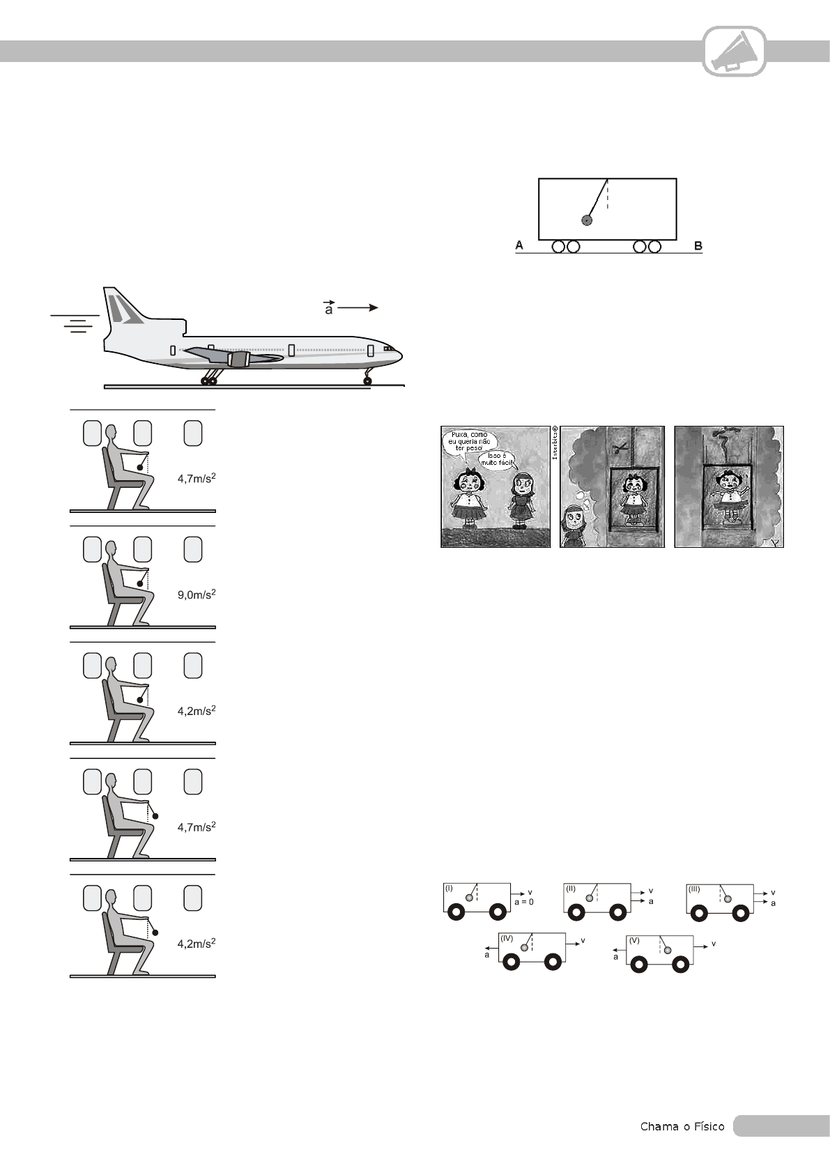 REFERENCIAL NÃO-INERCIAL QUESTÃO 01 ============================= (Unesp) Num jato que se desloca sobre uma pista horizontal, em movimento retilíneo uniformemente acelerado, um passageiro decide estimar a aceleração do avião. Para isto, improvisa um pêndulo que, quando suspenso, seu fio fica aproximadamente estável, formando um ângulo = 25º com a vertical e em repouso em relação ao avião. Considere que o valor da aceleração da gravidade no local vale 10 m/s2, e que sen 25º 0,42; cos 25º 0,90; tan 25º 0,47. Das alternativas, qual fornece o módulo aproximado da aceleração do avião e melhor representa a inclinação do pêndulo? a) b) c) d) e) QUESTÃO 02 ============================= (Uel) Um observador vê um pêndulo preso ao teto de um vagão e deslocado da vertical como mostra a figura a seguir. Sabendo que o vagão se desloca em trajetória retilínea, ele pode estar se movendo de a) A para B, com velocidade constante. b) B para A, com velocidade constante. c) A para B, com sua velocidade diminuindo. d) B para A, com sua velocidade aumentando. e) B para A, com sua velocidade diminuindo. QUESTÃO 03 ============================= (Unesp) Observe a tirinha Uma garota de 50 kg está em um elevador sobre uma balança calibrada em newtons. O elevador move-se verticalmente, com aceleração para cima na subida e com aceleração para baixo na descida. O módulo da aceleração é constante e igual a 2 m/s² em ambas situações. Considerando g = 10 m/s², a diferença, em newtons, entre o peso aparente da garota, indicado na balança, quando o elevador sobe e quando o elevador desce, é igual a a) 50. b) 100. c) 150. d) 200. e) 250. QUESTÃO 04 ============================= (Ufpa) Belém tem sofrido com a carga de tráfego em suas vias de trânsito. Os motoristas de ônibus fazem frequentemente verdadeiros malabarismos, que impõem desconforto aos usuários devido às forças inerciais. Se fixarmos um pêndulo no teto do ônibus, podemos observar a presença de tais forças. Sem levar em conta os efeitos do ar em todas as situações hipotéticas, ilustradas abaixo, considere que o pêndulo está em repouso com relação ao ônibus e que o ônibus move-se horizontalmente. Sendo v a velocidade do ônibus e a sua aceleração, a posição do pêndulo está ilustrada corretamente a) na situação (I). b) nas situações (II) e (V). c) nas situações (II) e (IV). d) nas situações (III) e (V). e) nas situações (III) e (IV). QUESTÃO 05 ============================= (Puccamp) No piso de um elevador é colocada uma balança graduada em newtons. Um menino, de massa 40kg, sobe na balança quando o elevador está descendo acelerado, com aceleração de módulo 3,0 m/s2, como representa a figura a seguir. Se a aceleração da gravidade vale 9,8 m/s2, a balança estará indicando, em N, um valor mais próximo de a) 120 b) 200 c) 270 d) 400 e) 520 GABARITO 01.A 02. E 03. D 04. B 05. C MATRICULE-SE NO CURSO DE FÍSICA MAIS COMPLETO DA INTERNET! http://www.chamaofisico.com.br http://www.chamaofisico.com.br/
