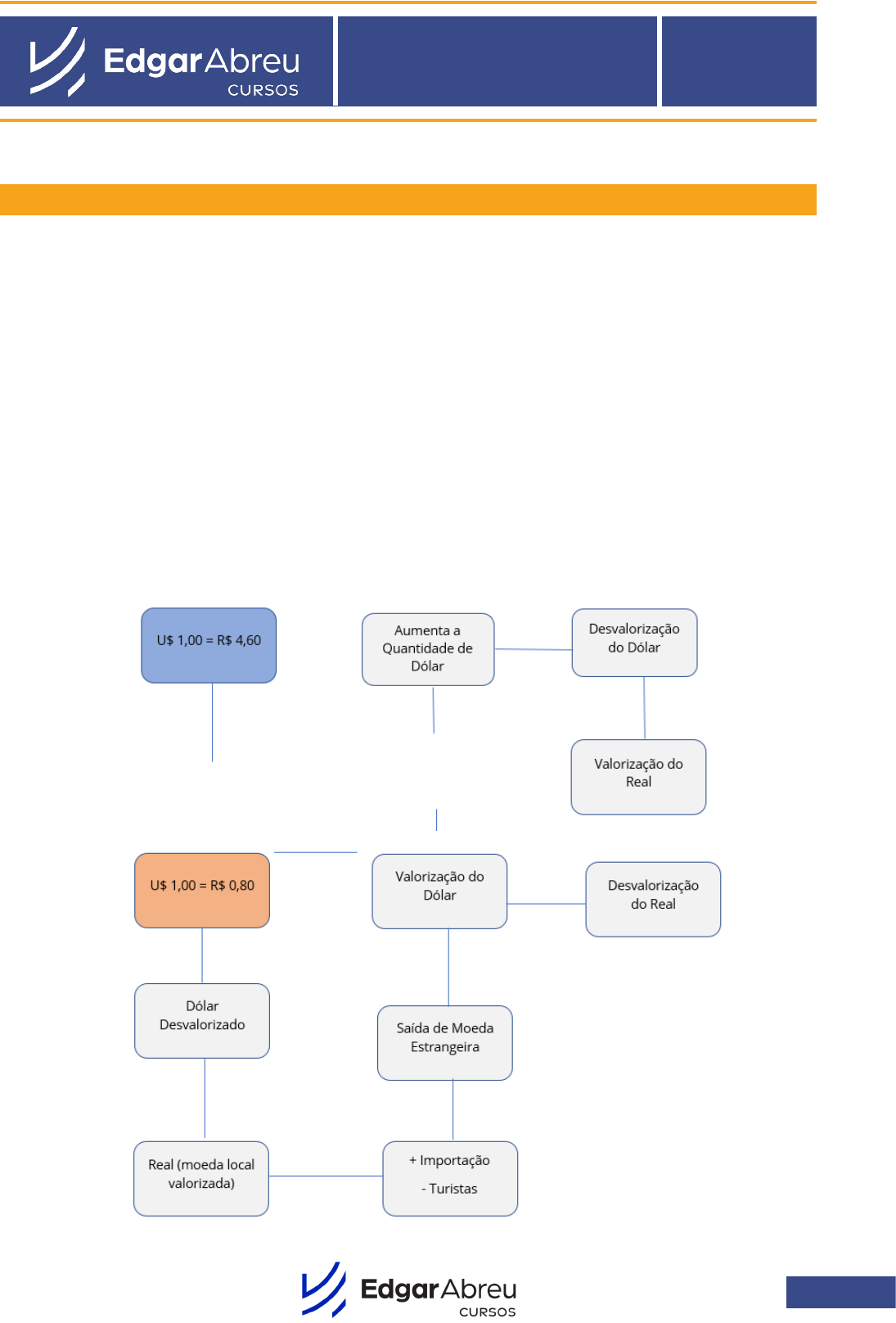 1 TAXA DE CÂMBIO - PTAX CPA-20 TAXA DE CÂMBIO: PTAX Fala cabeção! “Vem comigo” que nessa aula falaremos de Taxa de Câmbio. Você sabe o que isso significa? Sabe qual a nossa taxa de referência? Isso mesmo, a PTAX. • O que é a PTAX? • PTAX é a taxa de câmbio de referência do real, ou seja, a cotação oficial da moeda estran- geira. • Dois tipos de preço: valor de compra x valor de venda • Responsável pela divulgação: BACEN • E quanto a Valorização e Desvalorização Cambial? Vamos entender... 2 AULA EM PDF EXCLUSIVA PARA ALUNOS • E qual o papel do governo em relação a moeda do câmbio? Quando falamos do papel do governo, estamos nos referindo à Política Cambial que é um conjunto de ações exercidas pelo Banco Central destinadas a equilibrar o funcionamento da economia atra- vés de alterações das taxas de câmbio e do controle das operações cambiais, ou seja, controlar o preço da moeda estrangeira. Sabemos que hoje o preço de tudo é feito pela Lei da Oferta e da Procura, ou seja, é o mercado que determina a taxa de câmbio. Mas e se o preço do câmbio fosse Fixo, o que isso significaria? → Ter um preço fixo significaria garantir a quantidade fixa de compra, mesmo que isso signifique comprar o excesso que não foi vendido. No cenário atual do país, com o Câmbio Flutuante, ou seja, sem taxa fixa, podem acontecer oscila- ções contidas pelas autoridades monetárias – Banco Central. O que isso significa? Significa que: → Se o Governo disser que nossa Política Cambial é perfeitamente flutuante – flutuação limpa – a autoridade está proibida de entrar. Nesse caso, qual a desvantagem quando o BACEN não entra: se houver uma oscilação, será realmente GRANDE. → Já quando o BACEN tem autonomia – flutuação suja – situação imperfeita, o Banco Central en- tra e torna as grandes oscilações mais suaves. O impacto não é tão grande. Agora vamos pensar no cenário com saída de moeda estrangeira – importação e turismo – temos um efeito contrário, não é mesmo? Pois a quantidade de moeda estrangeira vai diminuir. E o que acontece com o preço quando há menos oferta de um determinado produto? AUMENTA! Logo, o preço da moeda estrangeira valoriza e o real desvaloriza. Se for uma Oscilação Flutuante – como é a nossa – o BACEN pode intervir, mas dessa vez ao contrário, pois ele vai repor o que saiu, a chama- da Reserva Internacional. • E o que seria essa Reserva Internacional? • Depósitos em moeda estrangeira dos bancos centrais e autoridades monetárias. • A maior parte destas reservas, e dos demais países emergentes, está alocada em títulos públicos do Tesouro Norte Americano; outra parte relevante das reservas está alocada em Euro. Ou seja... 3 AULA EM PDF EXCLUSIVA PARA ALUNOS Em países com alto índices de reservas internacionais é considerado um país com maior condição de responder a crises econômicas. Para países emergentes, como o Brasil, é fundamental ter reser- vas volumosas para atrair investidores estrangeiros RESUMO Câmbio Fixo Câmbio Flexível (Flutuante) Características BC fixa a taxa de câmbio; BC é obrigado a disponibilizar reservas cambiais. O mercado determina a taxa de câmbio; BC não é obrigado a disponibilizar reservas cambiais. Vantagens Maior controle da inflação (custos das importações). Política monetária mais independente do câmbio; Reservas cambiais protegidas de ataques especulativos. Desvantagens Reservas cambiais vulneráveis a ataques especulativos; A política monetária (taxa de juros) fica dependente do volume de reservas cambiais. Taxa de câmbio fica muito dependente da volatilidade do mercado financeiro nacional e internacional; Maior dificuldade de controle das pressões inflacionárias, devido à desvalorização cambial. FOCO PARA A PROVA! • PTAX = Taxa Oficial de Câmbio • Política Cambial – 3 tipos Fixa; Flutuante e Flutuante com Intervenção (Suja) • Responsável? Banco Central.