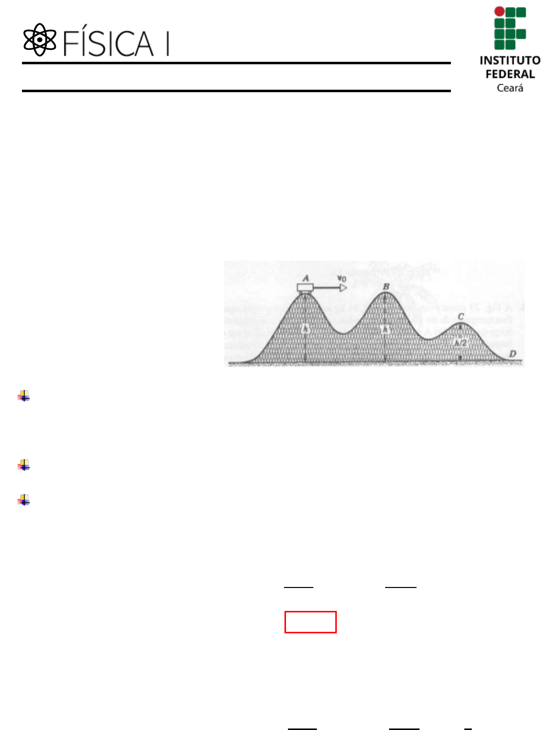 Conservação de Energia Monitora: Marina B. de Lima Professor Orientador: Marcus V. P. Lopes ➢ Um carro de montanha russa, sem atrito, parte do ponto A, como mostra na figura, com velocidade v0. Calcule a velocidade do carro: a) No ponto B. b) No ponto C. c) No ponto D. Obs: suponha que o carro possa ser considerado uma partícula e que permaneça o tempo todo no trilho. Para resolução da questão, considera-se que o sistema é conservativo, como a força peso (que realiza trabalho) é conservativa. Portanto, pode-se aplicar o princípio da conservação da energia mecânica. Vamos supor que na base da montanha russa a energia potencial gravitacional é zero (Ug = 0). Como o ponto A e o ponto B estão a uma mesma altura h, não há variação de energia potencial. A energia mecânica (E) de um sistema é a soma da energia cinética (K) com a energia potencial (U): E = K + U. a) Em um sistema conservativo, a energia mecânica (E) se conserva, logo, EA = EB. 𝐾𝐴 + 𝑈𝑔𝐴 = 𝐾𝐵 + 𝑈𝑔𝐵 → 𝑚𝑣0 2 2 +𝑚𝑔ℎ = 𝑚𝑣𝐵 2 2 +𝑚𝑔ℎ Logo, ao cancelar os termos equivalentes: VB = V0 b) Nesse caso, a altura do ponto C equivale a h/2, mesmo assim, há a conservação da energia mecânica. EA = EC 𝐾𝐴 + 𝑈𝑔𝐴 = 𝐾𝐶 + 𝑈𝑔𝐶 → 𝑚𝑣0 2 2 +𝑚𝑔ℎ = 𝑚𝑣𝐶 2 2 +𝑚𝑔 ℎ 2 Ao multiplicar a equação por 2 e cancelar as massas, pode-se resultar na equação a seguir: Exercício resolvido 06 – Conservação de Energia 𝑣0 2 + 2𝑔ℎ = 𝑣𝑐 2 + 𝑔ℎ 𝑣𝑐 = √𝑣0 2 + 𝑔ℎ c) Neste caso, a altura D é zero, assim: 𝐾𝐴 + 𝑈𝑔𝐴 = 𝐾𝐷 + 𝑈𝑔𝐷 → 𝑚𝑣0 2 2 +𝑚𝑔ℎ = 𝑚𝑣𝐷 2 2 Multiplicando toda a equação por 2 e cancelando as massas nos termos: 𝑣0 2 + 2𝑔ℎ = 𝑣𝐷 2 → 𝑣𝐷 = √𝑣0 2 + 2𝑔ℎ