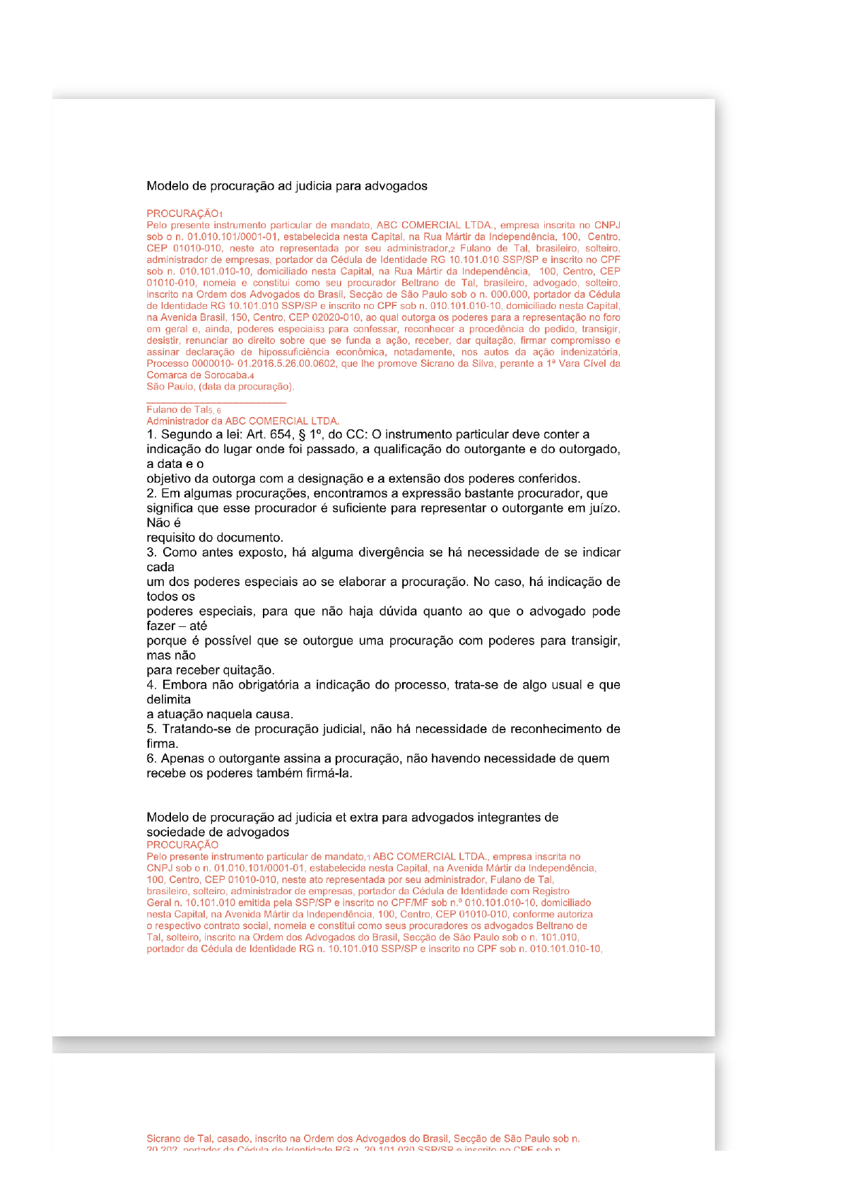 03/08/2021 PROCURAÇÃO E CONTRATO.docx - Google Drive https://drive.google.com/file/d/1VXgOJJfvT5FHlaLVYrWzj1HwFNzTXCsk/view 1/1 Página 1 de 4 Modelo de procuração ad judicia para advogados PROCURAÇÃO1 Pelo presente instrumento pa�icular de mandato, ABC COMERCIAL LTDA., empresa inscrita no CNPJsob o n. 01.010.101/0001-01, estabelecida nesta Capital, na Rua Má�ir da Independência, 100, Centro,CEP 01010-010, neste ato representada por seu administrador,2 Fulano de Tal, brasileiro, solteiro,administrador de empresas, po�ador da Cédula de Identidade RG 10.101.010 SSP/SP e inscrito no CPFsob n. 010.101.010-10, domiciliado nesta Capital, na Rua Má�ir da Independência, 100, Centro, CEP01010-010, nomeia e constitui como seu procurador Beltrano de Tal, brasileiro, advogado, solteiro,inscrito na Ordem dos Advogados do Brasil, Secção de São Paulo sob o n. 000.000, po�ador da Cédulade Identidade RG 10.101.010 SSP/SP e inscrito no CPF sob n. 010.101.010-10, domiciliado nesta Capital,na Avenida Brasil, 150, Centro, CEP 02020-010, ao qual outorga os poderes para a representação no foroem geral e, ainda, poderes especiais3 para confessar, reconhecer a procedência do pedido, transigir,desistir, renunciar ao direito sobre que se funda a ação, receber, dar quitação, �rmar compromisso eassinar declaração de hipossu�ciência econômica, notadamente, nos autos da ação indenizatória,Processo 0000010- 01.2016.5.26.00.0602, que lhe promove Sicrano da Silva, perante a 1ª Vara Cível daComarca de Sorocaba.4São Paulo, (data da procuração)._________________________ Fulano de Tal5, 6Administrador da ABC COMERCIAL LTDA.1. Segundo a lei: A�. 654, § 1º, do CC: O instrumento pa�icular deve conter a indicação do lugar onde foi passado, a quali�cação do outorgante e do outorgado, a data e o objetivo da outorga com a designação e a extensão dos poderes conferidos. 2. Em algumas procurações, encontramos a expressão bastante procurador, que signi�ca que esse procurador é su�ciente para representar o outorgante em juízo. Não é requisito do documento. 3. Como antes exposto, há alguma divergência se há necessidade de se indicar cada um dos poderes especiais ao se elaborar a procuração. No caso, há indicação de todos os poderes especiais, para que não haja dúvida quanto ao que o advogado pode fazer – até porque é possível que se outorgue uma procuração com poderes para transigir, mas não para receber quitação. 4. Embora não obrigatória a indicação do processo, trata-se de algo usual e que delimita a atuação naquela causa. 5. Tratando-se de procuração judicial, não há necessidade de reconhecimento de �rma. 6. Apenas o outorgante assina a procuração, não havendo necessidade de quem recebe os poderes também �rmá-la. Modelo de procuração ad judicia et extra para advogados integrantes de sociedade de advogados PROCURAÇÃO Pelo presente instrumento pa�icular de mandato,1 ABC COMERCIAL LTDA., empresa inscrita noCNPJ sob o n. 01.010.101/0001-01, estabelecida nesta Capital, na Avenida Má�ir da Independência,100, Centro, CEP 01010-010, neste ato representada por seu administrador, Fulano de Tal,brasileiro, solteiro, administrador de empresas, po�ador da Cédula de Identidade com RegistroGeral n. 10.101.010 emitida pela SSP/SP e inscrito no CPF/MF sob n.º 010.101.010-10, domiciliadonesta Capital, na Avenida Má�ir da Independência, 100, Centro, CEP 01010-010, conforme autorizao respectivo contrato social, nomeia e constitui como seus procuradores os advogados Beltrano deTal, solteiro, inscrito na Ordem dos Advogados do Brasil, Secção de São Paulo sob o n. 101.010,po�ador da Cédula de Identidade RG n. 10.101.010 SSP/SP e inscrito no CPF sob n. 010.101.010-10, Página 2 de 4 Sicrano de Tal, casado, inscrito na Ordem dos Advogados do Brasil, Secção de São 20 202 po�ador da Cédula de Identidade RG n 20 101 020 SSP/SP e inscrito no