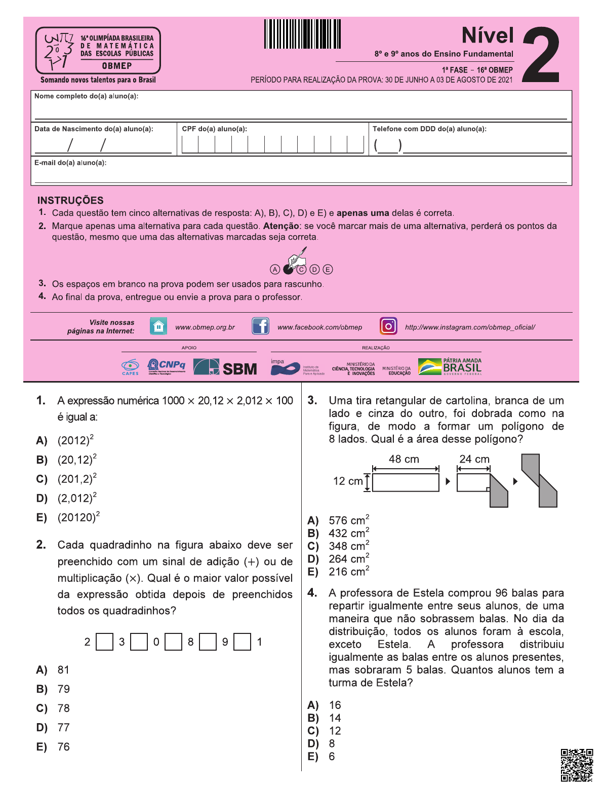 2 NÍVEL 2 OBMEP 5. Um cachorro começa a perseguir um coelho que está dez metros a sua frente. Enquanto o coelho corre 1 metro, o cachorro corre 10 metros. É correto afirmar que o cachorro: A) nunca alcançará o coelho. B) correrá mais que 11 metros e menos que 12 metros até alcançar o coelho. C) correrá exatamente 11 metros até alcançar o coelho. D) correrá mais que 12 metros e menos que 13 metros até alcançar o coelho. E) correrá exatamente 15 metros e meio até alcançar o coelho. 6. O gráfico mostra a temperatura média e a precipitação de chuva na cidade de Quixajuba, em cada um dos meses do ano passado. Qual das afirmativas abaixo está correta? A) De outubro para novembro, aumentaram tanto a precipitação quanto a temperatura. B) Os dois meses mais quentes foram também os de maior precipitação. C) Os dois meses mais frios foram também os de menor precipitação. D) O mês menos chuvoso foi também o mais frio. E) O mês mais chuvoso foi também o mais quente. 7. O número n é um inteiro negativo. Qual dos números abaixo é o maior? A) n − 9 B) 9n − 3 C) n − 3 D) 3n E) −3n 8. Se A e B representam algarismos diferentes e o valor de A × A + A é o número de dois algarismos AB, qual é o valor de B × B + B? A) ABA B) AA C) AB D) B E) A 9. Luís pensou em um número, dividiu-o por 285 e obteve resto 77. Se ele dividir o número em que pensou por 57, qual é o resto que ele vai encontrar? A) 56 B) 54 C) 40 D) 20 E) 0 10. José fez uma viagem de ida e volta entre as cidades de Pirajuba e Quixajuba em seu carro, que pode rodar com álcool ou gasolina. Na ida, apenas com álcool no tanque, seu carro fez 12 km por litro e, na volta, apenas com gasolina no tanque, fez 15 km por litro. No total, José gastou 18 litros de combustível nessa viagem. Qual é a distância entre Pirajuba e Quixajuba? A) 180 km B) 150 km C) 140 km D) 130 km E) 120 km 11. Júlio tem duas caixas com o mesmo número de bolas. As bolas podem ser azuis e pesar cinco quilos cada uma ou podem ser amarelas e pesar dois quilos cada uma. Na primeira caixa, 1 15 das bolas são azuis. O peso total das bolas na segunda caixa é o dobro do peso total das bolas da primeira caixa. Qual é a fração de bolas azuis na segunda caixa? A) 1 2 B) 2 15 C) 2 3 D) 7 8 E) 4 5 OBMEP NÍVEL 2 3 12. O polígono ABCDEF é um hexágono regular. Os pontos M e N são pontos médios dos lados AF e BC, respectivamente. O hexágono ABNGHM é simétrico em relação à reta que passa por M e N. Qual é a razão entre as áreas dos hexágonos ABNGHM e ABCDEF? A) 5 12 B) 7 15 C) 3 7 D) 4 11 E) 3 10 13. Rose percebeu que seu antigo relógio de parede tinha parado quando marcava 9 horas. Ela deu corda no relógio, colocando-o para funcionar, sem acertar o horário, e foi imediatamente ao mercado. Chegou ao mercado às 10 horas e 10 minutos. Fez suas compras em 1 hora e voltou para casa. Entrando em casa, notou que o relógio de parede marcava 10 horas e 40 minutos. Se Rose realizou os percursos de ida e volta ao mercado em tempos iguais, a que horas, na realidade, ela entrou em casa? A) 11 horas e 30 minutos B) 11 horas e 40 minutos C) 11 horas e 50 minutos D) 11 horas e 10 minutos E) 10 horas e 50 minutos 14. Os algarismos 2, 3, 4, 5, 6 e 7 foram usados na multiplicação indicada ao lado, em que cada letra da sigla OBMEP representa um algarismo diferente. Qual é o algarismo representado pela letra O? A) 7 B) 5 C) 4 D) 3 E) 2 15. Na expressão 𝑎𝑎 𝑏𝑏 + 𝑐𝑐 𝑑𝑑 = 29 30 as letras 𝑎𝑎, 𝑏𝑏, 𝑐𝑐, e 𝑑𝑑 representam números inteiros de 1 a 9. Qual é o valor de 𝑎𝑎 + 𝑏𝑏 + 𝑐𝑐 + 𝑑𝑑 ? A) 1820 B) 23 C) 21 D) 16 E) 14 16. Numa folha quadrada de papel de 30 cm de lado, branca de um lado e cinza do outro, marcou-se um quadrado ABCD em linhas pontilhadas, como na Figura 1. A folha foi dobrada ao longo das linhas pontilhadas e o resultado está mostrado na Figura 2, em que a parte cinza é um quadrado de área 144 cm2. Qual é o comprimento do segmento PA? A) 25 cm B) 24 cm C) 23 cm D) 22 cm E) 21 cm 4 NÍVEL 2 OBMEP 17. O Professor Mário aplicou uma prova de Geografia valendo 10 pontos. Para ter ideia do desempenho da turma, ele organizou a tabela abaixo: NOTAS ALUNOS Menores ou iguais a 4 6 Maiores do que 4 e menores ou iguais a 7 18 Maiores do que 7 16 Qual é a única alternativa que mostra um possível valor para a média aritmética das notas da turma? A) 7,9 B) 4,9 C) 4,5 D) 4,1 E) 3,9 18. Pablo usou quatro peças diferentes dentre as cinco mostradas acima para montar a figura indicada abaixo. Em qual das peças está o quadradinho marcado com X? A) V B) IV C) III D) II E) I 19. A figura mostra um polígono ABCDEF no qual dois lados consecutivos quaisquer são perpendiculares. O ponto G está sobre o lado CD e sobre a reta que passa por A e E. Os comprimentos de alguns lados estão indicados em centímetros. Qual é a área do polígono ABCG? A) 40 cm2 B) 39 cm2 C) 38 cm2 D) 37 cm2 E) 36 cm2 20. Três casais fizeram compra em uma livraria. Vítor comprou 3 livros a mais do que Lorena e Pedro comprou 5 livros a mais do que Cláudia. Cada um dos homens comprou 4 livros a mais do que sua respectiva esposa. Lorena e Cláudia compraram mais livros do que Bianca, que só comprou 3 livros. Qual das seguintes afirmações é verdadeira? A) Vítor é marido de Bianca. B) Cláudia comprou um livro a mais do que Lorena. C) Pedro é marido de Cláudia. D) Pedro foi o marido que comprou o maior número de livros. E) Vítor comprou mais livros do que Pedro.