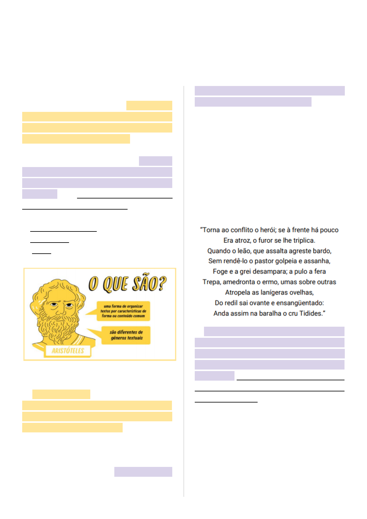 Lit����ur� Gêneros Literários: épico/narrativo OS GÊNEROS LITERÁRIOS → Os gêneros literários são conjuntos ou categorias que reúnem aspectos semelhantes de forma e conteúdo em relação às produções literárias. ↬ Esse agrupamento também pode ser realizado de acordo com características semânticas, contextuais, discursivas e sintáticas. O filósofo aristóteles foi o primeiro a definir os gêneros e os dividiu em três importantes classificações: → épico ou narrativo; → dramático; → lírico. GÊNERO ÉPICO/NARRATIVO → No gênero épico, do grego “epikos”, há a presença de uma narrativa com temáticas grandiosas e heróicas sobre a história de um povo e seus personagens. ↬ O narrador fala de um determinado passado e apresenta também o espaço onde sucederam as ações. Em geral, o texto é construído por versos e há a presença de elementos míticos ou fantasiosos. → Duas obras muito conhecidas são "Ilíada" e "Odisseia", heróis épicos da Grécia Antiga. Na Idade Média, Dante Alighieri retoma a escrita com “Divina Comédia”, já na Era Moderna, Luís Vaz de Camões revive o gênero com “Os Lusíadas”. Abaixo, você encontra um pequeno trecho de “Ilíada” e algumas características da lírica épica: ↬ Já o texto gênero narrativo nasce na modernidade derivado do épico, no entanto, é constituído em prosa. São exemplificados pelas novelas, romances, contos, etc. Por desenvolver uma estrutura diferente das antigas obras épicas, ela é caracterizada por: → Apresentação: introdução dos personagens, tempo, espaço em que seguirá a narrativa. → Desenvolvimento: parte da história é desenvolvida com base nas ações dos personagens, direcionando a um momento de ápice. → Clímax: momento da história de maior tensão, é o ápice da narrativa. → Desfecho: finalização dos conflitos e desenvolvimentos, conclusão dos personagens e de suas relações. ELEMENTOS DO GÊNERO ÉPICO/NARRATIVO → Os elementos da narrativa são essenciais para o gênero, pois é por meio deles que ocorre o decorrer das ações da história. Dividem-se em cinco: ↬ Personagem: São as pessoas presentes na narrativa. De acordo com sua importância, são denominados como “protagonistas” (figuras principais) ou “coadjuvantes” (personagens secundários). ↬ Enredo: É o tema/assunto da história, que pode ser contada de maneira linear ou não-linear (respeitando ou não a cronologia). E a partir dele que irá se desdobrar o decorrer da narrativa. ↬ Tempo: Podendo ser cronológico (que segue uma linearidade dos acontecimentos) ou de modo interior e digressivo, é importante ressaltar que toda a narrativa é transmitida em um certo tempo para que se façam os acontecimentos. ↬ Espaço: É o local em que se desenvolve a narrativa. Podendo ser físico ou psicológico, determinará onde as ações irão acontecer. ↬ Narrador: Também chamado de “foco narrativo”, é a “voz” do texto, ou seja, é quem irá transmitir as ideias presentes da narrativa. → Obs: é importante lembrar os tipos de narradores: → Narrador-personagem, é aquele que narra e também faz parte do enredo; → Narrador-observador, não faz parte do enredo e narra a história em 3ª pessoa; → Narrador-onisciente, é aquele que narra e sabe os anseios e sentimentos dos personagens.