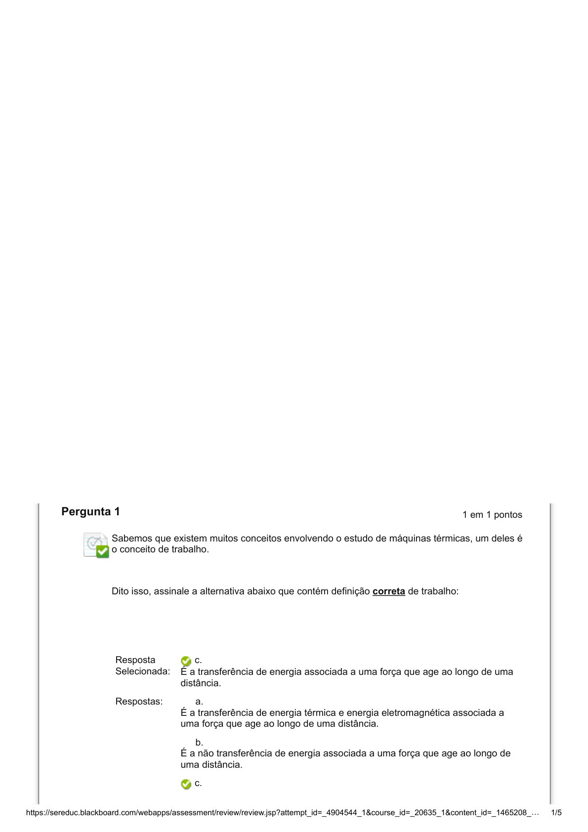 27/09/2019 Revisar envio do teste: Avaliação On-Line 2 (AOL 2) - ... https://sereduc.blackboard.com/webapps/assessment/review/review.jsp?attempt_id=_4904544_1&course_id=_20635_1&content_id=_1465208_… 1/5 Unidade 1 Revisar envio do teste: Avaliação On-Line 2 (AOL 2) - QuestionárioH Revisar envio do teste: Avaliação On-Line 2 (AOL 2) -Revisar envio do teste: Avaliação On-Line 2 (AOL 2) - QuestionárioQuestionário Usuário Danilo Rodrigues dos Santos Curso 12843 . 7 - Máquinas Térmicas - 20192.A Teste Avaliação On-Line 2 (AOL 2) - Questionário Iniciado 22/08/19 19:47 Enviado 27/09/19 21:42 Status Completada Resultado da tentativa 10 em 10 pontos Tempo decorrido 865 horas, 55 minutos Instruções Resultados exibidos Todas as respostas, Respostas enviadas, Respostas corretas, Perguntas respondidas incorretamente Atenção! Você terá 1 opção de envio. Você pode salvar e retornar quantas vezes desejar, pois a tentativa só será contabilizada quando você decidir acionar o botão ENVIAR. Após o envio da atividade, você poderá conferir sua nota e o feedback, acessando o menu lateral esquerdo (Notas). IMPORTANTE: verifique suas respostas antes do envio desta atividade. Pergunta 1 Resposta Selecionada: c. Respostas: a. b. c. Sabemos que existem muitos conceitos envolvendo o estudo de máquinas térmicas, um deles é o conceito de trabalho. Dito isso, assinale a alternativa abaixo que contém definição correta de trabalho: É a transferência de energia associada a uma força que age ao longo de uma distância. É a transferência de energia térmica e energia eletromagnética associada a uma força que age ao longo de uma distância. É a não transferência de energia associada a uma força que age ao longo de uma distância. Disciplinas Cursos 1 em 1 pontos Danilo Rodrigues dos Santos 6 27/09/2019 Revisar envio do teste: Avaliação On-Line 2 (AOL 2) - ... https://sereduc.blackboard.com/webapps/assessment/review/review.jsp?attempt_id=_4904544_1&course_id=_20635_1&content_id=_1465208_… 2/5 d. e. É a transferência de energia associada a uma força que age ao longo de uma distância. É a transferência de energia térmica e energia química associada a uma força que age ao longo de uma distância. É a transferência não associada a uma força que age ao longo de uma distância. Pergunta 2 Resposta Selecionada: a. Respostas: a. b. c. d. e. De acordo com tudo que foi abordado até agora no estudo das máquinas térmicas, assinale a alternativa abaixo a que não representa a classificação das máquinas térmicas referentes ao trabalho: Máquinas Térmicas eletromagnéticas. Máquinas Térmicas eletromagnéticas. Máquinas Térmicas de Fluxo. Máquinas Térmicas geratrizes. Máquinas térmicas motrizes. Máquinas Térmicas de deslocamento positivo. Pergunta 3 Resposta Selecionada: e. Respostas: a. b. c. d. e. Assinale a alternativa abaixo que contém a definição correta sobre o que é o calor: A forma de energia transferida entre os dois sistemas (ou entre um sistema e sua vizinhança) em virtude da diferença de temperaturas. A forma de eletricidade transferida entre dois sistemas (ou entre duas vizinhanças) em virtude da diferença de temperaturas. A forma de energia transferida entre um sistema e uma vizinhança em virtude da igualdade de temperaturas. A forma de energia transferida entre dois sistemas (ou entre duas vizinhanças) em virtude da diferença de temperaturas. A forma de energia transferida entre um sistema e um outro sistema em virtude da diferença de temperatura. A forma de energia transferida entre os dois sistemas (ou entre um sistema e sua vizinhança) em virtude da diferença de temperaturas. Pergunta 4 O calor é transferido de uma fornalha para uma máquina a uma taxa de 80MW. Considerando 1 em 1 pontos 1 em 1 pontos 1 em 1 pontos 27/09/2019 Revisar envio do teste: Avaliação On-Line 2 (AOL 2) - ... https://sereduc.blackboard.com/webapps/assessment/review/review.jsp?attempt_id=_4904544_1&course_id=_20635_1&content_id=_1465208_… 3/5 Resposta Selecionada: c. Respostas: a. b. c. d. e. que a taxa em que o calor é rejeitado para um rio próximo é de 50MW, determine o trabalho realizado pela máquina: 37,5% ou 0,375. 35,3% ou 0,353. 31,7% ou 0,317. 37,5% ou 0,375. 32,5% ou 0,325. 38,5% ou 0,385. Pergunta 5 Resposta Selecionada: e. Respostas: a. b. c. d. e. Como já foi estudado por definição, uma máquina térmica realiza transformações de energia, assinale a alternativa que indica que consegue transformar energia térmica em: Energia Mecânica. Energia Magnética. Energia Química. Energia Elétrica. Energia Cinética. Energia Mecânica. Pergunta 6 Resposta Selecionada: d. Respostas: a. b. c. d. e. Assinale a alternativa abaixo que contém a definição correta do que é uma máquina térmica: É um dispositivo capaz de transformar energia térmica em energia mecânica, ela também pode transformar calor em trabalho. É um dispositivo capaz de transformar energia térmica em energia elétrica, ela também pode transformar calor em trabalho. É um dispositivo capaz de transformar energia térmica em energia nuclear, ela também pode transformar calor em trabalho. É um dispositivo capaz de transformar energia elétrica em energia mecânica, ela também pode transformar calor em trabalho. É um dispositivo capaz de transformar energia térmica em energia mecânica, ela também pode transformar calor em trabalho. É um dispositivo capaz de transformar energia mecânica em energia térmica, ela também pode transformar calor em trabalho. Pergunta 7 1 em 1 pontos 1 em 1 pontos 27/09/2019 Revisar envio do teste: Avaliação On-Line 2 (AOL 2) - ... https://sereduc.blackboard.com/webapps/assessment/review/review.jsp?attempt_id=_4904544_1&course_id=_20635_1&content_id=_1465208_… 4/5 Resposta Selecionada: c. Respostas: a. b. c. d. e. As máquinas térmicas são extremamente necessárias para qualquer indústria, dito isso marque a alternativa 