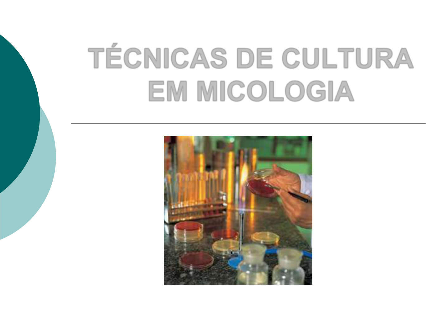 TÉCNICAS DE CULTURA EM MICOLOGIA Prof. Carlos Fernando dos Santos CRBM 3158 TÉCNICAS DE CULTURA Ágar Sabouraud Clorafenicol (SAB) Meio de enriquecimento - Semeia vários tipos de fungos. Na microbiologia – meio seletivo Água destilada.......1000ml (isentas de elementos nutricionais) Peptona................10g (Peptona de carne pedaços de carne degradados) Dextrose...............40g (Carboidratos) Ágar-Ágar.............20g (15 a 20g, por litro) Clorafenicol...........50mg* (Antibiótico que inibe o crescimento bacteriano ou gentamicina 60mg) pH.......................4,0 a 5,0 PREPARO DE MEIOS DE CULTURA TÉCNICAS DE CULTURA PREPARO DE MEIOS DE CULTURA Ágar Sabouraud Clorafenicol (SAB) TÉCNICAS DE CULTURA Ágar Batata Dextrose (BDA) (Meio de enriquecimento, infusão da batata, não é bom usar quando se quer crescimento de microorganismo) Água destilada.........500ml Infusão de batata.....500ml Glicose....................10g (Fonte de carboidrato) Ágar-Ágar.............15g (Dar consistência) Clorafenicol...........50mg* (Inibir o crescimento bacteriano) pH.......................4,0 a 5,0 (pH ácido) PREPARO DE MEIOS DE CULTURA TÉCNICAS DE CULTURA PREPARO DE MEIOS DE CULTURA Ágar Batata Dextrose (BDA) TÉCNICAS DE CULTURA Ágar Czapek (CZK) (Enriquecimento, para fungos presentes no solo e diferencial, quando quer crescer fungos geofílico(afinidade com a terra)) Água destilada.............................1000ml Sacarose......................................30g (fonte de carboidrato) Nitrato de sódio...........................3g Fosfato dibásico de potássio........1,0g Sulfato de magnésio....................0,5g Cloreto de potássio......................0,5g Sulfato de ferro............................0,01g Ágar-Ágar....................................15g Clorafenicol.................................50mg/L* pH...............................................4,0 a 5,0 PREPARO DE MEIOS DE CULTURA TÉCNICAS DE CULTURA PREPARO DE MEIOS DE CULTURA Ágar Czapek (CZK) TÉCNICAS DE CULTURA Ágar Mycosel (MYC) (Seletivo para dermatófilos) Água destilada...................1000ml Peptona.............................10g Glicose...............................10g Ágar-Ágar..........................15g Ciclo-heximida...................0,4g (Inibe o crescimento de fungos saprofitos) Clorafenicol.......................0,05g pH.....................................4,0 a 5,0 (ácido) PREPARO DE MEIOS DE CULTURA TÉCNICAS DE CULTURA PREPARO DE MEIOS DE CULTURA Ágar Mycosel (MYC) TÉCNICAS DE CULTURA Ágar Infusão de Cérebro e Coração Bovino (BHI) (Meio seletivo, para fungos que crescem em tecidos profuntos) Água destilada............................1000ml Infusão de Cérebro e Coração(Difco)............................37g Ágar-Ágar...................................20g Clorafenicol.................................0,05g pH...............................................7,4 (pH básico) PREPARO DE MEIOS DE CULTURA TÉCNICAS DE CULTURA PREPARO DE MEIOS DE CULTURA Ágar Infusão de Cérebro e Coração Bovino (BHI) IMPORTANTE Incubação a 35ºC! TÉCNICAS DE CULTURA PREPARO DE MEIOS DE CULTURA Meios Semi-sólidos Caldos Semi-sólidos Caldos TÉCNICAS DE CULTURA PREPARO DE MEIOS DE CULTURA Observações Importantes Ferver meios que contém ágar-ágar Adicionar o antibiótico somente após fervura do meio. Desprezar meios que queimarem Autoclavação ideal =121ºC por 20 min. TÉCNICAS DE CULTURA ASSEPSIA E ESTERILIZAÇÃO Vidrarias Detergentes neutros Autoclave 121ºC/20min Meios de cultura Autoclave 121ºC/20min Bancadas Álcool 70% Hipoclorito de sódio Câmara de fluxo laminar Álcool 70%, Luz UV 20 min. Filtro de ar milipore* TÉCNICAS DE CULTURA ASSEPSIA E ESTERILIZAÇÃO Hipoclorito de Sódio Bico de Bunsein Desinfecção Perévia da Bancada TÉCNICAS DE CULTURA DESINFECÇÃO Vidrarias Meios de cultura utilizados Filtro milipore Caixas de descarte (Descarpack)* Autoclave 121ºC durante 20 minutos. TÉCNICAS DE CULTURA DESINFECÇÃO E ESTERILIZAÇÃO Autoclave 121ºC durante 20 minutos Autoclave Vertical Interior do Autoclave Termômetro Barômetro TÉCNICAS DE CULTURA CINÉTICA DO CRESCIMENTO FÚNGICO Leveduras Fissão binária / Gemulação Colônias circulares com bordas variáveis Fissão binária / Gemulação Cicatriz gemular Bordos Diferencialdos TÉCNICAS DE CULTURA CINÉTICA DO CRESCIMENTO FÚNGICO Fungos Filamentosos Centrífugo Zonas de maturação distintas TÉCNICAS DE CULTURA ENRIQUECIMENTO PARA ISOLAMENTO DE FUNGOS A PARTIR DE AMOSTRAS SÓLIDAS Caldo YG 25ml Balão de 250ml Rolha de gaze + algodão 25g da amostra a ser analisada Crescimento de 5-7 dias Agitação constante(*) Temperatura ambiente(*) TÉCNICAS DE CULTURA ENRIQUECIMENTO PARA ISOLAMENTO DE FUNGOS A PARTIR DE AMOSTRAS SÓLIDAS TÉCNICAS DE CULTURA SEMEIO DE FUNGOS FILAMENTOSOS Técnica de pique central em placa de petri Técnica de piques em gradiente em PP. Técnica de estrias em tubo com meio inclinado TÉCNICAS DE CULTURA SEMEIO DE FUNGOS FILAMENTOSOS Pique Central TÉCNICAS DE CULTURA SEMEIO DE FUNGOS FILAMENTOSOS TÉCNICAS DE CULTURA ISOLAMENTO DE FUNGOS PÓS-CRESCIMENTO EM CALDO ENRIQUECIDO Placas de petri com Ágar SAB ou BDA Alça de platina em alíquota Câmara de fluxo laminar esterilizada Álcool 70% Luz UV 20 min. Piques em gradiente na placa de petri TÉCNICAS DE CULTURA SEMEIO DE FUNGOS FILAMENTOSOS Piques em Gradiente TÉCNICAS DE CULTURA SEMEIO DE FUNGOS FILAMENTOSOS Pique em Meio Inclinado TÉCNICAS DE CULTURA SEMEIO DE LEVEDURAS Técnica de estrias em placa de petri Técnica de estrias em tubo com meio inclinado TÉCNICAS DE CULTURA SEMEIO DE LEVEDURAS Técnica de estrias em placa de petri Técnica de estrias em tubo com meio inclinado TÉCNICAS DE CULTURA ISOLAMENTO DE FUNGOS PÓS-CRESCIMENTO EM CALDO ENRIQUECIDO Câmara de fluxo laminar esterilizada Álcool 70% Luz UV 20 min. OBRIGADO! fernandoupa@gmail.com Prof:. Carlos Fernando dos Santos CRBM: 3158 Todos os direitos reserva
