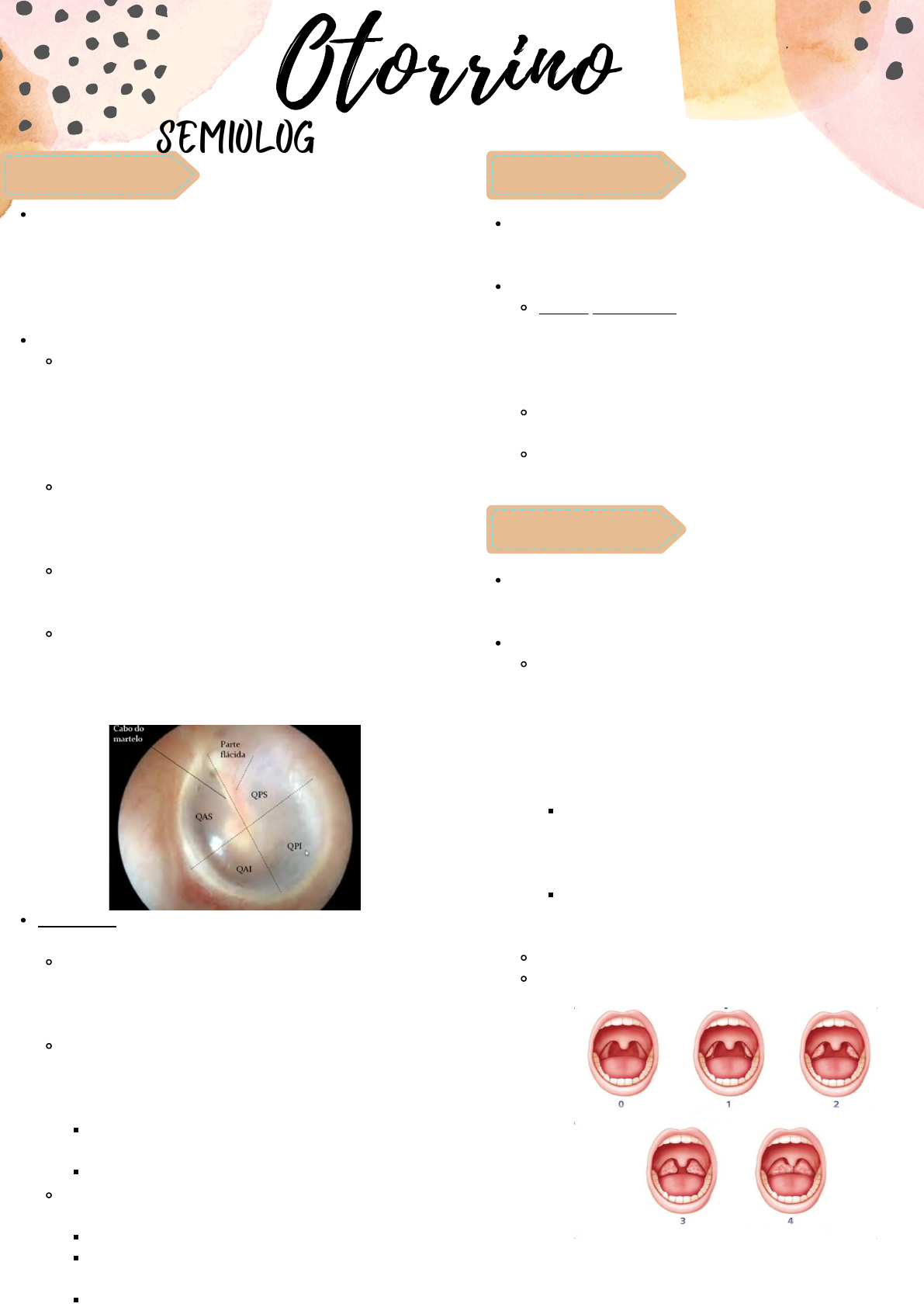 Otorrino SEMIOLOGIA OTORRINOLARINGOLÓGICA Principais queixas - hipoacusia (diminuição da audição), otalgia (dor), zumbido (também chamado de tinido, chiado, etc.), otorreia (secreção, descrever aspecto, odor, etc.), otorragia (sangramento), vertigem (diferenciar de tontura, a vertigem é uma sensação rotatória, associada à náuseas e/ou vômitos, popularmente chamada de labirintite). Exame físico É feito com um otoscópio, que possuem espéculos com vários tamanhos (no ambulatório tem o 3 e o 5, no adulto usar o 5). O espéculo pode ser segurado de duas formas, mas para iniciantes é ideal segurar que nem caneta, pois ele permite apoiar os dedos na face do paciente, garantindo maior estabilidade e segurança. O paciente deve estar sentado, o médico deve segurar e tracionar a orelha a ser examinada para uma melhor visualização (orelha direita, traciona com a mão esquerda e segura o otoscópio com a mão direita). Deve ser visualizado a membrana timpânica e a orelha média. A partir do cabo do martelo (região mais clara), será dividido em quatro porções (QAS, QPS, QAI, QPI). Devem ser analisados cinco aspectos - INTEGRIDADE, COR (o normal é uma cor de âmbar), TRANSPARÊNCIA (semitransparente), POSIÇÃO (levemente côncava, com depressão no umbigo do martelo), MOBILIDADE (analisado com otoscópio pneumático). SEMIOLOGIA OTOLÓGICA Acumetria - testa a perda de via áerea, é feita no consultório com o diapasão, se divide em três testes: de via aérea - bater com o diapasão no osso da mão e ir trocando de lado na face do paciente, pedindo se ele escuta e se está igual dos dois lados. Resultados - VAD=VAE, VAD>VAE e VAD<VAE. de Rinne - bater o diapasão e apoiar no osso mastoide átras da orelha, depois colocar na frente da orelha do paciente, pedir como ele ouviu melhor, átras ou na frente, repetir dos dois lados. Positivo - VA>VO, audição normal ou perda neurosensorial. Negativo - VA<VO, perda condutiva. de Weber - bater o diapasão e apoiar na linha média na cabeça do paciente, pedir onde ele está escutando. Indiferente - teste normal ou perda simétrica. Lateraliza para lado de melhor audição - perda neurosensorial. Lateraliza para lado de pior audição - perda condutiva. Principais queixas - obstrução nasal (mais comum), respiração oral, rinorreia (secreção, descrever cor, cheiro, aspecto, etc.), epistaxe (sangramento), hiposmia/anosmia. Exame físico Rinoscopia anterior - inserir espéculo nasal na narina do paciente, com o dedo indicador esticado (para não abrir demais o espéculo e lesionar o paciente), para examinar a narina direita usar a mão esquerda, fotóforo na cabeça direcionando o lugar para onde vai a luz. Deve ser visualizado o meato médio, corneto inferior, meato inferior e assoalho nasal. Também, pode ser realizada endoscopia nasal rígida, nasofibrolaringoscopia (flexível). Principais queixas - odinofagia, disfagia, disfonia, lesões/ulcerações/manchas, nódulos/massas cervicais, halitose. Exame físico Oroscopia - usar o fotóforo, colocar o abaixados de língua dentro da boca do paciente, em uma posição mediana (sem passar do último terço da língua, para não provocar reflexo de vômito). A língua deve permanecer relaxada dentro da boca do paciente. No exame deve ser enxergado o palato mole e duro, as amígdalas, úvula e orofaringe. As amígdalas podem ser classificadas pela sua hipertrofia de acordo com a escala de Brodsky e a visualização das estruturas pela escala de Mallampati modificada. Na oroscopia também podem ser analisadas as glândulas salivares, o ducto parotídeo e submandibular. Pode ser feita uma laringoscopia indireta, por vídeo. Na parte do pescoço, devem ser palpadas as cadeias linfonodais e a tireoide. SEMIOLOGIA NASOSSINUSAL SEMIOLOGIA DE BOCA, LARINGE E PESCOÇO Escala de Brodsky Mallampati modificado INSTRUMENTOS UTILIZADOS