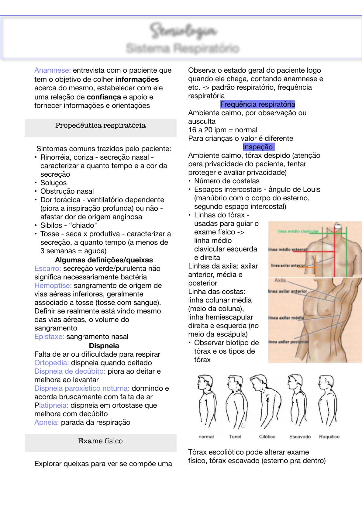 Anamnese: entrevista com o paciente que tem o objetivo de colher informações acerca do mesmo, estabelecer com ele uma relação de confiança e apoio e fornecer informações e orientações Sintomas comuns trazidos pelo paciente: • Rinorréia, coriza - secreção nasal - caracterizar a quanto tempo e a cor da secreção • Soluços • Obstrução nasal • Dor torácica - ventilatório dependente (piora a inspiração profunda) ou não - afastar dor de origem anginosa • Sibilos - “chiado" • Tosse - seca x produtiva - caracterizar a secreção, a quanto tempo (a menos de 3 semanas = aguda) Algumas definições/queixas Escarro: secreção verde/purulenta não significa necessariamente bactéria Hemoptise: sangramento de origem de vias aéreas inferiores, geralmente associado a tosse (tosse com sangue). Definir se realmente está vindo mesmo das vias aéreas, o volume do sangramento Epistaxe: sangramento nasal Dispneia Falta de ar ou dificuldade para respirar Ortopedia: dispneia quando deitado Dispneia de decúbito: piora ao deitar e melhora ao levantar Dispneia paroxístico noturna: dormindo e acorda bruscamente com falta de ar Platipneia: dispneia em ortostase que melhora com decúbito Apneia: parada da respiração Explorar queixas para ver se compõe uma doença/síndrome Observa o estado geral do paciente logo quando ele chega, contando anamnese e etc. -> padrão respiratório, frequência respiratória Frequência respiratória Ambiente calmo, por observação ou ausculta 16 a 20 ipm = normal Para crianças o valor é diferente Inspeção Ambiente calmo, tórax despido (atenção para privacidade do paciente, tentar proteger e avaliar privacidade) • Número de costelas • Espaços intercostais - ângulo de Louis (manúbrio com o corpo do esterno, segundo espaço intercostal) • Linhas do tórax - usadas para guiar o exame físico -> linha médio clavicular esquerda e direita Linhas da axila: axilar anterior, média e posterior Linha das costas: linha colunar média (meio da coluna), linha hemiescapular direita e esquerda (no meio da escápula) • Observar biotipo de tórax e os tipos de tórax Tórax escoliótico pode alterar exame físico, tórax escavado (esterno pra dentro) Semiologia Sistema Respiratório Propedêutica respiratória Exame físico e tórax pra frente (peito de pombo) também podem atrapalhar o exame físico • Expansibilidade (problema de expansão de caixa torácica) • Utilização da musculatura acessória: retração da fúrcula diafragmática e utilização de músculos do pescoço por exemplo • Observar se existe ruído audível sem estetoscópio (sibilos até podem, mas o que se relaciona a diminuição de calibre de via aérea de grande calibre é o estridor) • Cianose (central = hipoxemia, periférica = ocorre mais por vasoconstrição) • Baqueteamento digital (pode ser fisiológico) Ritmos respiratórios Pode ter aumento da frequência sem alteração de ritmo (taquipneia) Taquipneia de base e de vez em quando suspira mais fundo, incursão respiratória maior (dispnéia suspirosa) Ritmo de biot: respiração anárquica, ou seja, incursões respiratórias de amplitude muito variáveis. • Geralmente está relacionado com doenças do sistema nervoso central (trauma, meningite, AVC, TCE) Ritmo de Cheyne-Stokes: crescente, decrescente, pausa de apneia. Inspirações cada vez mais profundas até uma inspiração máxima, depois cada vez menos profundas até uma pausa de apneia. • Relacionado a doença do SNC (principalmente AVC e trauma) Ritmo de cantani e kussmaul ocorre principalmente em acidose metabólica grave (como complicações de diabetes), corpo tenta combater fazendo alcalose respiratória Ritmo de cantani: grande aumento de amplitude e da frequência respiratória Ritmo de kussmaul: muito relacionado a cantani, aumento da amplitude relacionado a momentos de apneia -> inspira e prende (apneia inspiratória), expira e prende (apneia expiratória) Palpação Identificação de regiões de hipersensibilidade, avaliação das anormalidades observadas através dessa palpação Avaliação adicional da expansão torácica Frêmito tóraco-vocal -> pedir ao paciente para falar 33 Expansibilidade - exame físico (prática) Mãos abertas, polegares fazem prega, pede para inspirar profundamente e observa se os 2 polegares se distanciam igualmente Exame físico feito com paciente sentado no sistema respiratório Frêmito tóraco-vocal Vibração discreta percebida pelo examinador do som emitido pelo paciente (ao falar 33) Compara-se o hemitórax direito com o esquerdo • Superfície óssea da palma da mão, posiciona paciente sentado e com braços cruzados na frente, posiciona a mão no espaço intercostal evitando a escápula -> comparando um lado com o outro antes de mudar de localidade • Faz nas costas e tórax Essa vibração pode ser alterada de acordo com a densidade do que estiver dentro do pulmão: - Quanto mais sólido for o meio, melhor para propagação de uma onda sonora -> quanto mais denso o meio, maior a propagação dessa onda sonora, o que altera o frêmito tóraco-vocal, tendo aumento dessa vibração de acordo com a densidade do que está na localidade Percussão Dedo no espaço intercostal do tórax do paciente, e com outro dedo da outra mão vai bater nesse dedo, com isso escuta qual som que faz (ex: som maciço, timpânico que não são normais) • Som claro pulmonar = som dentro da normalidade • Também compara o lado direito com o esquerdo, fazendo a letra J Ausculta Feita com estetoscópio, paciente sentado e ambiente calmo/sem ruído Ouve os sons gerados pela respiração • Murmúrio vesicular: som normal da respiração por todo o pulmão • Som brônquico e traqueal: podem ser auscultados na região mais central do tórax, geralmente ao redor do primeiro e segundo espaço intercostal • Ruídos adventícios/anormais: sibilos (peito piando), roncos (som de ronco que geralmente significa secreç