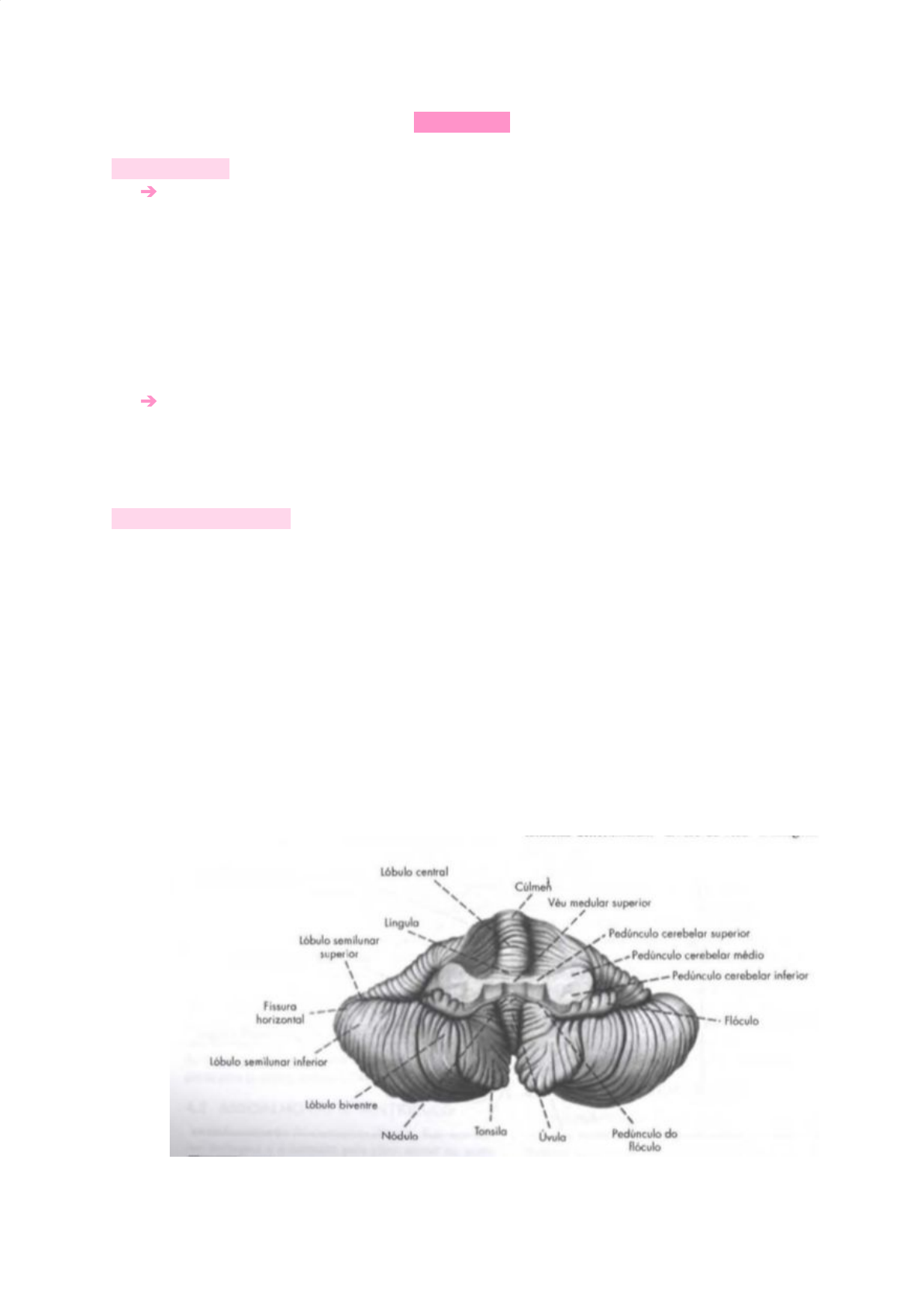 BMF IV CEREBELO ———————————————————————————————————————--- Generalidades ➔ localização ● situado dorsalmente ao bulbo e à ponte ● contribui para formacao do IV ventrículo ➔ estruturas adjacentes ● repousa sobre a fossa cerebelar do osso occipital ● separado do lobo occipital por uma prega da dura-máter (tenda do cerebelo) ● liga-se a medula e ao bulbo pelo pedúnculo cerebelar inferior ● liga-se a ponte e ao mesencéfalo pelos pedúnculos cerebelosos médio e superior ➔ importância ● manutenção da postura, equilíbrio, coordenação dos movimentos e aprendizagem de habilidades motoras ● envolvido em funções cognitivas ———————————————————————————————————————— Aspectos Anatômicos ➔ há uma porção ímpar e mediana: vermis ● ligado a duas grandes massas laterais - hemisférios cerebelares ● pouco separado na face dorsal do cerebelo ● ligado a face ventral do cerebelo ● sulcos separam das partes laterais ➔ folhas do cerebelo: lâminas finas que são delimitadas por sulcos na superfície do cerebelo de direção transversal ➔ os sulcos, fissuras e lóbulos aumentam a superfície do cerebelo, sem grande aumento de volume ➔ corpo medular do cerebelo: substância branca que constitui internamente, é um centro ● dali irradiam as lâminas brancas do cerebelo, revestidas externamente por uma fina camada de substância cinzenta - córtex cerebelar ➔ BMF IV ➔ no interior do corpo medular existem quatro núcleos centrais do cerebelo, compostos de substância cinzenta ● denteado, interposito (subdividido em emboliforme e globo) e fastigial ● tem grande importância funcional e clínica, da onde saem todas as fibras nervosas eferentes do cerebelo ———————————————————————————————————————--- Lóbulos e Fissuras ➔ loublos ● recebem denominações diferentes dos vermis e hemisférios ● cada lóbulo do vermis correspondem dois nos hemisférios ● são 17 lóbulos ● mais importantes: ○ nódulo → último lóbulo do vermis, acima do teto do IV ventrículo ○ flóculo → um lóbulo do hemisfério, alongado transversalmente com folhas situadas atrás do pedúnculo cerebelar inferior ○ tonsilas → evidentes na face ventral do cerebelo, projetando-se medialmente sobre a face dorsal do bulbo ➔ fissuras ● são 8 fissuras ● mais importantes: posterolaterais e prima ● BMF IV ● ———————————————————————————————————————— Divisão anatomia ➔ os lóbulos podem ser agrupados em estruturas maiores ➔ os lobos são separados pelas fissuras posterolateral e prima ● posterolateral → divide o cerebelo em lobo flóculo-nodular e corpo do cerebelo ● prima → divide o corpo do cerebelo em lobo anterior e posterior ———————————————————————————————————————--- Pedúnculos Cerebelares ➔ são 3 ● superior → liga o cerebelo ao mesencéfalo ● médio → feixe de fibras que liga o cerebelo a ponte e constitui a parede dorsolateral da medula cranial do IV ventrículo ● inferior → liga o cerebelo a medula ➔ o limite entre a ponte e o pedúnculo cerebelar é ponto de emergência do nervo trigêmeo BMF IV ● ———————————————————————————————————————— Estrutura e Funções do Cerebelo ➔ conexões intrínsecas do cerebelo ● as fibras que penetram o cerebelo dirigem ao córtex e são de dois tipos e ambas são glutamatérgicas ○ fibras musgosas →representam terminação dos demais feixes de fibras que penetram no cerebelo, ao penetrá-lo emitem ramos colaterais que fazem sinapses excitatórias com neurônios dos núcleo cerebrais, atingem a camada granular onde se ramifica e terminam em sinapse excitatória axodendríticas com grande número de células granulares que através das fibras paralelas se ligam às células de Purkinje ○ fibras trepadeiras → são axônios de neurônios situados no complexo olivar inferior, terminam enroladas nos dendritos das células de Purkinje, exercendo ação excitatória ● circuito cerebelar básico → os impulsos nervosos penetram no cerebelo pelas fibras musgosas ativam os neurônios dos núcleo central, as células granulares e as de Purkinje, que inibem os próprios neurônios dos núcleos centrais ● a atividade neuronal → é modulada pela ação inibitória das células de Purkinje ● o circuito formado pela união das células granulares com a de purkinje é modulado pela ação de 3 outras células inibitórias: células encensto, células de golgi e células estreladas ● essas células agem através da liberação do GABA ● a célula granular → única excitatória, tem como neurotransmissor o glutamato BMF IV ● a célula de purkinje → recebe sinapses diretamente das fibras trepadeiras e indiretamente das musgosas, projetando para dois núcleos centrais do cerebelo ou para o núcleo vestibula, no caso do lobo flóculo nodular, sendo as vias de saída do cerebelo ● BMF IV ● ➔ núcleos centrais e corpo medular do cerebelo ● núcleo denteado → maior dos núcleos, assemelha-se ao olivar inferior localizado mais lateralmente ● núcleo emboliforme → entre o denteado e fastigial, semelhante ao globoso e juntos formam o interpósito ● núcleo globoso → entre o denteado e fastigial, semelhante ao emboliforme e juntos formam o interpósito ● núcleo fastigial → próximo ao plano mediano em relação ao ponto mais alto de teto do IV ventrículo ● dos núcleos centrais saem as fibras eferentes e neles chegam ao axônio das células de purkinje e colaterais das fibras musgosas ● o corpo medul