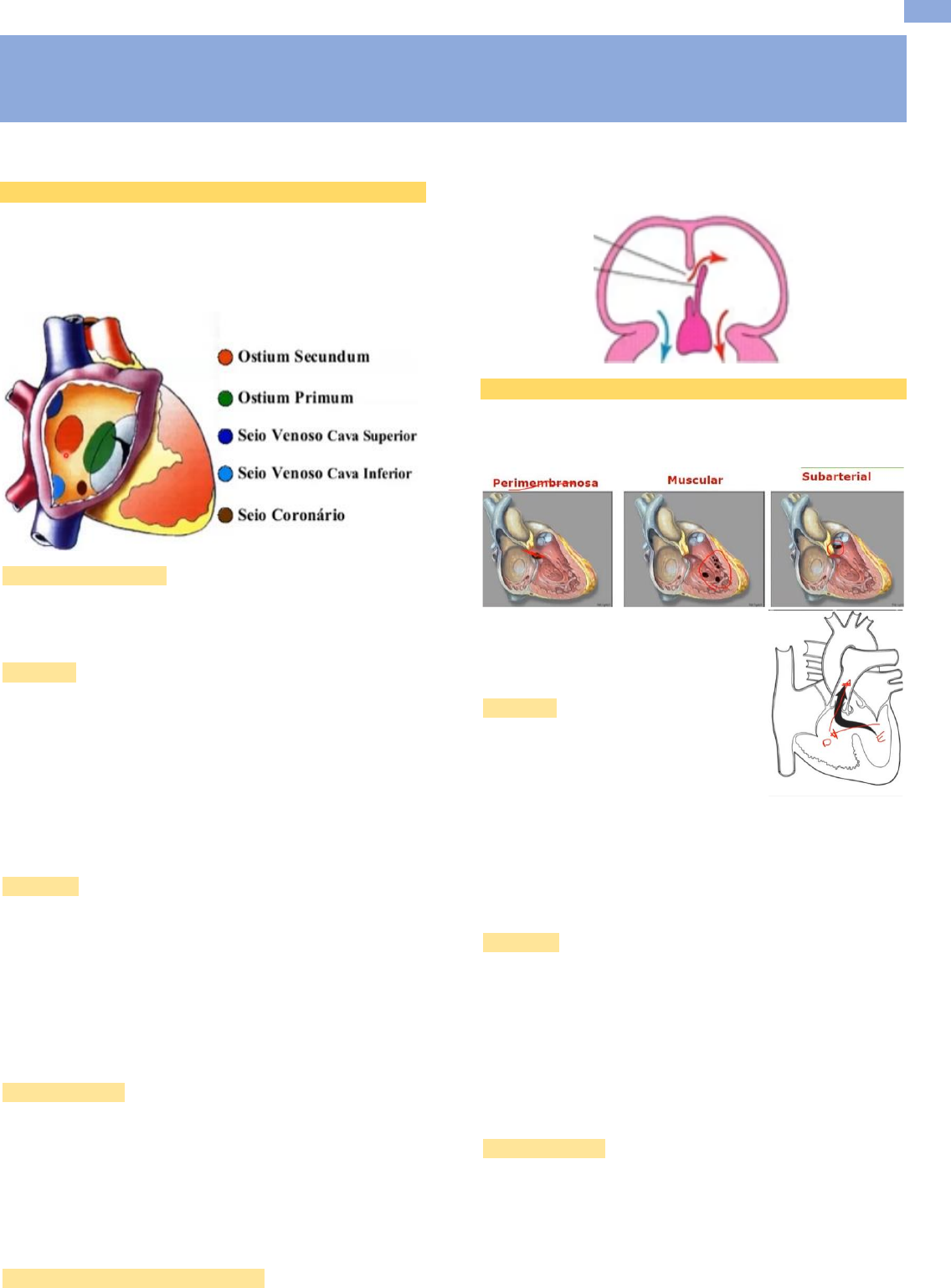 1 PEDIATRIA – Alan Paz Cardiopatias Congênitas ACIANÓTICAS COMUNICAÇÃO INTERATRIAL (CIA) - Defeito no septo interatrial - Pela pressão levemente maior no AE, o sangue vai do AE → AD, causando congestão - Não confundir com o Forame Oval Patente (FOP) CIA OS (Secundum): 1) < 3mm e < 3m ao Dg: 100% fecha até 1,5 ano 2) 3-8mm: 80% fecha 3) > 8mm: raramente fecha CLÍNICA: - Esforço respiratório - Taquipneia - Tiragem intercostal, batimento de asa de nariz - Baixo ganho ponderal - Congestão pulmonar: Hepatomegalia, taquicardia (pré-cordio hiperdinâmico) *Sintomas aparece aos 2-3 anos, pois a diferença de pressão aumenta com a idade EXAMES: RX: - Congestão pulmonar - Aumento AD pelo excesso de volume ECG: - Sobrecarga AD (Onda P aumentado) ECOCARDIO: - Exame de escolha para Dg e planejar TTO TRATAMENTO: CIRURGIA: - > 2-4 anos - Sintomas de ICC e HP - Qp:Qs 1,5:1 (Q=fluxo p=pulmonar s=sistêmico) *Pontos *Amplatzer por cateterismo FORAME OVAL PATENTE (FOP): - Na vida intraútero, o shunt é da D → E (AD → AE) devido a alta pressão pulmonar (colabado) - Ao nascimento, o pulmão insufla, a pressão cai e o shunt passa a ser o contrário - Uma fina membrana fecha o forame oval COMUNICAÇÃO INTERVENTRICULAR (CIV) - Mais frequente - Sangue reflui do VE → VD - Perimembranosa (70%) - Muscular (5-20%): Ápice cardíaco - Subarterial (5-30%) CLÍNICA: - Congestão mais precoce (2-3m) - Taquipneia - Esforço respiratório - Baixo ganho ponderal - Hepatomegalia (c/ rebaixamento do fígado) - Satura bem pelo alto fluxo pulmonar CIV Muscular fecha em 42-88%: Hipertrofia muscular CIV Perimembranosa fecha em 15-44%: Crescimento de tecido acessório da V. tricúspide EXAMES: RX: - Congestão pulmonar - Cardiomegalia ECG: - Sobrecarga VD ECOCARDIO: - Exame de escolha para Dg e planejar TTO TRATAMENTO: ICC: Furosemida (1ª escolha), Espironolactona, IECA (Reduz a RVS) CIRURGIA: *Patch de Pericardio Bovino *Bandagem da Arteria Pulmonar: Pouco uso (SatO2 fica em 75%) 2 PEDIATRIA – Alan Paz PERSISTÊNCIA DO CANAL ARTERIAL (PCA) - Canal se fecha quando as celulas identificam oxigenação adequada - Permaturos: Oxigenação inadequada CLÍNICA: - RN prematuro que não sai da VM - Esforço respiratório - Não ganha peso TRATAMENTO: AINE: - Indometacina e Ibuprofeno EV por 3 dias - Repetir apenas 1x *Manter canal aberto: Prostaglantina CIRURGIA: - Controverso - Ligadura do canal DEFEITO DO SEPTO ATRIOVENTRICULAR (DSAV) CIV perimembranosa + CIA OP + Válvula AV única Cardiopatia congênita mais comum nas crianças com Sd. Down SD. EISENMENGER: - Congestão pulmonar → Hiperplasia da íntima arterial → HP → Sd. Eisenmenger → Óbito - HP irreversível - Contraindica cirurgia CLÍNICA: - Sintomas precoces (< 2-3m) EXAMES: RX: - Cardiomegalia - Sinais de congestão pulmonar ECG: - Aumento VD e sobrecarga Atrial ECOCARDIO: - Exame de escolha para Dg e planejar TTO TRATAMENTO: ICC: Furosemida (1ª escolha), Espironolactona, IECA CIRURGIA: - 6 meses - Fechar CIA, CIV e reconstrução das valvas COARCTAÇÃO DA AORTA (CoAo) - Sexo masculino - Associação c/ valva aórtica bicúspide (Geralmente 3) - Comum na Sd. de Turner - Estenose do ístmo da aorta - Obsrução fluxo sistêmico - Na vida intraútero o bebê sobrevive por causa do canal arterial - Quando nasce, canal fecha e causa choque obstrutivo por hipoperfusão - Cardiopatia congênita dependente do canal arterial (Cardiopatia congênita crítica detectada no teste do coraçãozinho) CLÍNICA: - Assintomático: CoAo leve / Canal aberto - Choque cardiogênico: sudorese, palidez, dispneia, pulsos femoral e pedioso ausentes, irritabilidade - PAS MSD > PAS MMII (≠ 20) - HAS em adultos jovens EXAMES: RX: - Hipertrofia VE - Cardiomegalia - Congestão pulmonar Sinal de Roesler: Erosão das costelas devido às artérias colaterais ECOCARDIO: - Exame de escolha TRATAMENTO: - Prostin (Prostaglandina): Manter canal aberto CIRURGICO: - Termino-terminal 3 PEDIATRIA – Alan Paz CIANÓTICAS TETRALOGIA DE FALLOT (T4F) - Septo interventricular não se fecha (CIV) - Dextroposição da aorta (Mais a Direita) - Aperta tronco pulmonar (Estenose tronco pulmonar) - Hipertrofia VD Mais grave: Fallot com atresia pulmonar CLÍNICA: CRISES DE CIANOSE: Ao chorar, piora cianose - TTO: O2, morfina, volume (10ml/kg) e propanolol EXAMES: RX: - Hipofluxo pulmonar - Baixa trama vascular - Coração em bota: Hipertrofia VD ECG: - Sobrecarga VD ECOCARDIO: - Exame de escolha TRATAMENTO: CIRURGICO: - A partir dos 6 meses de vida - Se Fallot grave → Cirurgia paliativa (Shunt da aorta com a A. pulmonar) - Cirurgia definitiva: Fecha CIV, amplia tronco e válvula com pericárdio bovino TRANSPOSIÇÃO DOS GRANDES VASOS (TGV) Aorta sai do VD e A. pulmonar do VE - Cardiopatia dependente do canal arterial e do forame oval → Cirurgia ao nascimento - Dg na gestação pelo ecocardio fetal (SUS não tem) - Rashkind: Atriosseptostomia com balão – Abrir Septo Interatrial antes da cirurgia de correção CLÍNICA: - Meninos - A termo - Pré-natal normal - Nasceu bem, chorando, mas cianótico RX: - Ovo deitado - Trama vascular normal, pois o fluxo é normal TRATAMENTO: - Prostin (Prostaglandina) - Oferta hídrica - Não usar O2 CIRURGIA DE JATENE: - 3-5 dia de vida - Risco de IAM pós-cirurgia Se o conteúdo te ajudou de alguma forma: curte, salva e me segue! <3