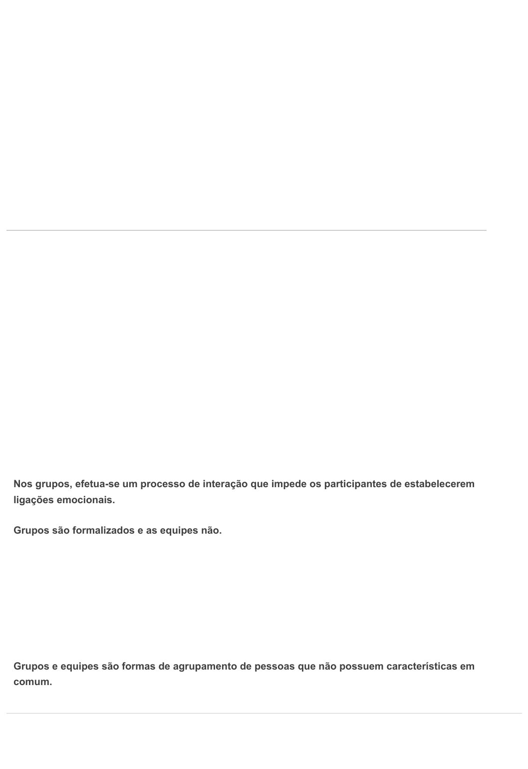Conteúdo do exercício Ocultar opções de resposta Pergunta 1 -- /1 Grupo não é a mesma coisa que equipe! Mas, então, qual a diferença? A metodologia de desenvolvimento de equipes de trabalho é uma decorrência das mudanças nos modos de produção e nas formas de gestão advindas do processo de desenvolvimento do capitalismo. Muitos autores estabelecem diferenças entre grupos e equipes. Nesse sentido, é correto afirmar que: Nos grupos, efetua-se um processo de interação que impede os participantes de estabelecerem ligações emocionais. Grupos são formalizados e as equipes não. Resposta correta Nas equipes, há uma interação que ocorre para partilhar informação e para tomar decisões que ajudem cada membro a alcançar um melhor desempenho. Incorreta: Os grupos são constituídos por pessoas que têm objetivos em comum, mas que não possuem interação entre si. Grupos e equipes são formas de agrupamento de pessoas que não possuem características em comum. 9/10 Nota final Enviado: 10/08/21 02:00 (BRT) Ocultar opções de resposta Ocultar opções de resposta Pergunta 2 -- /1 Ana é gerente de Recursos Humanos de uma empresa e observou que determinado grupo de vendas se destacava dos demais por seus membros se atraírem entre si e mostrarem motivação a permanecer como grupo. Contudo, esse grupo é bastante resistente a mudanças. Considerando apenas essas informações, podemos explicar o comportamento desse grupo por meio de qual elemento presente na estrutura de grupos? Assinale a alternativa que responde corretamente a esse questionamento. Papel. Normas. Cooptação. Status. Resposta corretaCoesão. Pergunta 3 -- /1 O comportamento de um grupo é reflexo da combinação das variáveis que correspondem aos elementos da estrutura de grupos (papel, normas, status, tamanho e coesão). A respeito dos reflexos das combinações dessas variáveis no comportamento do grupo, é correto afirmar que: Alguns grupos de trabalho são coesos por serem grandes e as pessoas passarem menos tempos juntas. As pessoas com baixo status tendem a ser membros mais assertivos do grupo. Grupos menores são mais rápidos na realização de tarefas. As pessoas cujas contribuições são importantes para o sucesso do grupo tendem a ser detentoras de um baixo status. Ocultar opções de resposta Resposta corretaIndivíduos de maior status costumam ter mais liberdade para se desviar das normas. Pergunta 4 -- /1 A coesão é uma das variáveis que estruturam os grupos, e essa variável está diretamente ligada a produtividade e as normas de desempenho estabelecidas. A respeito da relação existente entre coesão, normas e produtividade analise as afirmações a seguir: I. Em um grupo pouco coeso e em que as normas estabelecerem níveis elevados, a produtividade será alta. II. Quando em um grupo tanto a coesão como as normas de desempenho são fracas, a produtividade tende a atingir níveis mais elevados. A respeito de I e II, é correto afirmar que: I e II são afirmações corretas e a II justifica a primeira. Apenas a afirmação II é correta. I e II são afirmações corretas, mas a II contradiz a primeira. Resposta corretaApenas a afirmação I é correta. I e II são afirmações corretas. Pergunta 5 -- /1 Tiago é um líder que está monitorando o comportamento de sua equipe. Para tanto, ele parte dos princípios do modelo de cinco estágios do desenvolvimento dos grupos e equipes. Tiago notou que sua equipe, no estágio atual, começou a presentar coesão, fato que até então não era manifestado no comportamento da equipe analisada. Diante apenas dessas informações, é possível afirmar corretamente que a equipe monitorada por Tiago está em que fase de desenvolvimento diante do modelo supracitado? Assinale a alternativa que responde corretamente a esse questionamento. Ocultar opções de resposta Ocultar opções de resposta Tormenta, porque Tiago observou vários conflitos internos entre os membros da equipe. Globalização, porque Tiago verificou que os membros compartilham valores e crenças. Desempenho, porque Tiago, ao medir o desempenho da equipe, identificou que esta tem a cada dia aumentado seus resultados. Resposta correta Normatização, porque Tiago notou que se desenvolvem os relacionamentos mais próximos entre os membros, de modo que se percebe forte sentido de identidade coletiva e de camaradagem. Formação, porque Tiago notou que os indivíduos ainda estão sendo apresentado uns aos outros. Pergunta 6 -- /1 No contexto das organizações, as decisões em grupo são muito valorizadas, contudo a forma com que são conduzidas dentro dos grupos surtem reflexos no seu comportamento. Grupos podem ir de encontro às mudanças organizacionais caso não participem das decisões a esse respeito. Pode-se ainda verificar o perfil de responsabilidade de unidade de grupo quando se observa que seus membros se responsabilizam por igual a respeito dos resultados das decisões. Portanto, para conduzir decisões em grupo, é necessário conhecer as desvantagens disso. Qual das opções abaixo é um exemplo correto das desvantagens da decisão em grupo? Assinale a alternativa que responde corretamente a esse questionamento. Dificuldade de aceitação dos membros a novas decisões. Maior diversidade de pontos de vista. Restrição na geração do conhecimento. Decisões rápidas. Resposta corretaAmbiguidade de responsabilidades. Ocultar opções de resposta Ocultar opções de resposta Pergunta 7 -- /1 Em relação aos papéis, sabemos que as equipes possuem vários objetivos e/ou necessidades e, em consequência disso, os membros dos grupos devem desempenhar papéis que atendam a todas essas demandas. Nesse sentido, e com base apenas nessas informações, é correto afirmar que Carlos na posição de um membro um membro impulsor/organizador: É um indivíduo gerador de conflitos existenciais nas equipes. É responsável por promover ideias e não pela estrutura necessária para prati