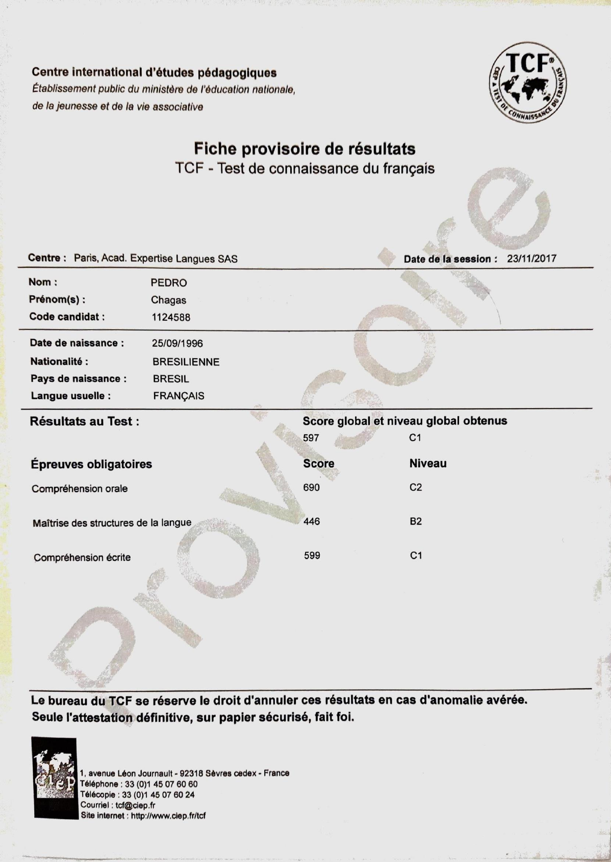 TCF%Centre international d'études pédagogiques Établissement public du ministètv de l'éducation nationale, de la jeunesse et de la vie associative Fiche provisoire de résultats TCF - Test de connaissance du français Centre : Paris, Acad. Expertise Langues SAS Nom : Prénom(s) : Code candidat : Date de naissance : Nationalité : Pays de naissance : Langue usuelle : PEDRO Chagas 1124588 25/09/1996 BRESILIENNE BRESIL FRANÇAIS Date de la session : 23/11/2017 Score global et niveau global obtenusRésultats au Test : Épreuves obligatoires Compréhension orale Maîtrise des structures de la langue Compréhension écrite 597 Score 690 446 599 Niveau 82 Cl Le bureau du TCF se réserve le droit d'annuler ces résultats en cas d'anomalie avérée. Seule l'attestation définitive, sur papier sécurisé, fait foi. 1 , avenue Léon Journault - 92318 Sèvres cedex - France Téléphone : 33 (0)1 45 07 60 60 Télécopie : 33 (0)1 45 07 60 24 Courriel : tcf@ciep.fr Site internet : http://www.ciep,fr/tcf