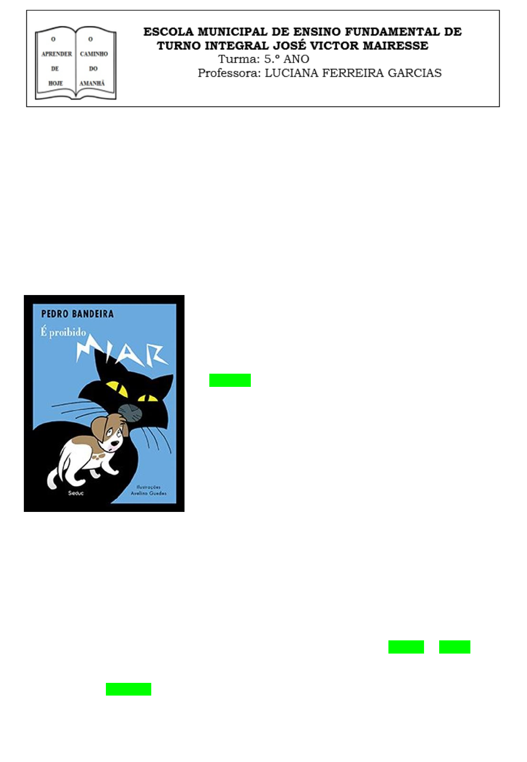 Atividades escolares para a semana de 21 a 25 de junho de 2021 • Quaisquer dúvidas, é só chamar. Dia 21 de junho de 2021 – Segunda-feira – Linguagem 1 – Cole e depois leia com muita atenção o texto a seguir: 2 – Após colar e ler cole uma por uma as atividades e responda com base no texto É PROIBIDO MIAR Os cachorrinhos já estavam bem crescidos e estava chegando a hora de Dona Gingona mostrar para Seu Bingão como ia bem a educação daquela cachorradinha que havia de continuar a tradição dos vira-latas de respeito. O tempo dos ‘’iap-iap’’ tinha chegado ao fim. Era preciso mostrar ao chefe da família que os filhotes estavam se tornando vira-latas de verdade e que a voz deles se encaminhava para impor o respeito que deles se esperava. O Seu Bingão postou-se de patas cruzadas, com aquele jeitão de pai que se prepara pra assistir o filho declamar um versinho e finge que nem está ligando. Todos os cachorrinhos estavam excitadíssimos. Cada um apostava que ia se sair melhor que o outro e tratava de empurrar , para ser o primeiro da fila . Dona Bingona, depois de muito trabalho , conseguiu alguma ordem e começou a exibir as qualidades de cada filho. O latido do primeiro cachorrinho , fracote e tímido , mas muito simpático , provocou a resposta muda de um piscar de olhos seco, mas aprovador , por parte do patriarca da cachorrada . Veio mais um , mais safadinho , latindo animadamente , com uma voz fina de cachorrinho novo. E veio outro ,com um latido um bocadinho só mais forte, mas suficiente para receber um rosnar orgulhoso do pai. Aí chegou a vez de Bingo. O cachorrinho com o rabo pra lá e pra cá, deu uns pulinhos até Seu Bingão e aplicou-lhes a mais molhada lambida de que era capaz. Com autoridade que se esperava , o pai empurrou delicadamente o filho com o focinho e ficou à espera. Bingo sentou-se sobre as patas traseiras, língua de fora e aquele olhar sapeca que todos conheciam muito bem. A família estava á espera , mas Bingo não deixou a espera ficar muito comprida. Preparou-se e soltou o mais sonoro: -- ‘’Miaau!’’ Horror! Alvoroço! Pandemônio! Coisa nunca vista! Enquanto os filhotes ficavam sem saber o que estava acontecendo e Dona Bingona fingia uma espécie de desmaio de cachorro, Seu Bingão levantou-se como se tivessem jogado um balde de água gelada em suas costas. Que brincadeira era aquela? A expressão de fogo nos olhos do pai deixou o pequeno Bingo morto de medo e cheio de surpresa. Não tinham gostado do seu miado? Por quê? Ele tinha caprichado tanto... Pois é. Parece que não tinham gostado. Bingo não se lembrava de ter visto o pai tão zangado. De olhos arregalados, toda a pose perdida, Seu Bingão nem sabia o que pensar.Como? Um filho dele? Miando? Onde estava aquele latido destinado a meter medo a toda a maldita raça dos felinos de todas as cores e capaz de fazer correr todos os carteiros? Não! Aquilo ele não podia admitir.O que diriam dele? O que diria o Fritz, aquele pastor alemão antipático? O que seria da sua honrada linhagem dos vira-latas de respeito? Tão bravo estava Seu Bingão , tão nervosa estava Dona Bingona ,que todos os filhotes se assustaram . E todos , ao mesmo tempo , puseram –se a ganir ,desconsoladamente. A um canto , lá estava Bingo. Sozinho ,rabo entre as pernas ,orelhinhas murchas. Pedro Bandeira. É proibido miar . São Paulo: Moderna, 1983. P.14 1- O texto que você leu é narrativo. Que momento da história dessa família está sendo narrado nesse texto? 2 - O texto apresenta uma família de cachorros. Qual a expectativa dos pais em relação aos filhotes? 3- O que significa dizer que ‘’ o tempo doas ‘iap-iap ‘ tinha chegado ao fim’’? 4 - Antes de se apresentar , Bingo foi até o pai e deu-lhe uma lambida molhada. a) O que essa atitude revela sobre Bingo? b) Qual é a reação de Seu Bingão, o pai? 5- Analise a apresentação de Bingo. a) No que ela foi diferente? b) O que você achou da apresentação do cachorrinho? 6 - Em sua opinião, por que o miado de Bingo incomodou tanto os seus pais? VOCABULÁRIO Fracote : um pouco fraco , que deixa a desejar. Tímido: inseguro , acanhado , que tem temor. Patriarca : homem que governa uma família, clã ou tribo. Alvoroço : agitação , tumulto. Pandemônio : alvoroço , confusão ,desordem. 1- Pinte nas palavras a seguir a sílaba tônica de cada uma. 2 - Classifique as seguintes palavras em oxítona, paroxítona e proparoxítona. a) rapidamente; ____________________________________________________________ b) açúcar; ____________________________________________________________ c) ali; ____________________________________________________________ d) tabu; ____________________________________________________________ e) sótão; ____________________________________________________________ f) vírus; ____________________________________________________________ g) dinâmico; _____________________________________________________________ h) aipim; ____________________________________________________________ i) menu; ____________________________________________________________ j) trôpego. _____________________________________________________________ Dia 22 de junho de 2021 – Terça-feira – Ciências Humanas 1 – Cole e depois leia com muita atenção o texto a seguir: 2 – Após colar e ler cole uma por uma as atividades e responda com base no texto BRASIL O país em que vivemos chama-se Brasil. Ele está dividido em Estados e um Distrito Federal. No Distrito Federal localiza-se a cidade de Brasília, a capital do Brasil. Nosso país é muito grande, possui 8.511.956 Km2 de área. Para facilitar a administração, o estudo e a compreensão das características comuns, os Estados e o Distrito Federal foram agrupados em cinco regiões: Norte, Nordeste, Centro- Oeste, Sul e Sudeste. Os estados brasileiros são divididos em espaços menores chamados municípios. A região Centro-Oeste limita-se com todas as outras regiões do país