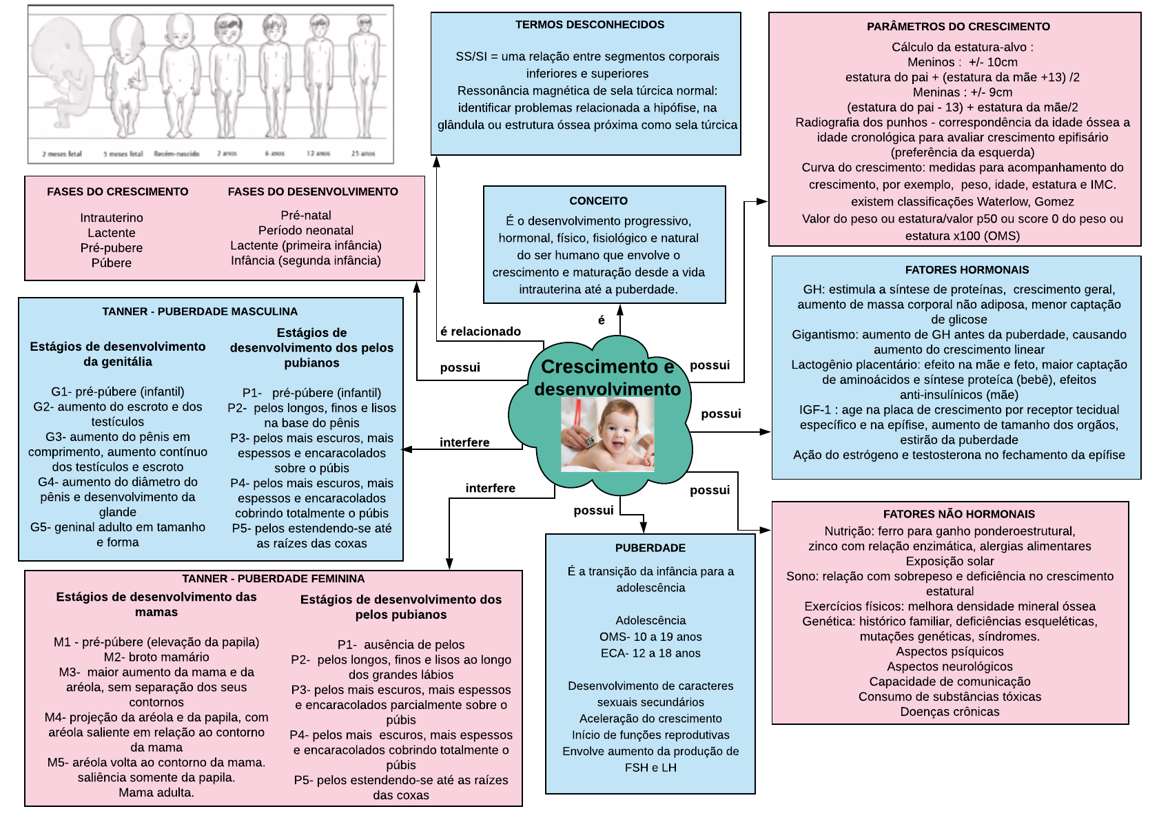 é possui SS/SI = uma relação entre segmentos corporais inferiores e superiores Ressonância magnética de sela túrcica normal: identificar problemas relacionada a hipófise, na glândula ou estrutura óssea próxima como sela túrcica Crescimento e desenvolvimento É o desenvolvimento progressivo, hormonal, físico, fisiológico e natural do ser humano que envolve o crescimento e maturação desde a vida intrauterina até a puberdade. Pré-natal Período neonatal Lactente (primeira infância) Infância (segunda infância) possui possui possui é relacionado interfere TERMOS DESCONHECIDOS Estágios de desenvolvimento dos pelos pubianos P1- ausência de pelos P2- pelos longos, finos e lisos ao longo dos grandes lábios P3- pelos mais escuros, mais espessos e encaracolados parcialmente sobre o púbis P4- pelos mais escuros, mais espessos e encaracolados cobrindo totalmente o púbis P5- pelos estendendo-se até as raízes das coxas Intrauterino Lactente Pré-pubere Púbere É a transição da infância para a adolescência Adolescência OMS- 10 a 19 anos ECA- 12 a 18 anos Desenvolvimento de caracteres sexuais secundários Aceleração do crescimento Início de funções reprodutivas Envolve aumento da produção de FSH e LH PUBERDADE GH: estimula a síntese de proteínas, crescimento geral, aumento de massa corporal não adiposa, menor captação de glicose Gigantismo: aumento de GH antes da puberdade, causando aumento do crescimento linear Lactogênio placentário: efeito na mãe e feto, maior captação de aminoácidos e síntese proteíca (bebê), efeitos anti-insulínicos (mãe) IGF-1 : age na placa de crescimento por receptor tecidual específico e na epífise, aumento de tamanho dos orgãos, estirão da puberdade Ação do estrógeno e testosterona no fechamento da epífise CONCEITO FASES DO CRESCIMENTO FASES DO DESENVOLVIMENTO FATORES HORMONAIS FATORES NÃO HORMONAIS Nutrição: ferro para ganho ponderoestrutural, zinco com relação enzimática, alergias alimentares Exposição solar Sono: relação com sobrepeso e deficiência no crescimento estatural Exercícios físicos: melhora densidade mineral óssea Genética: histórico familiar, deficiências esqueléticas, mutações genéticas, síndromes. Aspectos psíquicos Aspectos neurológicos Capacidade de comunicação Consumo de substâncias tóxicas Doenças crônicas PARÂMETROS DO CRESCIMENTO possui Cálculo da estatura-alvo : Meninos : +/- 10cm estatura do pai + (estatura da mãe +13) /2 Meninas : +/- 9cm (estatura do pai - 13) + estatura da mãe/2 Radiografia dos punhos - correspondência da idade óssea a idade cronológica para avaliar crescimento epifisário (preferência da esquerda) Curva do crescimento: medidas para acompanhamento do crescimento, por exemplo, peso, idade, estatura e IMC. existem classificações Waterlow, Gomez Valor do peso ou estatura/valor p50 ou score 0 do peso ou estatura x100 (OMS) TANNER - PUBERDADE FEMININA Estágios de desenvolvimento dos pelos pubianos P1- pré-púbere (infantil) P2- pelos longos, finos e lisos na base do pênis P3- pelos mais escuros, mais espessos e encaracolados sobre o púbis P4- pelos mais escuros, mais espessos e encaracolados cobrindo totalmente o púbis P5- pelos estendendo-se até as raízes das coxas TANNER - PUBERDADE MASCULINA interfere Estágios de desenvolvimento das mamas M1 - pré-púbere (elevação da papila) M2- broto mamário M3- maior aumento da mama e da aréola, sem separação dos seus contornos M4- projeção da aréola e da papila, com aréola saliente em relação ao contorno da mama M5- aréola volta ao contorno da mama. saliência somente da papila. Mama adulta. Estágios de desenvolvimento da genitália G1- pré-púbere (infantil) G2- aumento do escroto e dos testículos G3- aumento do pênis em comprimento, aumento contínuo dos testículos e escroto G4- aumento do diâmetro do pênis e desenvolvimento da glande G5- geninal adulto em tamanho e forma Mapa de pediatria Página 1