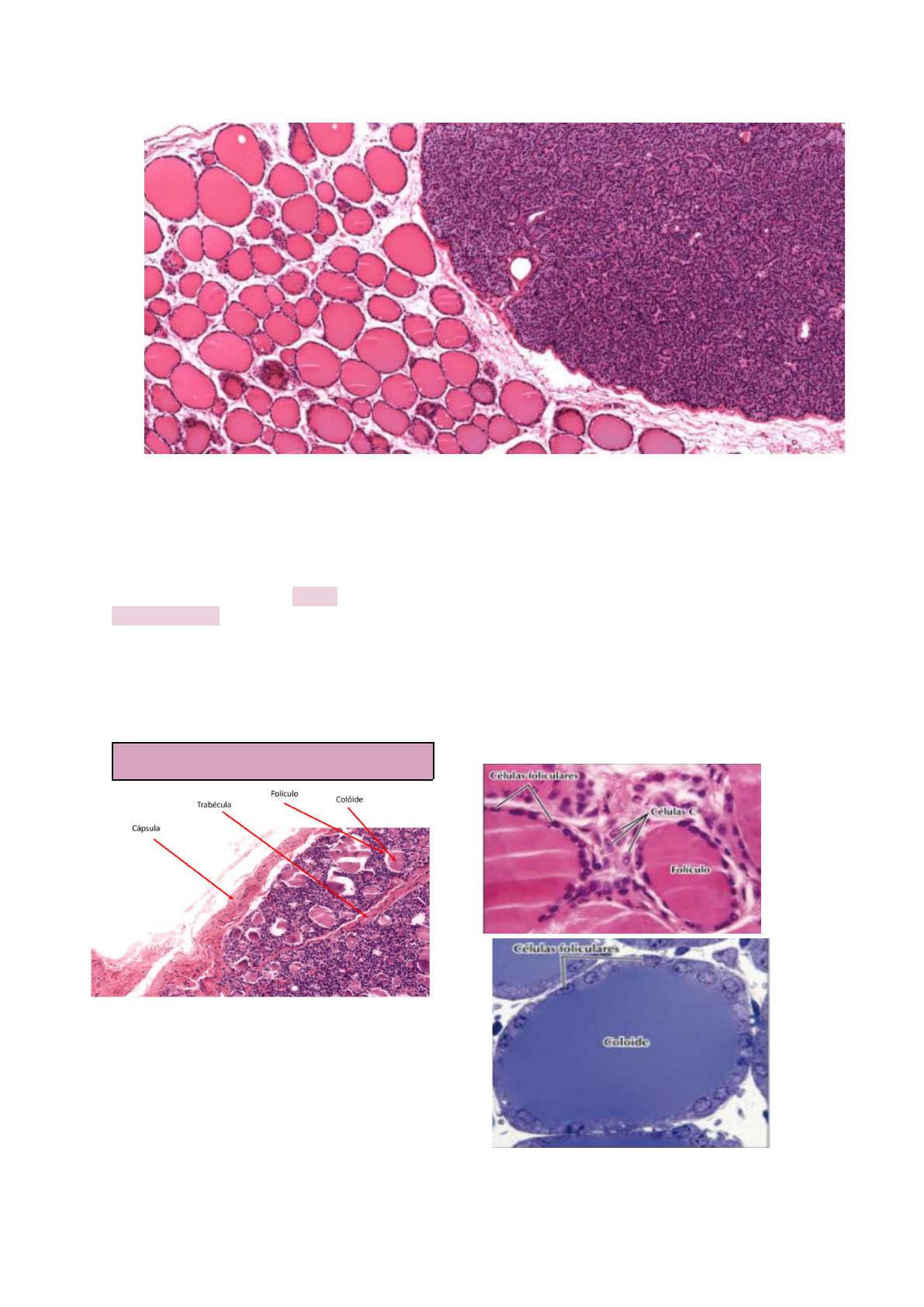 �reóid� � Paratireóid� Trabéculas e Cápsulas da Tireóide e Paratireóide: formadas por tecido conjuntivo denso → Endoderma: dá origem ao parênquima da tireóide e da paratireoide → Mesoderma: dá origem ao estroma da tireóide e dá para tireóide Glândula Tireóide Trabéculas - tecido conjuntivo denso - suporte interno - suprimento vascular e nervoso Fazem parte do parênquima tireoidiano: - Células Foliculares: produzem T3, T4 (não são nem hidro nem lipossolúveis) - Células C/Parafoliculares (ficam entre os folículos tireoideanos: produzem calcitonina - Epitélio folicular: epitélio simples cúbico A. Células quando estão hiperativas: células encontram-se mais altas/ células cubóides altas B. Células quando estão hipoativas: células mais achatadas/ cubóide baixo �reóid� � Paratireóid� - Capilares entre os folículos: capilares fenestrados - Entre os folículos há tecido conjuntivo frouxo - A tireoglobulina fica armazenada no colóide (cora com eosina). A porção basal retira iodeto da corrente sanguínea e é enviado para o colóide. → Cápsula: tecido conjuntivo denso Glândula Paratireóide Cápsula: tecido conjuntivo denso Trabéculas - tecido conjuntivo denso - suprimento vascular e nervoso Células principais - apresentam formato poliedro (coram melhor com hematoxilina - ligeiramente basófilas) - secretam PTH (estímulo é a hipocalcemia) Células oxífilas - aparecem após a primeira década de vida - podem estar isoladas ou em agregados - se coram melhor com eosina - ligeiramente acidófilas - possuem genes importantes para o bom funcionamento da paratireóide - não são secretoras do PTH. Adipócitos Capilares - fenestrados, entremeados às células parenquimatosas Resumo 1. Glândula Tireóide 2. Glândula Paratireóide �reóid� � Paratireóid� Glândula Tireóide 1. Células C/ parafoliculares: produzem calcitonina 2. Células Foliculares: formam o epitélio simples cúbico; secretam T3 e T4 3. Colóide Glândula Paratireóide 1. Células Principais: levemente basófilas; secretam PTH 2. Células oxífilas: não secretam hormônio