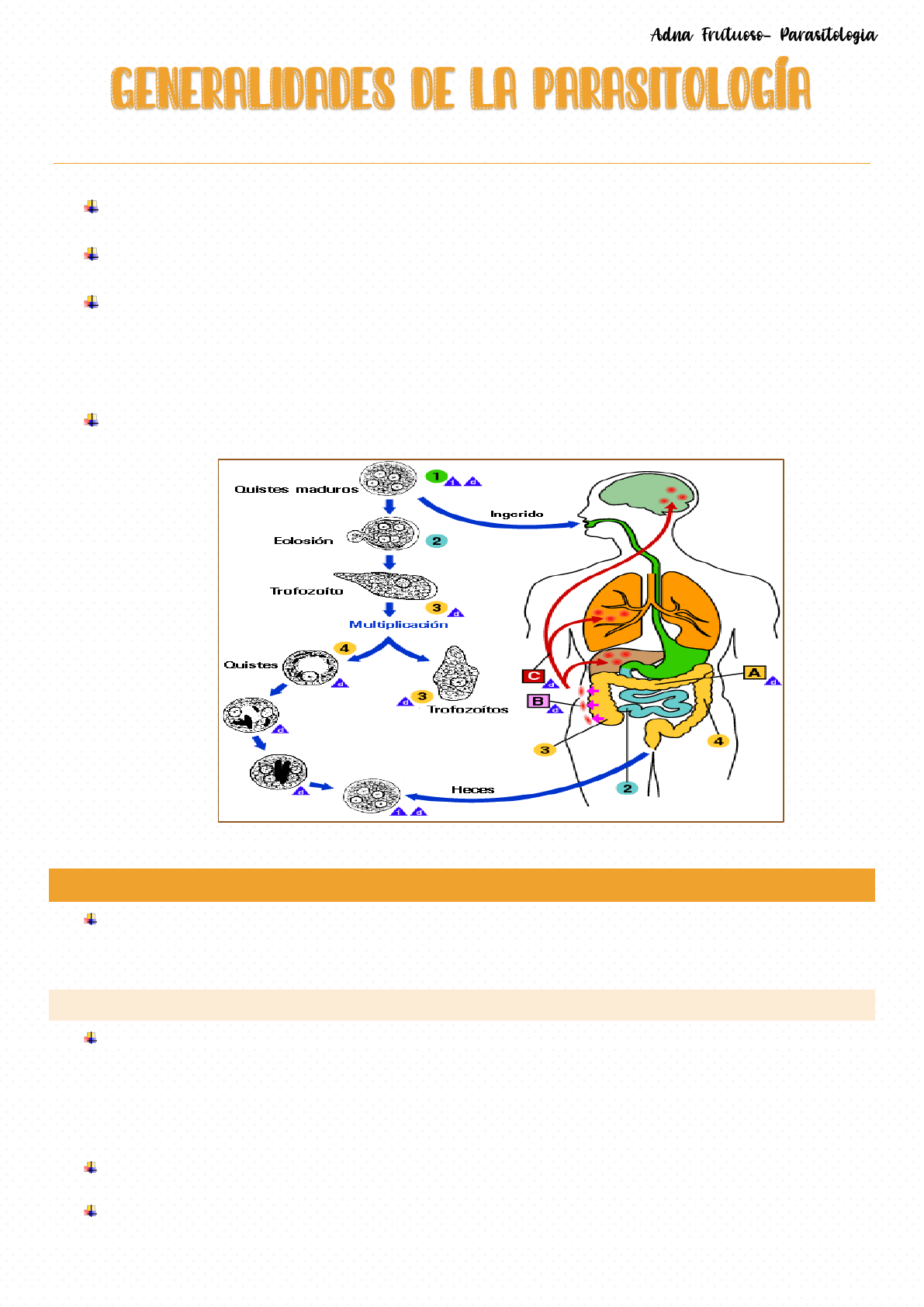 DEFINICIÓN Es la parte de la biología que estudia los parásitos y su relación con el hospedante, especialmente con el ser humano, como también puede ser frutas, verduras o otros animales. El parasito en su mayoría de la vez entra en el cuerpo humano por la boca, como también puede contaminarse por la piel, la nariz, por las partes genitales. Tiene muchos parásitos que se quedan en el intestino delgado, y ahí se multiplican y mueren. Otros pasan hasta el intestino grueso, y ahí se multiplican, luego algunos de esos parásitos pueden pasar juntamente con los desechos fecales y sale del cuerpo. Además, los que no sale por las heces, van para el medio interno del ser humano, de ahí puede pasar por el hígado, vesícula, pulmón, músculos, cerebro, bazo. La Síndrome de Loeffler que es causada por parasitas intestinales que invaden los pulmones, y causan problemas similares a una neumonía, y se puede llamar neumonías atípicas. GENERALIDADES Parásito es todo ser vivo animal o vegetal, que pasa una parte o la totalidad de su existencia en el interior o en el exterior de otro ser vivo más importante que él, a expensas del cual se nutre, causándole o no daños aparentes o inaparentes. (Kouri - 1948) ASPECTOS HISTÓRICOS Desde la antigüedad los pueblos de todas las culturas han tratado de explicar las causas de la enfermedad y muerte, combinando conceptos: ❖ Religiosos; ❖ Demoniacos; ❖ Mágicos; ❖ Astrológicos. Aristóteles (384 – 322 A.C.) describió y clasificó un grupo de gusanos (helmintos) intestinales. ❖ Otros como: Plinio el viejo y Galeno estudiaron parásitos humanos y animales. En la edad Media el sabio Avicena elaboró en Persia un tratado completo sobre helmintos y nematodos y métodos para combatirlos y curarlos. Francesco Redi (1686) y luego Lázaro Spallanzani (1729-1799) usaron parásitos como evidencia para refutar la teoría de la generación espontánea. Desde entonces cada parásito tiene su anécdota; a finales del siglo XIX, por ejemplo, se descubrió la Malaria y su vector. Malmsten (1857) y Stein (1862) (Suizos) descubren el Balantidium coli, que es uno de los protozoarios más grandes y que habita en los intestinos del cerdo. ❖ Protozoario es un parásito unicelular. ASOCIACIONES BIOLÓGICAS Los parásitos son los únicos seres vivos capaces de sintetizar sus propios componentes. PARASITISMOS: asociación biológica entre dos especies vivas diferentes, donde una de ellas, el parásito, vive a expensas de la otra (huésped u hospedador), obteniendo de éste nutrientes y protección física, al cual puede eventualmente producir daño. ❖ El parásito es metabólicamente dependiente del hospedador COMENSALISMO: asociación biológica entre dos especies diferentes, en la cual uno de ellos, llamado comensal, se beneficia obteniendo nutrientes y protección física de otro organismo, llamado hospedador, generalmente de mayor tamaño, pero sin causarle daño. ❖ El comensal no es metabólicamente dependiente del hospedador. INQUILINISMO: Asociación de dos animales de especies diferentes en que uno de ellos sirve de refugio o cobijo al otro sin recibir ningún beneficio de él. OPORTUNISMO: Se refiere a los microorganismos, que, por lo general, no causan patología en los huéspedes inmunológicamente normales, pero invaden, cuando existe una alteración del estado inmune. ❖ Ejemplo: Cryptosporidium en pacientes con SIDA y VHI. SIMBIOSIS: Sucede cuando dos especies diferentes se asocian para obtener beneficio mutuo, sin el cual no pueden subsistir (ej. comejenes, los cuales, al no poseer enzimas digestivas, se asocian con ciertos protozoos o bacterias simbióticas, que en su tubo digestivo trasforman la celulosa en azúcar, proporcionando alimento para ambos). RESERVORIO: hombre, animales, plantas o materia inanimada, que contengan parásitos u otros microorganismos que puedan vivir y multiplicarse en ellos, y ser fuente de infección para un huésped susceptible. ❖ Ejemplo: Hombre, principal reservorio en las parasitosis humanas. PORTADOR: Estado de adaptación animal, en el cual el microorganismo patógeno vive en el huésped sin causarle daño, como sucede en 90% de las personas positivas para Entamoeba histolytica. VECTOR: artrópodo u otro animal invertebrado, que trasmite el parásito al huésped, bien sea por inoculación al picar, por depositar el material infectante en la piel o mucosas, o por contaminar alimentos u otros objetos. ❖ Mecánicos: Transportan agentes etiológicos en la parte externa de su cuerpo o a través de la saliva, materias fecales (moscas/ cucarachas). ❖ Biológicos: Se alimentan de sangre, con lo que ingiere los microorganismos que se multiplican en su interior (mosquitos/ jejenes/ flebótomos/ chinches/ piojos/ pulgas/ ácaros/ garrapatas). Demonstración do que la enfermedad de Chagas puede ocasionar. INFECCIONES PARASITARIAS Sucede cuando el huésped tiene parásitos que no le causan enfermedad, lo cual constituye el estado de portador sano. ❖ Ejemplo: presencia de amebas no patógenas como Entamoeba coli. ENFERMEDAD PARASITARIA Cuando el huésped sufre alteraciones patológicas y sintomatología producidas por parásitos. ❖ Ejemplo: Enfermedad de Chagas → (trypanosoma cruzi) ZOONOSIS PARASITARIA Cuando parásitos de animales vertebrados se trasmiten al hombre (Teniasis, en la cual el cerdo o el ganado vacuno tienen la forma parasitaria en los músculos). También se consideran zoonosis las parasitosis que se presentan tanto en el hombre como en los animales, como en el caso de la tripanosomiasis, existente en animales salvajes y en los humanos. Ocurre cuando el animal como la vaca o buey tiene el parasita y luego el humano vaya a se alimentar de ello, luego también vaya tener el parasita en su cuerpo, o sea cuando los parásitos de los animales se transmiten a los seres humanos a través de la carne. CONCEITOS ENDEMIA Presencia habitual de una enfermedad en una zona geográfica. Cuando su fre