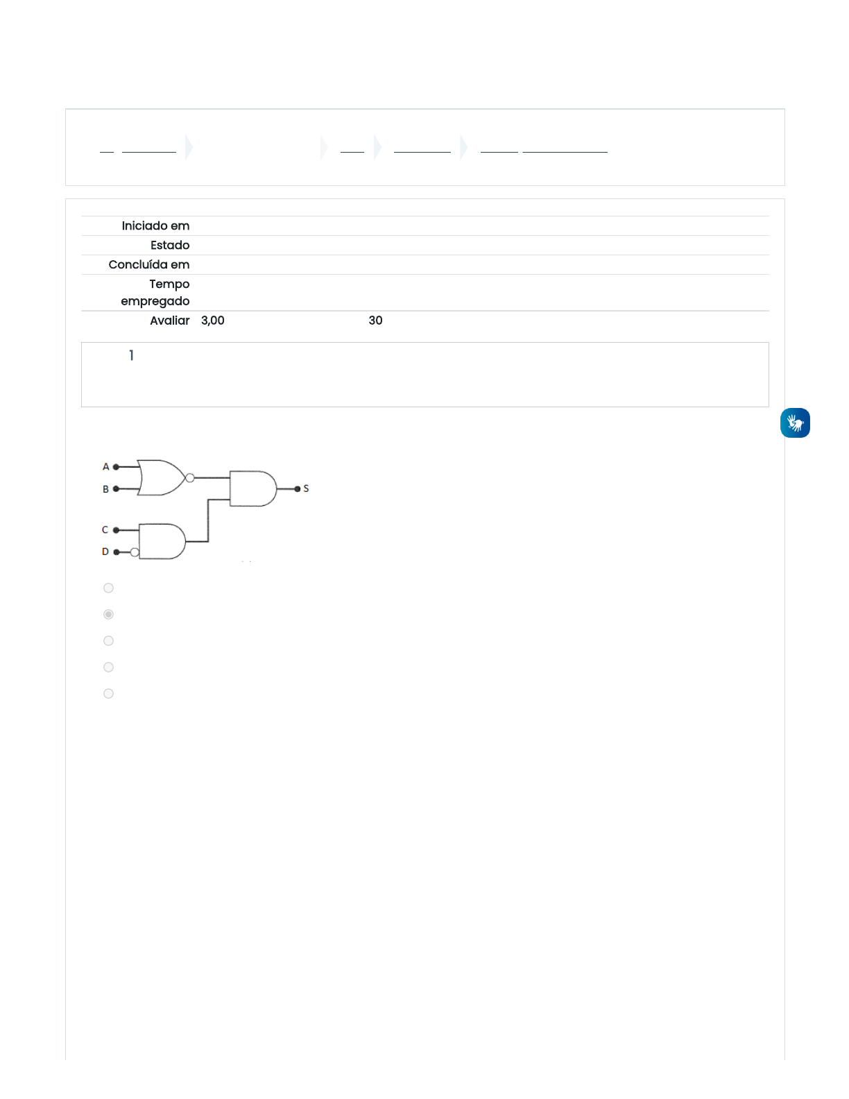 15/02/2021 Avaliação - Unidade II: Revisão da tentativa https://ambienteonline.uninga.br/mod/quiz/review.php?attempt=119417&cmid=6748 1/7 Página inicial Minhas disciplinas 0122 UNIDADE II Avaliação - Unidade II Iniciado em segunda, 8 fev 2021, 14:05 Estado Finalizada Concluída em segunda, 15 fev 2021, 16:52 Tempo empregado 7 dias 2 horas Avaliar 3,00 de um máximo de 10,00(30%) Questão 1 Completo Atingiu 0,00 de 1,00 Qual a combinação de entradas ativa a saída S do circuito abaixo: a. A= 0, B= 0, C= 1 e D = 0 b. A= 0, B= 0, C= 1 e D = 1 c. A= 1, B= 0, C= 1 e D = 0 d. A= 0, B= 1, C= 1 e D = 0 e. A= 1, B= 0, C= 1 e D = 0 A resposta correta é: A= 0, B= 0, C= 1 e D = 0. https://ambienteonline.uninga.br/ https://ambienteonline.uninga.br/course/view.php?id=124 https://ambienteonline.uninga.br/course/view.php?id=124§ion=5 https://ambienteonline.uninga.br/mod/quiz/view.php?id=6748 15/02/2021 Avaliação - Unidade II: Revisão da tentativa https://ambienteonline.uninga.br/mod/quiz/review.php?attempt=119417&cmid=6748 2/7 Questão 2 Completo Atingiu 0,00 de 1,00 Questão 3 Completo Atingiu 0,00 de 1,00 Qual a expressão booleana para o circuito abaixo: a. b. c. d. e. S = ( ). ( )A+B ¯ ¯¯̄ ¯̄¯̄ ¯̄ ¯̄¯ B+C ¯ ¯¯̄¯ ¯¯̄ ¯̄¯̄ ¯̄¯̄ ¯̄ S = ( ). ( )AB ¯ ¯¯̄¯̄¯̄ BC ¯ ¯¯̄¯ ¯¯̄ ¯̄¯̄ S = ( ). ( )AB ¯ ¯¯̄¯̄¯̄ B+C ¯ ¯¯̄¯ ¯¯̄ ¯̄¯̄ ¯̄¯̄ ¯̄ S = ( ). ( )AB¯ ¯¯̄¯̄¯̄ BC¯ ¯¯̄¯̄¯̄ S = ( ). ( )A+B ¯ ¯¯̄ ¯̄¯̄ ¯̄ ¯̄¯ BC ¯ ¯¯̄¯ ¯¯̄ ¯̄¯̄ A resposta correta é: .S = ( ). ( )A+B¯ ¯¯̄ ¯̄¯̄ ¯̄ ¯̄¯ BC¯ ¯¯̄ ¯ ¯¯̄ ¯̄¯̄ Qual a expressão booleana para o circuito abaixo: a. b. c. d. e. S = B +ABCA ¯ ¯¯̄ C ¯ ¯¯̄ S = +ABABC ¯ ¯¯̄¯̄ ¯̄ ¯̄¯ C ¯ ¯¯̄ S =AB +ABC ¯ ¯¯̄ C ¯ ¯¯̄ S = +ABCABC ¯ ¯¯̄¯̄ ¯̄ ¯̄¯ S = B +ABA¯ ¯¯̄ C¯ ¯¯̄ C¯ ¯¯̄ A resposta correta é: .S = B +ABA¯ ¯¯̄ C¯ ¯¯̄ C¯ ¯¯̄ 15/02/2021 Avaliação - Unidade II: Revisão da tentativa https://ambienteonline.uninga.br/mod/quiz/review.php?attempt=119417&cmid=6748 3/7 Questão 4 Completo Atingiu 0,00 de 1,00 Questão 5 Completo Atingiu 1,00 de 1,00 Qual a simplificação para a expressão: a. A b. 1 c. d. 0 e. Não é possível simplificar. A.A ¯ ¯¯̄ A ¯ ¯¯̄ A resposta correta é: 0. Qual a simplificação para a expressão: B+BC a. B b. Não é possível simplificar. c. d. 1 e. 0 B ¯ ¯¯̄ A resposta correta é: B. 15/02/2021 Avaliação - Unidade II: Revisão da tentativa https://ambienteonline.uninga.br/mod/quiz/review.php?attempt=119417&cmid=6748 4/7 Questão 6 Completo Atingiu 1,00 de 1,00 Questão 7 Completo Atingiu 1,00 de 1,00 Quantas combinações possíveis de entradas para uma porta NAND de 3 entradas, produzem uma saída nível lógico 0. a. 7 b. 2 c. 4 d. 1 e. 8 A resposta correta é: 1. Quantas combinações possíveis de entradas para uma porta OR de 4 entradas, produzem uma saída nível lógico 1. a. 12 b. 10 c. 15 d. 16 e. 8 A resposta correta é: 15. 15/02/2021 Avaliação - Unidade II: Revisão da tentativa https://ambienteonline.uninga.br/mod/quiz/review.php?attempt=119417&cmid=6748 5/7 Questão 8 Completo Atingiu 0,00 de 1,00 Questão 9 Completo Atingiu 0,00 de 1,00 Seja duas portas lógicas de duas entradas ligadas em série, onde a saída da primeira porta entra em uma das entradas da outra porta, assim tendo as entradas A, B e C. Se ambas forem iguais porém podendo ser portas AND ou OR e for aplicado um sinal A=1, B=0, C=1 e a saída for S=1. Podemos afirmar que essas portas são: a. AND. b. Não é possível identifica-las. c. Deveria ser aplicado o sinal A=1, B=1 e C=1 para poder identifica-las. d. Deveria ser aplicado o sinal A=0, B=0 e C=1 para poder identifica-las. e. OR. A resposta correta é: OR.. Seja uma porta OR com 2 entradas, se a forma de onde de saída for igual a forma de onda de uma das entradas, isso significa que: a. A forma de onda de uma das entradas é a negação da outra. b. Os níveis baixos da onda de saída não coincide com nenhuma das ondas de entrada. c. Os níveis lógicos altos da entrada que não coincide com a saída, coincide com os níveis altos da onda de saída. d. Os níveis lógicos altos da entrada que não coincide com a saída, não coincidem com os níveis altos da onda de saída. e. Uma das entradas está em nível lógico 1 durante todo o tempo. A resposta correta é: Os níveis lógicos altos da entrada que não coincide com a saída, coincide com os níveis altos da onda de saída.. 15/02/2021 Avaliação - Unidade II: Revisão da tentativa https://ambienteonline.uninga.br/mod/quiz/review.php?attempt=119417&cmid=6748 6/7 Questão 10 Completo Atingiu 0,00 de 1,00 Suponha que a entrada B da figura abaixo entre em curto com a fonte de alimentação (+ 5V), como ficará a onda de saída após esse evento: a. Irá para nível 0 para todo instante de tempo. b. Irá oscilar como a onda de entrada B. c. Permanecerá nível 1 para todo instante de tempo. d. Irá oscilar como a entrada A. e. Permanecerá nível 1 para todo instante de tempo. A resposta correta é: Permanecerá nível 1 para todo instante de tempo.. Atividade anterior ◄ Slides Videoaula 2 Seguir para... Próxima atividade Videoaula 1 ► https://ambienteonline.uninga.br/mod/resource/view.php?id=6745&forceview=1 https://ambienteonline.uninga.br/mod/page/view.php?id=6749&forceview=1 15/02/2021 Avaliação - Unidade II: Revisão da tentativa https://ambienteonline.uninga.br/mod/quiz/review.php?attempt=119417&cmid=6748 7/7 Manter contato UNINGÁ https://www.uninga.br Mobile : 0800 800 5009 https://www.uninga.br/ tel:Mobile : 0800 800 5009 https://www.facebook.com/uninga.edu.br/ https://www.youtube.com/channel/UCFfrZpSpL4DflIFl78P2TSQ https://www.instagram.com/uningaoficial/?hl=pt https://api.whatsapp.com/send?phone=44%2099825-1515