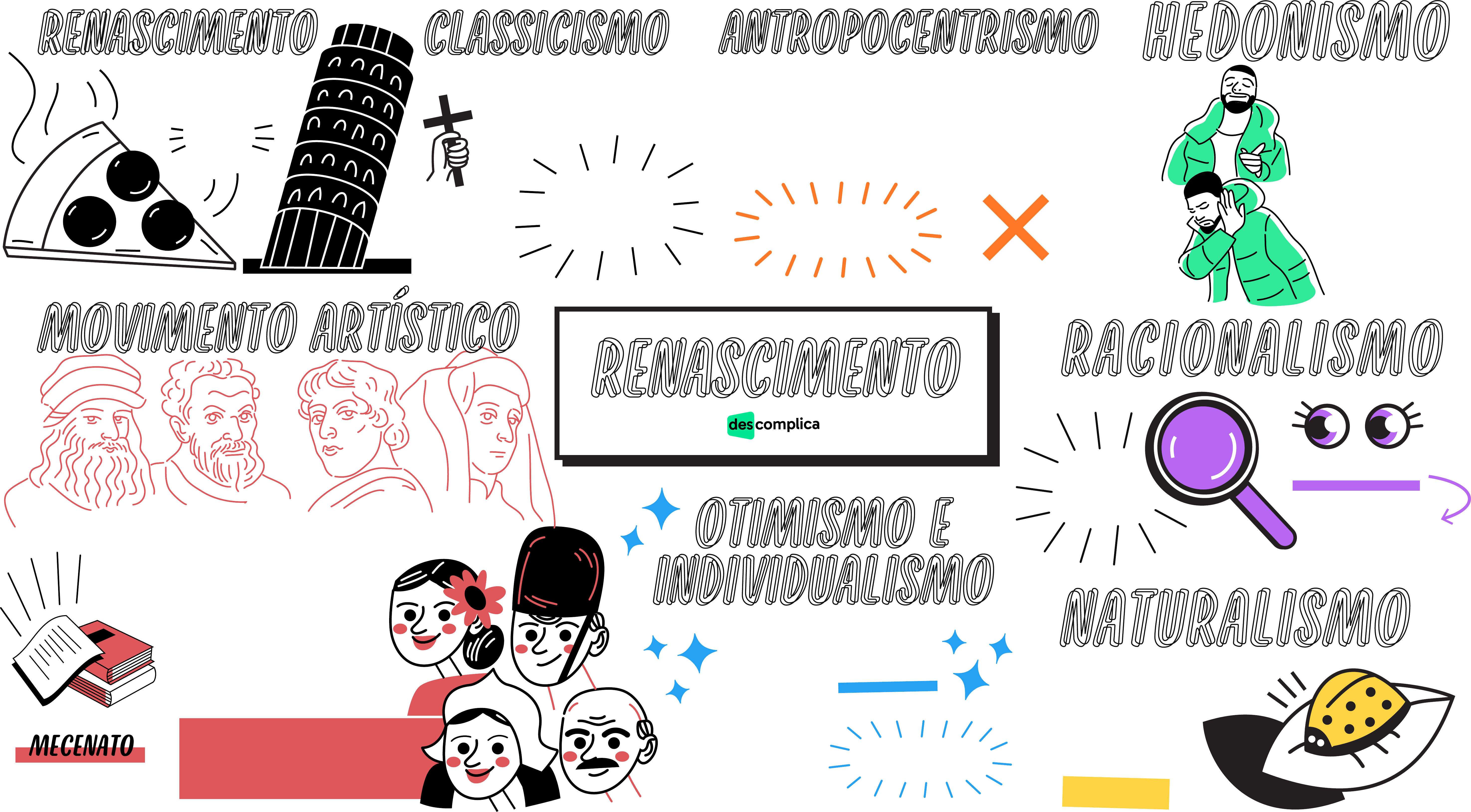 Espanha, Inglaterra Holanda e Portugalnobres mercadores Trecento (séc. XIV) Quattrocento (séc. XV) Cinquecento (séc. XVI) DANTE E CAMÕES Leonardo da Vinci, Michelangelo, Botticelli e Giotto MOVIMENTO ARTÍSTICOMOVIMENTO ARTÍSTICO IndividualistasProgresso social descobertas por conta da sua própria capacidade OTIMISMO E INDIVIDUALISMO OTIMISMO E INDIVIDUALISMO Natureza relação entre o homem e seu meio NATURALISMONATURALISMO observação experimentos RAZÃO HUMANA RACIONALISMORACIONALISMO Prazeres materiais e sensoriais Idade Média HEDONISMOHEDONISMO TeocentrismoPROTAGONISTA “Anthropos” + “kentron” (homem) (centro) ANTROPOCENTRISMOANTROPOCENTRISMO Vontades do homem Igreja Católica conceitos racionais e humanistas CLASSICISMOCLASSICISMO Idade Moderna ITÁLIA RENASCIMENTORENASCIMENTO RENASCIMENTORENASCIMENTO