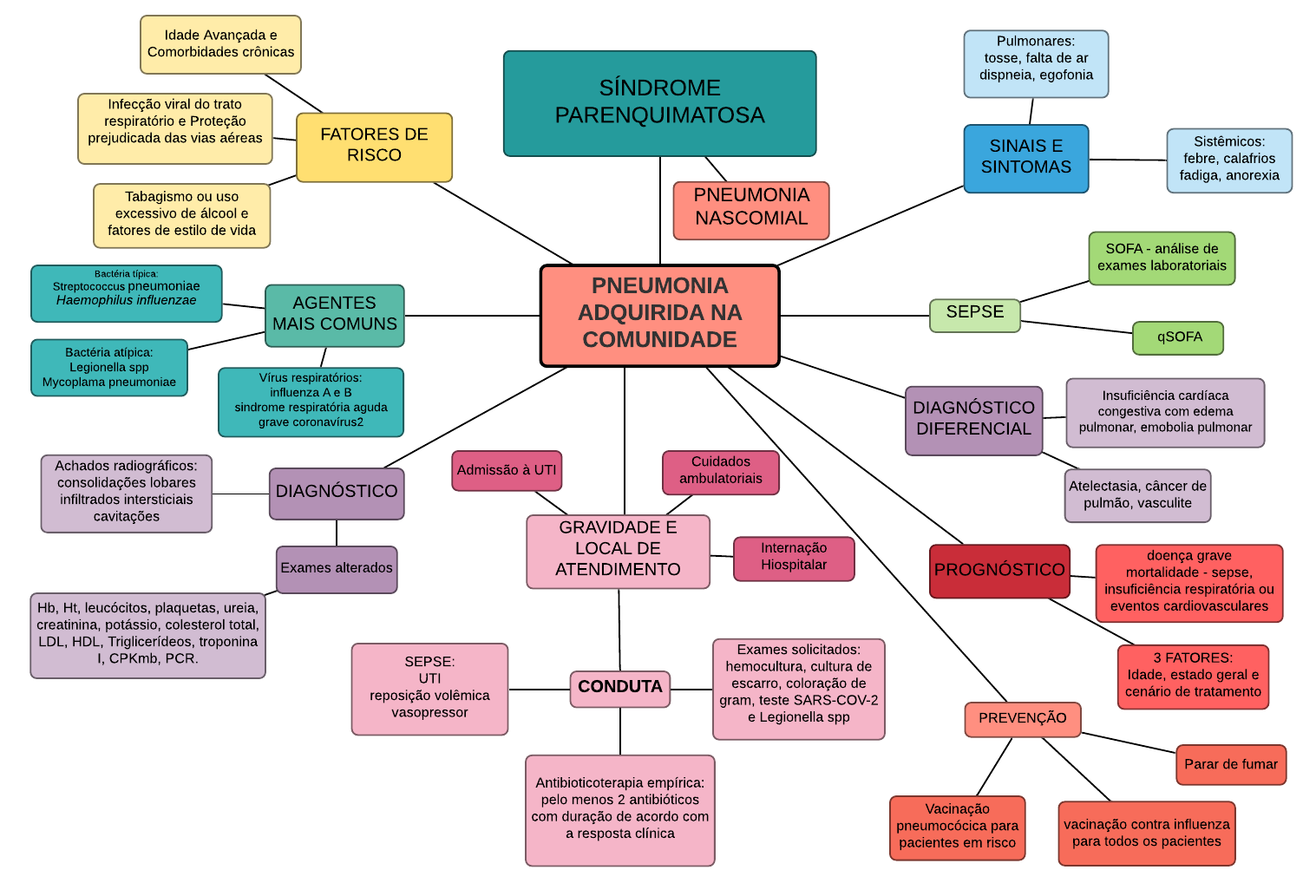 PNEUMONIA ADQUIRIDA NA COMUNIDADE CONDUTA SEPSE: UTI reposição volêmica vasopressor SÍNDROME PARENQUIMATOSA PNEUMONIA NASCOMIAL PROGNÓSTICO SEPSE SINAIS E SINTOMAS FATORES DE RISCO AGENTES MAIS COMUNS Exames solicitados: hemocultura, cultura de escarro, coloração de gram, teste SARS-COV-2 e Legionella spp Antibioticoterapia empírica: pelo menos 2 antibióticos com duração de acordo com a resposta clínica DIAGNÓSTICO DIFERENCIAL DIAGNÓSTICO GRAVIDADE E LOCAL DE ATENDIMENTO Idade Avançada e Comorbidades crônicas Infecção viral do trato respiratório e Proteção prejudicada das vias aéreas Tabagismo ou uso excessivo de álcool e fatores de estilo de vida Bactéria típica: Streptococcus pneumoniae Haemophilus influenzae Bactéria atípica: Legionella spp Mycoplama pneumoniae Vírus respiratórios: influenza A e B sindrome respiratória aguda grave coronavírus2 Pulmonares: tosse, falta de ar dispneia, egofonia Sistêmicos: febre, calafrios fadiga, anorexia SOFA - análise de exames laboratoriais qSOFA Achados radiográficos: consolidações lobares infiltrados intersticiais cavitações Exames alterados Hb, Ht, leucócitos, plaquetas, ureia, creatinina, potássio, colesterol total, LDL, HDL, Triglicerídeos, troponina I, CPKmb, PCR. Insuficiência cardíaca congestiva com edema pulmonar, emobolia pulmonar Atelectasia, câncer de pulmão, vasculite Cuidados ambulatoriais Internação Hiospitalar Admissão à UTI PREVENÇÃO doença grave mortalidade - sepse, insuficiência respiratória ou eventos cardiovasculares 3 FATORES: Idade, estado geral e cenário de tratamento Parar de fumar vacinação contra influenza para todos os pacientes Vacinação pneumocócica para pacientes em risco Mapa Mental Semiologia Mapa mental simples