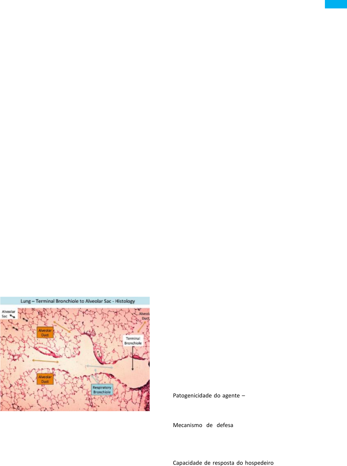 1 AV1 – Anatomia Patológica II – Prof.ª Maria Clara – 4º período – Fernanda Pereira – 2021.1 Pneumonia Brônquio: epitélio pseudoestratificado colunar ciliado Traqueia → brotos pulmonares → subdivisões em brônquios lobares (lado direito são três, enquanto o esquerdo são dois → bronquíolos (não possuem cartilagem) → ramificam em ácino pulmonar (alvéolo, ducto alveolar, e dos bronquíolos respiratórios). O ácino pulmonar é a unidade morfofuncional do pulmão. Alvéolo em sua estrutura O alvéolo são os saquinhos onde ocorre a troca gasosa. O revestimento do alvéolo é formado pelo epitélio pulmonar formado por pneumócitos tipo I e do tipo II. Inferiormente, tem-se o tecido conjuntivo de sustentação com as células intersticiais. Abaixo do TCPD temos o endotélio que tem função vascular. Os macrófagos alveolares são células soltas, células de vigilância, que estão em constante movimento para caso haja um agente infeccioso no pulmão eles cheguem no tecido o mais rápido para proteger a integridade do tecido. Os alvéolos tem pequenos furinhos que são espaços entre alvéolos adjacentes, chamado de poros de Kohn. Esses poros comunicam um alvéolo com outro, permite a passagem de células imunes, nutrientes, ar e, infelizmente, agentes invasores caso o pulmão seja infectado. Então, o poro de Kohn pode contribuir para uma infecção se alastrar. O ácino pulmonar é formado pelo saco alveolar, ducto alveolar e do bronquíolo respiratório. Figura 1: Histologia do ácino pulmonar. O ducto alveolar e o bronquíolo são importantes para transportar o ar para o saco alveolar. Pneumonia é o quadro de infecção do parênquima pulmonar que tenha expressão clínica, ou seja, que dá sinal e dá sintoma. Nas pneumonias os bronquíolos respiratórios e os alvéolos são preenchidos por exsudato inflamatório. A pneumonia intersticial é causada por vírus, e não aparece consolidação. Agentes: fungos, vírus, bactérias (na maioria dos casos pneumococo) e parasitas. A pneumonia pode ocorrer por microrganismos com duas características diferentes: Microrganismo altamente virulento, indivíduo saudável sem nenhuma doença prévia, e de repente ele tem pneumonia. Geralmente, essa pneumonia é causada por um microrganismo de alta virulência (chega e se implanta facilmente no pulmão), destrói o epitélio e causa doença. Ex.: Neisseria meningitidis, Streptococcus hemolyticus e o Streptococcus pneumoniae. Microrganismos com diferentes graus de virulência em indivíduos com baixa defesa pulmonar. A maioria dos vírus não consegue causar pneumonia, a não ser que o paciente apresente lesão prévia. Qual são os mecanismos de defesa do pulmão que podem ser comprometidos? Perda ou supressão dos reflexos de tosse – função de expelir muco, secreções e poluentes. Lesão do aparelho mucociliar – os cílios batem para levar as impurezas e os microrganismos para a via respiratória superior. Enquanto, o muco aprisiona os microrganismos. Acúmulo de secreções (exemplo: fibrose cística). Na fibrose cística os pacientes acabam produzindo muita secreção pulmonar e facilita a fixação do microrganismo. Congestão e edema pulmonar – causado por um problema cardíaco, por exemplo, devido a alteração do lado direito do coração, que vai levar a uma congestão pulmonar. Há o extravasamento de líquido no espaço aéreo, esse líquido é plasma rico em nutrientes, o que facilita o desenvolvimento da colônia bacteriana. Alterações da função dos macrófagos alveolares – se os macrófagos alveolares não funcionam a primeira linha de defesa pulmonar é perdida, permitindo que os microrganismos passem com uma facilidade muito maior. Gravidade da pneumonia depende de três componentes: Patogenicidade do agente – ou seja, ele é um dos agentes altamente virulentos? Se sim, mais chance de a pneumonia ser mais grave. Mecanismo de defesa – as defesas do pulmão estão integras? Tem cílio batendo, tem muco e tem reflexo de tosse? Se sim, abranda a infecção, se não a gravidade será maior. Capacidade de resposta do hospedeiro – sem presença de comorbidades, doenças crônicas ou imunodeficiências a gravidade será menor. 2 AV1 – Anatomia Patológica II – Prof.ª Maria Clara – 4º período – Fernanda Pereira – 2021.1 Combinando cada um desses três componentes se terá um caso mais brando ou mais grave de pneumonia. As pneumonias vão ser classificadas de acordo com quatro diferentes parâmetros: 1. Origem: podem ser hospitalares ou comunitárias. Hospitalar que são adquiridas durante uma internação ou que são adquiridas até 2 semanas depois de uma internação. Comunitária adquiriu no ambiente. 2. Etiologia: podem ser virais, bacterianas, fúngicas ou protozoários. 3. Lesões morfológicas: específicas (lesão patognomônica ou identificáveis) ou inespecíficas (a grande maioria das pneumonias estão nesse grupo) 4. Distribuição anatômica: pode ser dividida ainda em três grupos. a. Lobar: mais relacionada a bactérias b. Lobular ou broncopneumonia: mais relacionada a bactérias c. Intersticial: mais viral ou Mycoplasma sp. COVID-19 entra nesse grupo. A pneumonia bacteriana apresenta dois padrões de distribuição anatômica: broncopneumonia lobular e pneumonia lobar. A consolidação irregular do pulmão é uma característica dominante da broncopneumonia, enquanto a consolidação fibrinossupurativa de uma grande porção de um lobo ou de um lobo inteiro define a pneumonia lobar. Mais importante do ponto de vista clínico é a identificação do agente causador e a determinação da extensão da doença. Pneumonia lobar O lobo atingido consolida-se de forma homogênea, ou seja, processo inflamatório que se dissemina de forma uniforme por todo o lobo pulmonar acometido. Ocorre substituição do ar por exsudato inflamatório (consolidação). As vias aéreas maiores são poupadas (não ocorre na parte mais alta 