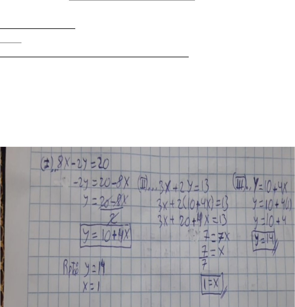 PRUEBA ESCRITA DE LÓGICA Y FUNCIONES PROGRAMA ACADÉMICO: COMPUTACION E INFORMATICA TUTNO: NOCTURNO APELLIDOS Y NOMBRES :……………......garcia ramos jesus alberto 1) Resolver el siguiente sistema de ecuaciones por el método de sustitución, grafique las rectas 8x – 2y = 20 ------ ( I ) 3x + 2y = 13 ------ ( II) (5 puntos) 2) Andrea vende fotografías en las ferias de arte. Los precios de sus fotos van de acuerdo con su tamaño: las fotos chicas cuestan $10, las fotos medianas cuestan $15, y las fotos grandes cuestan $40. Normalmente vende tantas fotos chicas como medianas y grandes combinadas. También vende el doble de fotos medianas que de fotos grandes. Un puesto en la ferie cuesta $300. Si sus ventas son como normalmente las realiza, ¿cuántas fotos de cada tamaño necesita vender para pagar el puesto? ( 4 puntos) 3) ¿Cuántas soluciones tiene este sistema? , Justifique su respuesta 6x + 4y + 2z = 32 3x – 3y – z = 19 3x + 2y + z = 32 A) No hay soluciones porque al Multiplicar la última ecuación por −2 para obtener −6x – 4y – 2z = −64. Si le sumas esta ecuación a la primera, obtendrás 0 = −32, un enunciado incorrecto. Esto significa que el sistema no se llegará a la solución correcta. (4 puntos) 4) El premio de un sorteo se reparte en forma inversamente proporcional al número de boletos adquiridos y son respectivamente: 2, 3 y 7. ¿Cuánto dinero recibió el que compró más boletos, si en total se repartió S/ 1 271? ( 3puntos) 5 ) Dividir 1 600 en tres partes inversamente proporcionales a: y 6. Calcular la suma de las partes menor y mayor. (4 puntos)