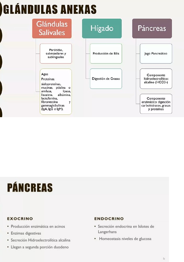 Las glándulas salivares tienen gran secreción de agua y también secreta proteínas, encaminadas a un sistema de protección o defensas o para iniciar la fase de digestión de alimentos. El hígado es una glándula anexa a la producción de bilis, este también se encarga del metabolismo de diferentes sustancias, la bilis tiene como objetivo la digestión de grasas y favorecer la recirculación enterohepática para el almacenamiento de la bilis. El páncreas tiene una gran secreción llamada el jugo pancreático (páncreas exocrino) tiene un componente hidroelectrolítico, que es alcalino por la presencia de bicarbonato y un componente enzimático que se encarga de la digestión de carbos, grasas y proteínas cuando el jugo pancreático se deposita en el duodeno en su segunda porción cuando el quimo llega a este. En ese momento da la secreción alcalina necesaria para disminuir o neutralizar el efecto acido de la gran cantidad de acido que compone el quimo cuando viene del estómago. Se encuentran funciones endocrinas en los islotes de Langerhans y su principal función es la homeostasis de los niveles de glucosa a nivel fisiológico. La unidad funcional del páncreas exocrino es el pancreon, que está compuesto por: · los acinos · los sistemas ductales intralobulares y el sistema ductal extralobular. En los acinos se tienen la producción de las enzimas digestivas que permiten liberarlos a nivel del duodeno. En el sistema ductal es donde se produce el componente hidroelectrolítico (sodio, potasio, cloro, bicarbonato y agua) la composición de acinos y el sistema ductal da el jugo pancreático, que tiene un ph de 7.6-8.2 y se calcula que tiene un volumen de 1500-2000 ml/24h. SUSTANCIAS SECRETADAS POR EL PÁNCREAS ENDOCRINO: · Insulina · Glucagón · Somatostatina SUSTANCIAS SECRETADAS POR EL PÁNCREAS EXOCRINO: Enzimas digestivas y componentes hidroelectrolítico. El jugo pancreático va a tener un componente hidroelectrolítico y enzimático. El hidroelectrolítico se produce en las células centro acinares y ductales. Son las encargadas de la secreción de bicarbonato porque tienen en su interior la ANHIDRASA CARBÓNICA. Esta secreción se hace durante la fase digestiva, para alcalinizar todo el quimo que procede el estomago al duodeno. Hay 2 formas en las que se tiene la secreción hidroelectrolítica: · Por secreción: Se da por la anhidrasa carbónica para hacer el intercambio de bicarbonato · Por filtración de plasma: Esta dada por el sodio y potasio El calcio y el magnesio van a ser secretados por las células acinares, que se disminuye con la presencia de secretina y aumenta con el estímulo de la COLECISTOCININA-PANCREATOZIMA El bicarbonato proviene del filtrado del plasma y el 7% proviene de producto del metabolismo oxidativo intracelular que finalmente produce dióxido de carbono y por acciones de la anhidrasa carbónica se tiene el componente de bicarbonato y cloro ENZIMAS ENZIMAS PROTEOLITICAS: Hacen digestión de proteínas ENZIMAS AMILOLÍTICAS: Digestión de carbohidratos, la enzima principal es la amilasa pancreática, que también se produce en la parótida, Glándula salival, hígado, pulmón y genital. Su principal sitio de producción es el páncreas ENZIMAS LIPOLÍTICAS: Digestión de ácidos grasos. Enzima principal es la lipasa pancreática. ENZIMAS NUCLEOLÍTICAS: Hidrolisis en los enlaces fosfodiéster a nivel de las células, están activas cuando se sospecha de enfermedades pancreáticas. La ARNasa o ribonucleasa estará aumentado en el cáncer de páncreas, la ADNasa está disminuida en casos de pancreatitis crónica. Todas estas enzimas podrían destruir el páncreas. Mecanismos para garantizar que estas enzimas no hagan daños en condiciones normales al páncreas y no generes su auto digestión: · La secreción de estas enzimas se realiza en forma de proenzimas inactivas, que se conocen como cimógenos. Una vez llegan los cimógenos al duodeno son activados por la tripsina que genera una cascada de activación de cimógenos presentes en el jugo pancreático. Entonces, solo a nivel del duodeno se activan estas enzimas. · Secuestrar las enzimas en compartimientos limitados por la membrana (gránulos de cimógeno) que por exocitosis liberan a los cimógenos · Presencia de inhibidores enzimáticos · Diferentes gradientes de presión en el sistema ductal. Será mayor en el conducto pancreático que en el conducto biliar, para que en el momento que confluyan no haya un reflujo de sustancias REGULACIÓN DE LA SCRECIÓN PANCREÁTICA La secreción pancreática esta regulada por el nervio vago. La acetilcolina es el neurotransmisor mas importante en la regulación exocrina y produce un incremento en la producción acinar. Es decir, la presencia o aumento de acetilcolina produce un mayor número de enzimas. La NEUROTENSINA se estimula tras la ingesta de grasas y potencializa la secretina para producir mayor cantidad de enzimas y reducir el bicarbonato. Si la neurotensina se empieza a potencializar con la colecistocinina-pancreatoenzima aumenta los niveles de bicarbonato. HORMONAS Y SUSTANCIAS PARACRINAS La secretina se produce en las células S del duodeno y yeyuno, a nivel pancreático es encargada de la producción de agua y bicarbonato, estimula el sistema ductal. La colecistocinina-pancreatoenzima se produce en las células I del duodeno y está encargada de aumentar la producción enzimática a nivel acinar. Aumenta su secreción cuando hay presencia de productos derivados de la degradación de grasas, proteínas y polisacáridos, quiere decir, que primero es la secretina y después empieza a actuar la colecistocinina-pancreatoenzima Cuando pasa del estomago al duodeno es la presencia del quimo acido, se neutraliza primero en el duodeno alcalinizándolo con bicarbonato que viene del páncreas, así que se produce la liberación se secretina, después, se pasa a la fase de digestión y entra la colecistocinina-pancreatoenzima a aumentar la producci