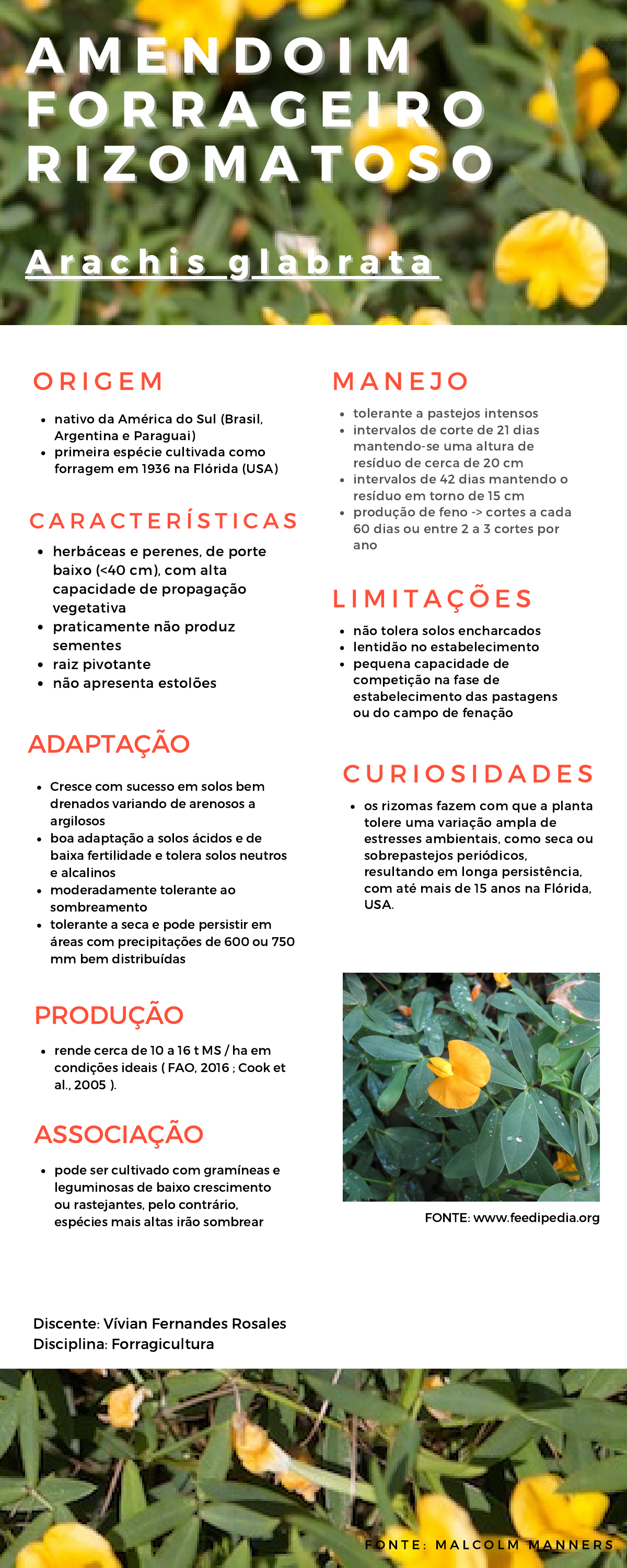 AM E N D O I MAM E N D O I M F O R R A G E I R OF O R R A G E I R O R I Z O M A T O S OR I Z O M A T O S O A r a c h i s g l a b r a t aA r a c h i s g l a b r a t a OR I G EM nativo da América do Sul (Brasil, Argentina e Paraguai) primeira espécie cultivada como forragem em 1936 na Flórida (USA) F O N T E : M A L C O L M M A N N E R S MANE JO tolerante a pastejos intensos intervalos de corte de 21 dias mantendo-se uma altura de resíduo de cerca de 20 cm intervalos de 42 dias mantendo o resíduo em torno de 15 cm produção de feno -> cortes a cada 60 dias ou entre 2 a 3 cortes por ano CUR I O S I DADE S os rizomas fazem com que a planta tolere uma variação ampla de estresses ambientais, como seca ou sobrepastejos periódicos, resultando em longa persistência, com até mais de 15 anos na Flórida, USA. CARAC T ER Í S T I C A S herbáceas e perenes, de porte baixo (<40 cm), com alta capacidade de propagação vegetativa praticamente não produz sementes raiz pivotante não apresenta estolões L IM I T AÇÕE S não tolera solos encharcados lentidão no estabelecimento pequena capacidade de competição na fase de estabelecimento das pastagens ou do campo de fenação ADAPTAÇÃO Cresce com sucesso em solos bem drenados variando de arenosos a argilosos boa adaptação a solos ácidos e de baixa fertilidade e tolera solos neutros e alcalinos moderadamente tolerante ao sombreamento tolerante a seca e pode persistir em áreas com precipitações de 600 ou 750 mm bem distribuídas FONTE: www.feedipedia.org PRODUÇÃO rende cerca de 10 a 16 t MS / ha em condições ideais ( FAO, 2016 ; Cook et al., 2005 ). ASSOCIAÇÃO pode ser cultivado com gramíneas e leguminosas de baixo crescimento ou rastejantes, pelo contrário, espécies mais altas irão sombrear Discente: Vívian Fernandes Rosales Disciplina: Forragicultura