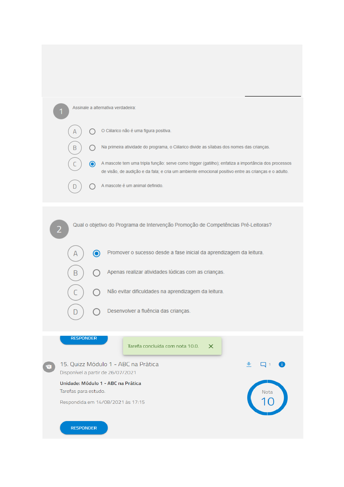 15. Quizz Módulo 1 - ABC na Prática Unidade: Módulo 1 - ABC na Prática (Curso ABC – MEC) OBS: As questões podem vim em ordens diferentes para cada usuário, portanto, leiam com atenção. Gabarito: 10/10