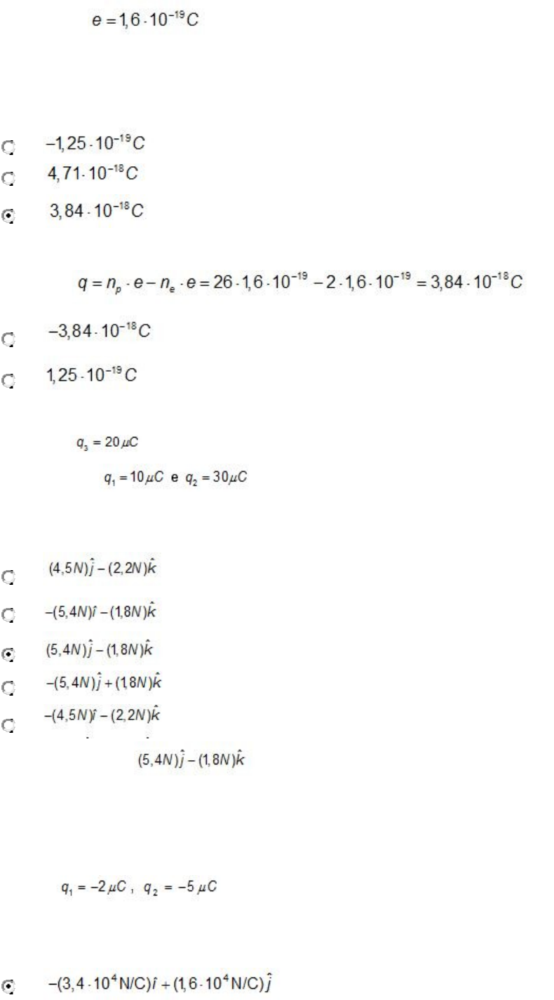 Atividade de aprendizagem 2 – eletromag Questão1 – As cargas elétricas são quantizadas, o que significa que elas existem em múltiplos de uma quantidade fundamental. Nos materiais do cotidiano, a carga elétrica sempre aparece em múltiplos da carga elétrica fundamental . A carga elétrica pode ser positiva ou negativa. Um átomo de ferro normalmente possui 26 prótons e 30 neutrons em seu núcleo atômico, e 26 elétrons em sua eletrosfera. Por algum processo, o átomo teve 24 elétrons arrancados. Qual a carga elétrica total do átomo após o processo? Escolha uma: a. b. c. O átomo teve 24 elétrons arrancados de sua eletrosfera. Os nêutrons têm carga elétrica nula. Com 26 prótons e 2 elétrons, temos uma carga elétrica resultante: d. e. Questão2 Uma carga localizada no ponto (1m; 1m; 0) de um sistema de coordenadas encontra-se sob a influência de duas cargas , localizadas respectivamente nos pontos (1m; 1m; 1m) e (1m; 0; 1m). A lei de Coulomb permite o cálculo da força à qual a carga 3 encontra-se submetida. Marque a alternativa que contém a força elétrica exercida sobre a carga 3. Escolha uma: a. b. c. d. e. A resposta correta é: . Questão3 O campo elétrico gerado por diversas cargas sobre um ponto pode ser calculado independentemente, carga por carga, e depois somado, graças ao princípio da superposição. Suponha que duas pequenas esferas com cargas elétricas , interagem eletricamente entre si, localizadas nas posições (0; 0) , e (0; 1m) respectivamente. Marque a alternativa que contém o campo elétrico gerado por elas sobre o ponto 3, localizado em (1m; 0). Escolha uma: a. b. c. d. e. Feedback A resposta correta é: . Questão 4 Uma espira tem formato retangular, com lados 0,4m e 0,6m. Ela está submetida a um campo elétrico uniforme de intensidade 50000N/C que a atravessa formando um ângulo de 60° com seu eixo central. Esta situação resulta em um fluxo de campo elétrico positivo. Marque a alternativa que contém o valor correto do fluxo de campo elétrico. Escolha uma: a. Para obter o fluxo de campo elétrico podemos multiplicar a projeção perpendicular do campo elétrico com relação à superfície plana, multiplicada pela própria área. A área do retângulo delimitado pela espira é . Portanto, podemos calcular o fluxo da seguinte maneira: b. c. d. e. Use a fórmula R=p.L/A onde L equivale ao comprimento nesse caso então a resposta é a letra e 3R