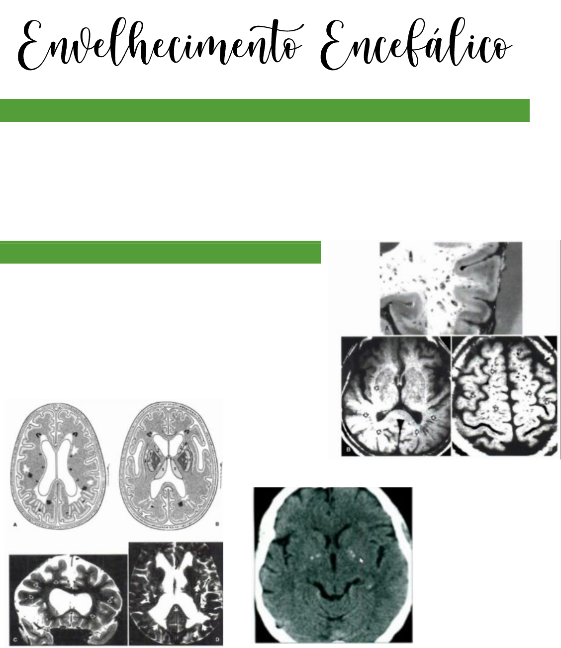 INTRODUÇÃO - O envelhecimento do encéfalo pode ser normal ou patológico. - O patológico é o desenvolvimento de doenças degenerativas com manifestações combinadas que determinam síndromes ou doenças específicas. - O normal não tem manifestações clínicas expressivas e pode ser subdivido em envelhecimento encefálico bem sucedido ou típico/usual. ENVELHECIMENTO ENCEFÁLICO TÍPICO - Alargamento dos espaços peri-vasculares (Virchow- Robin) pela presença de focos de alteração de sinal da substância branca. - Focos esparsos de hemorragia. - Depósito de ferro (particularmente nos núcleos da base). - Perda volumétrica do tecido encefálico, mais evidente nas regiões anteriores. ACHADOS CLÍNICOS - Indivíduos com envelhecimento normal não costuma apresentar sinais ou sintomas atribuíveis a manifestações neurológicas específicas. - O prejuízo no desempenho cognitivo é mínimo em testes neurológicos. ACHADOS HISTOPATOLÓGICOS - Redução do volume de tecido é secundário ao afilamento cortical, perda de subtância branca e presença de microinfartos corticais. - O alargamento dos EPV (espaços perivasculares) é pelo aumento do espaço subaracnóideo. - O acúmulo de ferro acomete principalmente áreas relacionadas a atividade motora como núcleos da base (particularmente o globo pálido), substância negra e núcleo denteado do cérebro. ACHADOS DE IMAGEM Tomografia computadorizada - Perda volumétrica encefálica: ocorre de maneira global, mas pode ser mais evidente nas regiões anteriores. - Alargamento dos sulcos corticais e fissuras cerebrais, bem como do sistema ventricular. (Consequência da atrofia do tecido cerebral) - Tênue hipoatenuação da substância branca peri-ventricular (provavelmente relacionado a microangiopatia e gliose). - Alargamento dos espaços perivasculares: mps m[icçeps da base, mesencéfalo e centro semi-oval. - Alterações vasculares: espessamento e calcificações parietais nas artérias carótidas e sistema vertebrobasilar, focos lacunares e micro-hemorragias. Ressonância magnética - Perda volumétrica de tecido encefálico com preservação da porção mesial dos lobos temporais. Essa região quando afetada causa, principalmente, Alzheimer. - Alargamento dos EPV: intensidade de sinal semelhante ao líquor. (Imagens ponderadas em T2) - Focos de hipersinal da substância branca periventricular e centros semiovais observados em T2/FLAIR. - Alterações vasculares: Tortuosidades, focos lacunares e microhemorragias (mais bem demonstradas nas sequências de susceptibilidade magnética – SWI, T2*), geralmente nos núcleos da base e tálamos. - Depósitos de ferro e íons paramagnéticos: marcado hipossinal nas sequência de susceptibilidade magnética nos núcleos da base, núcleos subtalâmicos e núcleos denteados do cerebelo. DIAGNÓSTICOS DIFERENCIAIS - Infartos lacunares: faz diagnóstico diferencial com alargamento focal dos EPV, o infarto costuma apresentar halo de hipersinal na sequência FLAIR. - Demência vascular: focos mais numerosos e confluente na substância banca estão relacionados a dano microvascular geralmente por HAS. - Encefalopatia aterosclerótica subcortical (Doença de Binswanger)é uma forma da demência vascular por múltiplos infartos. - Envolve as artérias medulares perfurantes longas, havendo hipoperfusão e dano isquêmico secundário da substância branca periventricular. - DDX – Hidrocefalia - Inicialmente está associada a aumento da pressão intracraniana e posteriormente pode alcançar um equilíbrio (hidrocefalia de pressão normal ou suspensa). - Hidrocefalia obstrutiva (não comunicante) – Há obstrução ao nível do sistema ventricular. - Hidrocefalia comunicante – bloqueio do LCR distal ao sistema ventricular (base do crânio ou ao nível das granulações de Pacchioni). - Hidrocefalia de pressão normal - Sintomas específicos: perda de memória, distúrbio da macha e incontinência urinária. - Dilatação do sistema ventricular desproporcional aos sulcos e cisternas encefálicas. - O fluxo LCR é hiperdinâmico pelo arqueduto cerebral produzindo artefato em flow void nos estudos de RM. - Doença de Alzheimer - Inicia-se geralmente após os 65 anos com prejuízo da memória recentemente e dificuldade de absorver novas informações. - A memória para fatos remotos é poupada. - A evolução da doença pode se associar a deterioração motora, comprometimento visuaisl, alterações psiquiátricas e distúrbios comportamentais. - No exame de imagem vai haver atrofia encefálica predominante nas regiões temporal e parietal. Há caracteristicamente um acometimento da região mesia (região mais medial do parênquima encefálico no lobo temporal). - Degenerações corticais assimétricas - Ocorrem em indivíduos sintomáticos. - A degeneração lobar frontemporal (complexo d Pick), degeneração corticobasal e degeneração cortical posterior. - Cada uma dessas variantes apresenta uma atrofia seletiva em determinadas regiões. - A sua valorização depende de condições clínicas específicas, sendo apensas achados fortuitos em indivíduos assintomáticos. DOENÇA DE PARKINSON - Resulta na degeneração de neurônios dopaminérgicos da substância negra, determinando redução da produção da dopaminaque inibiriam os neurônios colinérgicos. - Há aumento da acetilcolina que inibe o córtex pré-motor e reduz a atividade motora. - Clínica: bradicinesia, rigidez, tremor e instabilidade postural. - Os achados de imagem são uma atrofia da substância negra com perda neuronal e deposição de ferro e/ou substâncias ferromagnéticas. AVC - Perda súbita da função encefálica secundária a distúrbio no fluxo sanguíneo. - Pode ser isquêmico ou hemorrágico. - AIT é dedinido como episódio transitório de disfunção cerebral causada por isquemia focal no cérebro, medula ou retina. - Deve ser suspeitado déficit neurológicos foal, incluindo alteração de força e sensibilidad