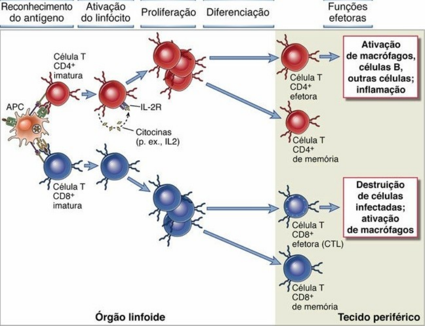 Tutoria 4 – Ativação dos Linfócitos T Objetivos: · Compreender as etapas de ativação e maturação das células T; · Elucidar as funções das células T ativadas (efetoras e de memória); Ativação dos linfócitos T: · A resposta das células T é altamente específica para o antígeno que estimulou; · A ativação inicial ocorre em órgãos linfoides secundários (baço e linfonodos), onde essas células normalmente circulam e encontram antígenos nas APCs ativadas; · Linfócitos T imaturos se movimentam pelos órgãos linfoides, interagindo momentaneamente com muitas células dendríticas e parando quando eles encontram o antígeno pelo qual expressam receptores específicos; · Citocinas conduzem a proliferação e diferenciação de células T ativadas por antígeno; · As APCs não apenas expõem os antígenos, mas também providenciam o estímulo que guia a magnitude e natureza da resposta das células T; · Células T efetoras reconhecem antígenos em órgãos linfoides ou em tecidos não linfoides periféricos, já que apresentam a habilidade de migrar para qualquer local de infecção ou inflamação; · A resposta das células T diminui depois que o antígeno é eliminado pelas células efetoras (contração); Sinais para ativação dos Linfócitos T: · A proliferação de linfócitos T e sua diferenciação em células efetoras e de memória requerem reconhecimento de antígeno, coestimulação e citocinas; · O antígeno é sempre o primeiro sinal necessário para ativação dos linfócitos, garantindo que a resposta seja específica para o antígeno; · A ativação requer o reconhecimento do antígeno apresentado pelas células dendríticas; · As células T efetoras diferenciadas podem responder à antígenos apresentados por células que não as dendríticas, como o linfócito T CD4+ auxiliar responde aos macrófagos e o T CD8+ citotóxico responde a células nucleadas; · Os coestimuladores são moléculas que agem juntamente ao antígeno para estimular as células T. Na ausência da coestimulação, células T que encontram antígenos falham ao responder e morrem por apoptose ou entram em um estado de não responsividade; · Coestimuladores B7:CD28 (via de ativação mais conhecida): o CD28 é um receptor de superfície de célula T enquanto B7 são moléculas coestimulatórias expressas nas APCs ativadas; · A expressão de coestimuladores B7 é regulada e garante que a resposta por parte das células T seja iniciada apenas quando necessário, já que B7 está ausente ou em baixo nível nas APCs em repouso e podem ser induzidos por ligação de produtos a receptores do tipo Toll e o IFN-gama (proveniente da imunidade inata); · Células dendríticas maduras expressam os maiores níveis de coestimuladores; · APCs que apresentam autoantígenos expressam baixo nível de coestimuladores, não ativando células T; · A sinalização coestimulatória via CD28 soma-se com os sinais induzidos por TCR (receptores de células T) e gera: expressões aumentada de proteínas antiapoptóticas (BCL-2 e BCL-X), promovendo sobrevivência de célula T; aumento da atividade metabólica celular, amplificação da proliferação das células T; produção de citocinas como IL-2 e diferenciação de células T imaturas em efetoras e de memória; · Células T efetoras e de memória ativadas são pouco dependentes da coestimulação pela via do B7:CD28; · Há outros receptores e ligantes que regulam as respostas das células T tanto positiva quanto negativamente; · CTLA-4 é um receptor coinibidor da família CD28 que apresenta alta afinidade para B7, sendo acoplado quando os níveis de B7 nas APCs é baixo podendo encerrar a resposta; · CTLA-4 pode inibir competitivamente o acesso da CD28 à B7, além de remover B7 nas APCs, sendo que a interação CTLA4:B7 inibem a ativação inicial dos linfócitos T em órgãos linfoides secundários; · PD1 (morte programada 1): ligante de PD1 inibe a ativação de células efetoras, especialmente em tecidos periféricos; · Células T auxiliares ativadas expressam o CD40L, que se liga ao CD40 nas APCs e as ativa para torna-las mais potente por meio da amplificação da sua expressão de moléculas B7 e da secreção de citocinas, como o IL-12, que promovem a diferenciação das células T. Dessa forma, célula T ativada licencia APCs para se tornarem estimuladora de resposta imune mais potente; Respostas funcionais dos linfócitos T: melhor definidas em linfócitos T auxiliares; · As principais respostas das células T consistem na expressão de várias moléculas da superfície bem como a secreção de citocinas; · CD69: mantém as células tempo suficiente no órgão linfoide para sua proliferação e diferenciação; · CD25: permite a resposta à citocina promotora de crescimento IL-2; · CD40L: possibilita as células T ativadas a cumprir suas funções efetoras (auxiliando macrófagos e células B); · A maior parte das citocinas envolvidas nas respostas imunes adaptativas são produzidas por células T CD4+ auxiliares; · A maioria das citocinas tem ação autócrina ou parácrina, com destaque para a IL-2 que é um fator de crescimento, sobrevivência e diferenciação de linfócitos T; · Células T helper secretam IL-2 na sinapse imunológica (região de contato físico entre a célula T e a APC); · IL-2 induz a proteína antiapoptótica BCL-2 (garantindo sobrevivência), estimula a progressão do ciclo celular (proliferação) e aumenta a produção de citocinas efetoras (IFN-gama e IL-4); · IL-2 é necessária para a sobrevivência e o funcionamento das células T reguladoras, pois suprime respostas contra autoantígenos, logo sua ausência pode gerar uma resposta autoimune; Expansão Clonal de Células T: mediada por uma combinação de sinais a partir do receptor do antígeno, coestimuladores e fatores de crescimento autócrinos, como IL-2; · A produção de IL-2 pelas células que reconhecem o antígeno garante qu