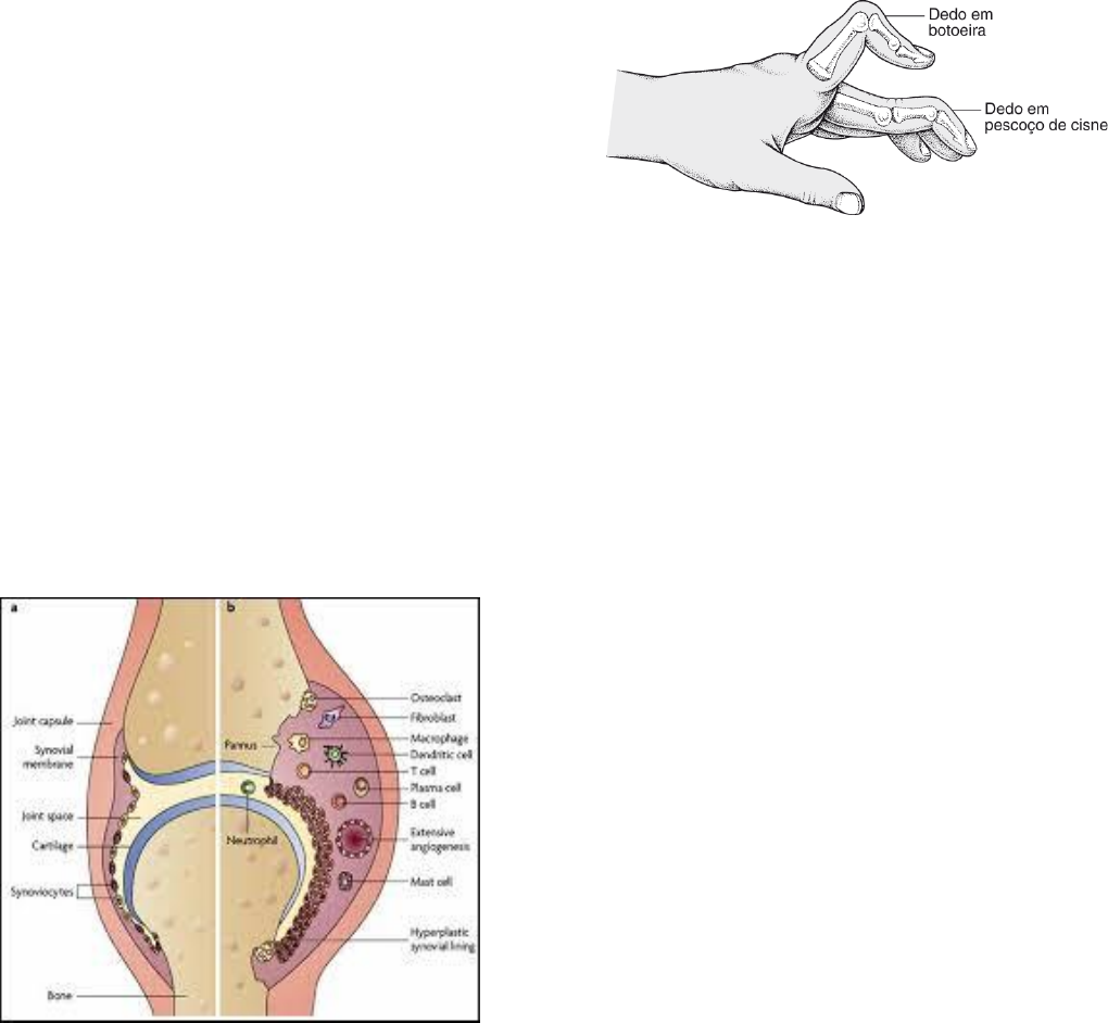 Natalie Celezinsky Clazer Artrite Reumatoide Definição: É uma doença inflamatória auto imune e sistêmica. Atinge a membrana sinovial, podendo evoluir com erosão e deformidades articulares. Epidemiologia: Atinge principalmente mulheres de meia idade. Proporção de mulheres 3:1 homem, geralmente entre 25 e 55 anos. FR: Tabagismo, exposição à sílica, asbesto e à madeira. Etiologia: •Genética: Presença do HLA DRB1 que possui uma região de epítopo compartilhado e essa, por sua vez, apresenta peptídeos citrulinados (artritogênicos) para linfócitos T, os quais se tornam auto reativos. Esses linfócitos T migram para o espaço sinovial e ativam macrófagos que produzem citocinas, principalmente TNF-alfa. Esses linfócitos T também geram a transformação de linf B em plasmócito, os quais secretam autoanticorpos, principalmente o fator reumatóide (IgM contra IgG). Essa inflamação das membrana sinoviais é chamada de sinovite e esse tecido inflamatório em proliferação é chamado Pannus. Manifestações clínicas: •Articulares: Poliartrite crônica: erosiva, acomete principalmente mãos (metacarpo falangiana e interfalangiana proximal, poupando interfalangiana distal), simétrica e aditiva. Causa dor articular e aumento do volume articular. Pode também acometer grandes articulações. Nas mãos apresenta frouxidão dos tecidos moles e desvio ulnar dos dedos, além de subluxações e proeminências ósseas. Sinais: Pescoço de cisne e Boutonniere (casa de botão). Os punhos tendem a ser acometidos simetricamente formando ‘punhos em dorso de camelo’. A hipertrofia sinovial pode causar a compressão do nervo mediano e geral a síndrome do túnel do carpo que leva à parestesia do polegar, 2º e 3º dedo e metade radial do 4º dedo. Para avaliar deve ser feita a manobra de Tinel e a de Palen. Os joelhos, quando acometidos, possuem o sinal da tecla que é a compressão da patela. Pode apresentar sinais que simulam uma TVP e nesse caso deve investigar cisto de Baker. A coluna não costuma ser acometida, com exceção de C1 e C2 que apresentam AR grave . •Extra-articulares: Pacientes com essas manifestações possuem altos títulos de fator reumatóide e anti- CCP. - Cutâneas: Apresentam nódulos subcutâneos causados pela vasculite de pequenas veias. - Oftalmológicas: Episclerite e Esclerite. - Pulmonares: Derrame pleural com líquido de baixo pH, baixo nível de glicose e queda do complemento. Pode também apresentar nódulos reumatóides no parênquima pulmonar e também fibrose intersticial difusa. Nos casos mais graves e de mau prognóstico pode ter Bronquiolite Obliterante com Organização Pneumônica (BOOP). -Cardíacas: Pericardite. Derrame pericárdico. Nódulos no miocárdio ou nas válvulas. Síndrome Felty: AR + Esplenomegalia + Neutropenia. Natalie Celezinsky Clazer Diagnóstico: Os critérios de 1 a 4 precisam estar presentes há pelo menos 6 semanas. Para diagnóstico é necessário pontuação maior que 6. Podemos fazer diagnóstico com razoável grau de certeza quando há: sinovite em 3 ou mais articulações, FR ou ACPA positivo, aumento de VHS e/ou proteína C reativa e exclusão de outros diagnósticos. Exames laboratoriais: •Fator reumatóide: é um autoanticorpo que ataca as igG. Sensibilidade de 70% e tem baixa especificidade. Geralmente tem altos títulos quando há manifestações extra articulares. Não é útil para monitoramento da doença. •Anti- CCP: Sensibilidade de 70% e alta especificidade (>90%). Aparece precocemente e não é útil para monitoramento. •PCR e VHS: apresentam-se altos na doença ativa e por isso pode ser útil como marcador da atividade da doença. Trombocitose e leucocitose também são achados. Artrocentese: Análise do líquido sinovial. Apresenta aspecto turvo, viscosidade reduzida, aumento de proteínas e concentração normal ou baixa de glicose. Há leucometria com predomínio de polimorfonucleares. FR e anti CCP costumam ser positivos. Radiografia: •Precoce: osteopenia peri-articular e aumento das partes moles. •Tardio: redução do espaço articular simétrica, erosões óssea justa articulares, desvio ulnar e subluxações. Diagnóstico Diferencial: Síndromes virais, LES, artrite psoriásica, artrite reativa, gota tofosa crônica. Tratamento: O Objetivo é colocar a doença em remissão, ou seja: ≤1 articulação dolorosa e edemaciada; PCR ≤ 1mg/dL; autoavaliação ≤ 1 ou índice simplificado da doença ≤ 3,3. •Medidas Gerais: O paciente precisa de um acompanhamento multidisciplinar, com psicologia, reumatologia, fisioterapeutas e demais profissionais. O risco cardiovascular deve ser reduzido com MEV, principalmente deixando o tabagismo. Devem ser vacinados contra influenza(anualmente) e penumococos(a cada 5 anos). •Medicamentos: - DARMS: São drogas antirreumáticas modificadores da doença. O principal é o Metotrexate (MTX). Tem efeito anti- inflamatórios e analgésico. Eles reduzem e retardam a progressão da doença. Metotrexato: inibe a enzima diidrofolato redutase. Pode usar suplementação com ácido fólico para reduzir sua toxicidade. Leflunomida: inibidor da síntese de pirimidinas. Cloroquina e hidroxicloroquina: antimaláricos. Menor toxicidade. Sulfassalazina: usada em combinação com outros DARMS. - DARMS biológicas: São usadas quando o tto inicial não obteve bons resultados. Ex: anti-TNF-alfa. - AINEs: São usados para sintomas, promovem analgesia e desinflamação. O uso prolongado deve ser evitado. - Glicocorticoides: Úteis no início até os DARMS fazerem efeito. Controlam surtos agudos e seu uso prolongado deve ser evitado. Deve usar a menor dose possível.