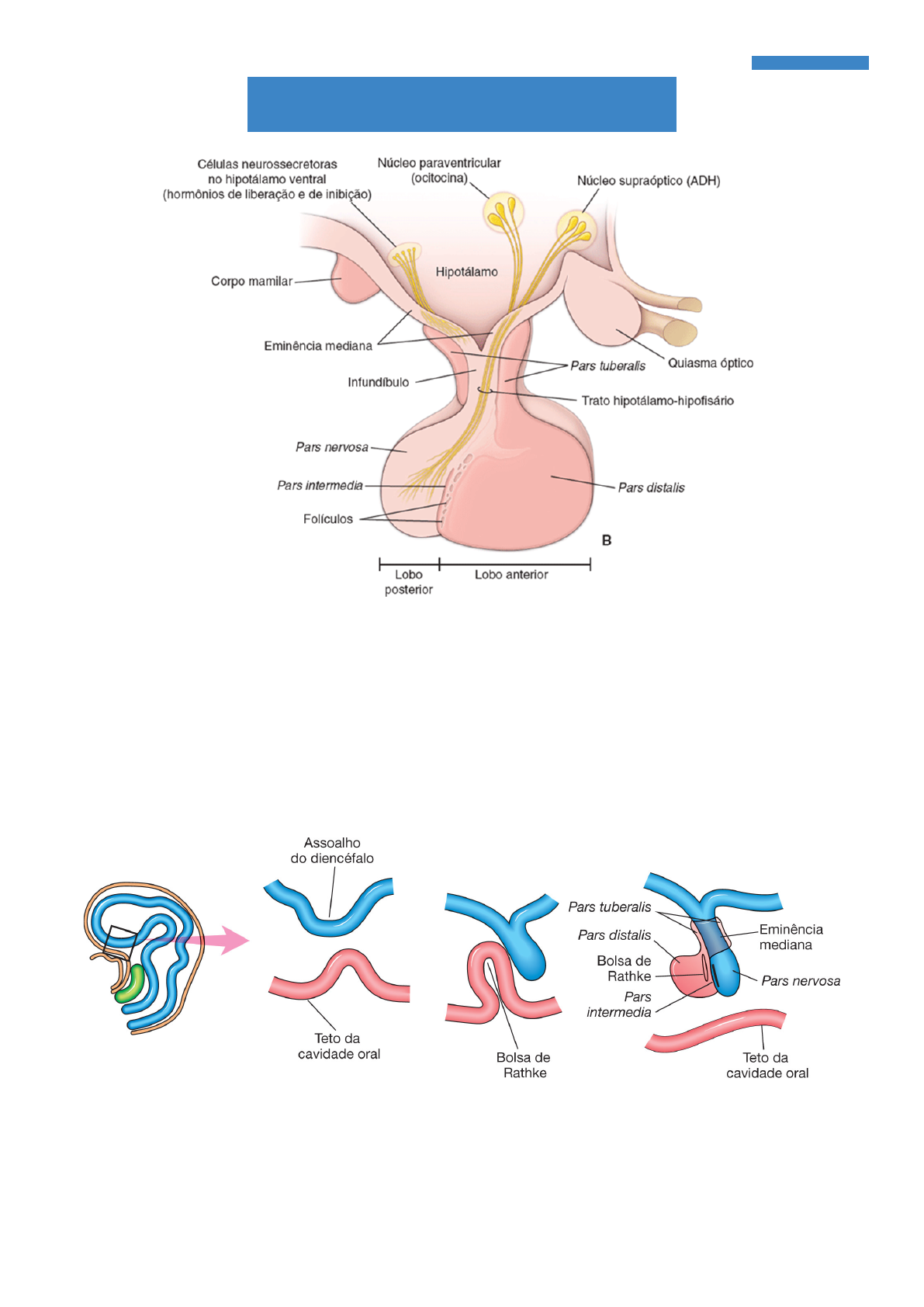 Beatriz N. Ferreira Hipófise - Glândula Pituitária ● Localiza-se na sella túrcica (cavidade do osso esfenóide). ● Se liga ao hipotálamo (situado na base do cérebro) pelo infundíbulo/pedículo - ligação entre a hipófise e o sistema nervoso central → os dois juntos são os "órgãos mestre do sistema endócrino". ● É revestida por uma cápsula de tecido conjuntivo, contínua com a rede de fibras reticulares que suporta as células do órgão. ● Possui origem embriológica dupla: nervosa e ectodérmica - Nervosa: desenvolve pelo crescimento do assoalho do diencéfalo em direção caudal. - Ectodérmica: desenvolve-se a partir de um teto da boca primitiva que cresce em direção cranial → formando bolsa de Rathke. ● Os neuro hormônios do hipotálamo estimulam a hipófise a trabalhar. ● 2 lobo: - Posterior: neurohipófise. - Anterior: adenohipófise. Beatriz N. Ferreira ● Lobo Anterior: - Tecido epitelial glandular. - Rico em células e essas contém grânulos de secreção. ● Lobo Posterior: - Tecido secretor neural. - Não tem tecido glandular, menos corada. Suprimento Sanguíneo ● Ocorre por 2 grupos de artérias originadas da carótida interna 1) Artérias hipofisárias superiores direita e esquerda: - Irrigam a eminência mediana e o infundíbulo. 2) Artérias hipofisárias inferiores direita e esquerda: - Irrigam principalmente a neuro-hipófise. ● No infundíbulo as artérias hipofisárias superiores formam um plexo capilar primário: cujas células são endoteliais fenestradas → reunir → formar vênulas e pequenos vasos → pars Beatriz N. Ferreira distalis → ramificam novamente → plexo capilar secundário. ● Sistema porta-hipofisário. ● O suprimento da pars distalis: sangue vindo do infundíbulo e em quantidade menor de ramos de artérias hipofisárias inferiores. ● Dessa maneira, vários neuro-hormônios produzidos no hipotálamo são levados diretamente do infundíbulo à pars distalis → controlando a função de suas células. ● O sangue venoso desse sistema sai por diversas veias hipofisárias. Corte de hipófise mostrando a pars nervosa, a pars intermedia e a pars distalis. Os asteriscos indicam alguns folículos da pars intermedia. (Fotomicrografia. Hematoxilina-eosina [HE]. Pequeno aumento.) Beatriz N. Ferreira Sistema Hipotálamo-Hipofisário ● 3 locais em que são produzidos diferentes grupos de hormônio: 1) Peptídeos produzidos por agregados de neurônios secretores situados no hipotálamo, nos núcleos supra ópticos e paraventriculares: - Os hormônios produzidos nos corpos celulares desses neurônios são transportados ao longo de seus axônios e acumulados nas terminações destes axônios → situados na pars nervosa da neuro-hipófise. - Quando estimulados → liberam a secreção → se difunde pelo meio extracelular → entra nos capilares sanguíneos da neuro-hipófise. - Esses originam vênulas e veias que acabam distribuindo os hormônios pelo corpo. 2) Peptídeos produzidos por neurônios secretores dos núcleos dorsomediano, dorsoventral e infundibular do hipotálamo: - Esses hormônios são levados ao longo dos axônios até suas terminações na eminência mediana, onde são armazenados. - Quando liberados, os hormônios entram nos capilares que formam o plexo capilar primário na eminência mediana e são transportados para a pars distalis por vasos que comunicam o plexo capilar primário com o plexo secundário. 3) Proteínas e glicoproteínas produzidas por células da pars distalis: - Esses hormônios entram nos vasos que formam o segundo trecho do sistema porta-hipofisário, o plexo capilar secundário → transportados por veias → distribuídos pela circulação sanguínea. Como o hipotálamo se comunica com a adeno-hipófise? Prolactina fora da gestação, mantém o desenvolvimento da glândula mamária e durante induz a produção de leite; GH é o declínio da liberação desse crescimento que marca o início do nosso envelhecimento - idosos ainda possuem → crescimento de cartilagens. Beatriz N. Ferreira ● Glândula hipófise é comandada pelo hipotálamo (dependentes). ● O que é hipotálamo? - Parte pequena do cérebro, localizada na base. - Composto por núcleos, corpos celulares de neurônios organizados em grupos (com suas determinadas funções). - Funções do hipotálamo: 1) Manutenção da temperatura corporal - Dipirona atua no hipotálamo. 2) Responsável pela conduta alimentar - Estímulo de alimentação: fome, sede e saciedade. - Sibutramina atua aqui. 3) Centros estimulados por fatores emocionais. - Tudo que você sente reflete no físico. 4) Controlam as secreções de vários neuro-hormônios hipofisários. - Estimulando ou inibindo → para a adeno-hipófise e de neuro-hormônios enviadas para → neuro-hipófise. - Em verde: neurônios presentes em 3 regiões (dorsomedial, dorsoventral e infundibular), esses encaminham impulsos (mensageiros - neuro hormônios) para a adenohipófise e então essa libere hormônios para a corrente sanguínea. - As terminações dos neurônios liberam os neuro hormônios na região do tufo de capilares (próxima ao infundíbulo) - Eminência mediana, esses estimulam ou inibem a adenohipófise. - Esses neurônios caem na rede de capilares, na corrente sanguínea, que estão no infundíbulo (eminência mediana). - Estrelas em azul: neuro hormônios vindos do hipotálamo → caem na eminência mediana → via sangue → estimulatórios ou inibitórios → seguem por veia (sistema porta) - veias emergem da eminência mediana → adeno hipófise → vênulas → veias → novos capilares (capilares sinusóides - não tem paredes contínuas) → os neuro hormônios saem dos capilares e dão sinais para as células secretoras, SINAIS POR Beatriz N. Ferreira CONTATO OU ESTIMULATÓRIO/INIBITÓRIO. - A glândula secretora → foi estimulada → mais hormônio para o sangue. - A glândula secretora → foi inibida → menos hormônio para o sang