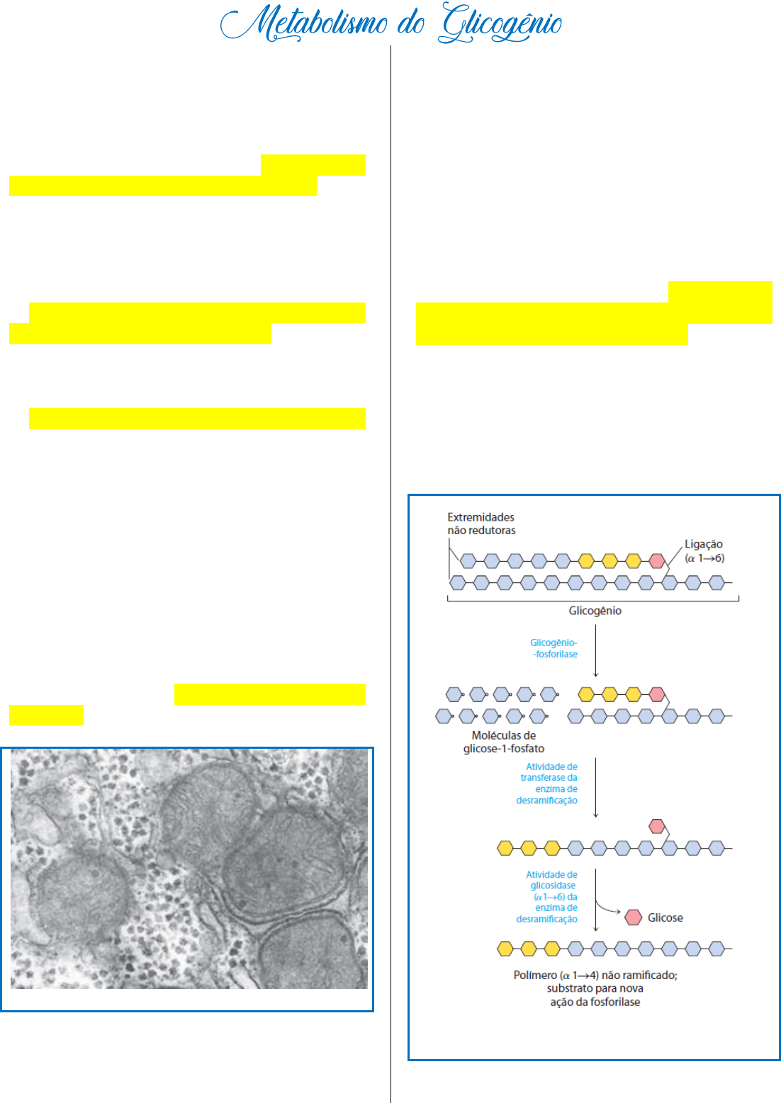 Generalidades sobre o glicogênio A glicose é armazenada polimerizada e esta polimerização se dá na forma de glicogênio (vertebrados e bactérias) ou de amido (plantas). O glicogênio corresponde a 10% do peso do fígado e a 1- 2% do peso do músculo esquelético, mas o armazenamento maior se dá no músculo por termos quantitativos, pois o músculo ocupa mais espaço físico. Além disso, o fígado utiliza pouco do glicogênio armazenado para ele mesmo e muito para os demais tecidos para manter a glicemia do corpo. O contrário acontece no músculo, que utiliza seu glicogênio para seu próprio tecido. A importância da polimerização do glicogênio se dá para que se evitem alterações osmóticas celulares. Afinal, a glicose de um hepatócito dissolvida possui 0,4M de quantidade de substância, enquanto a mesma massa de glicose polimerizada possui 0,01 µM. A diferença entre amido e glicogênio são as ramificações presentes neles. Porém, sua estrutura geral é a mesma: resíduos de glicose ligadas entre si por ligações glicosídicas do tipo (α1→4), na cadeia principal, ou (α1→6), no início da ramificação. O armazenamento do glicogênio se dá por meio de rosetas alfa, que é subdividida em partículas básicas beta, que é constituída de resíduos de glicose (partículas de glicose constituídas do glicogênio). A partícula básica do glicogênio, a partícula b consiste em 55.000 resíduos de glicose. De 20 a 40 dessas partículas se agrupam para formar as rosetas alfa, facilmente visíveis ao microscópio em amostras de tecidos de animais bem alimentados, mas que desaparecem apos um jejum de 24 horas. Uma partícula beta é considerada um glicogênio. Grânulos (rosetas) visíveis em microscopia A utilização do glicogênio, como já dito anteriormente, é feita por meio muscular ou hepático. Nos músculos, o glicogênio é exaurido em 1h de atividade intensa. Já no meio hepático, ele é exaurido entre 12-24h. Glicogenólise Glicogenólise é a quebra do glicogênio para a liberação de glicose. Essa lise sofre a ação de 3 enzimas: 1. Glicogênio-fosforilase Ela age nas extremidades não-redutoras das ramificações. Ela catalisa a reação na qual uma ligação glicosídica (a1→4) entre dois resíduos de glicose em uma extremidade é atacada por um fosfato inorgânico (Pi) e uma partícula de glicose é liberada de maneira fosforilada. Em outras palavras, ela retira a glicose da cadeia principal, adiciona um fosfato na sua estrutura e a glicose é liberada na forma de glicose-1-fosfato. 2. Enzima de desramificação do glicogênio Após a ação da glicogênio-fosforilase, as partículas restantes das ramificações (ligadas por α 1→4) são colocadas na “cadeia principal” e, em seguida, a ligação α 1→6 é quebrada e a glicose restante é liberada para o meio externo na sua forma livre. Desenho esquemático da ação da glicogênio-fosfatase e da enzima de desramificação. 3. Fosfoglicomutase Esta enzima, para finalizar, age nas glicose-1-fosfato presentes após a sua desconexão com o glicogênio. Ela, primeiramente, adiciona um fosfato (advindo da própria enzima) no açúcar, gerando a glicose-1,6-bifosfato. Em seguida, ela retira o fosfato no carbono 1, esse fosfato é retornado pra enzima e é formada a glicose-6-fosfato. Ação da fosfoglicomutase na conversão de glicose-1- fosfato em glicose-6-fostato. Esse açúcar tem destinos diferentes dependendo do tipo celular. Na célula muscular esquelética, a última reação não ocorre e o músculo utiliza a glicose-1,6-bifosfato direto na reação de glicólise. Já na célula hepática, a glicose-6-fosfato sobre a ação da glicose-6-fosfatase, convertendo em glicose e esta é liberada na corrente sanguínea para a manutenção da glicemia. Glicogênese Importante: Nucleotídeos não servem só pra formar ácidos nucleicos. A glicogênese pode ocorrer em vários tecidos. O substrato inicial é a glicose-6-fosfato, sendo advindo da dieta ou da gliconeogênese. Primeiramente, há a conversão da glicose-6-fosfato em glicose-1-fosfato pela ação da enzima fosfoglicomutase e após isso, o substrato sofre a ação de 3 enzimas: 1. Pirofosforilase Nas reações catalisadas pela pirofosforilase, a glicose-1- fosfato une-se a uma molécula de UTP (semelhante ao ATP só que com a alteração da base nitrogenada), gerando a UDP- glicose + pirofosfato (dois fosfatos livres). Essas reações estão expressas no esquema abaixo. Esquematização da ação da pirofosfatase 2. Glicogênio-sintase Essa enzima promove a separação do UDP e da glicose e a ligação dela em um glicogênio pré-existente. E se não houver um glicogênio pré-existente? Há a ação da proteína Glicogenina que atua como iniciadora e “produz” glicogênio a partir de 8 moléculas de glicose. Após a formação inicial, a glicogênio-sintase pode funcionar sobre esse novo glicogênio normalmente. Esquematização da ação da glicogênio-sintase 3. Enzima de ramificação do glicogênio Essa enzima é responsável por formar as ramificações. Diferentemente da enzima anterior, esta é capaz de formar as ligações (a1→6), características de ramificações. Importância da ramificação Ela torna a molécula mais solúvel e aumenta os sítios de ligação para a glicogênio-fosforilase e glicogênio-sintase. Regulação da glicogenólise Esquematização dos mecanismos de regulação da glicogenólise. Há a existência de dois tipos de fosforilase: A fosforilase beta (forma menos ativa) e a fosforilase alfa (forma ativa). O organismo utiliza conversão dessas duas formas para regular o nível da glicogenólise. Quando o nível de glicose no sangue diminui, há a liberação de glucagon e isso estimula a conversão da fosforilase beta para a alfa, afinal, a alfa permite maior lise do glicogênio para ceder glicose para o organismo. Quando a pessoa tem fome, o seu nível de stress aumenta – resultante da liberaç