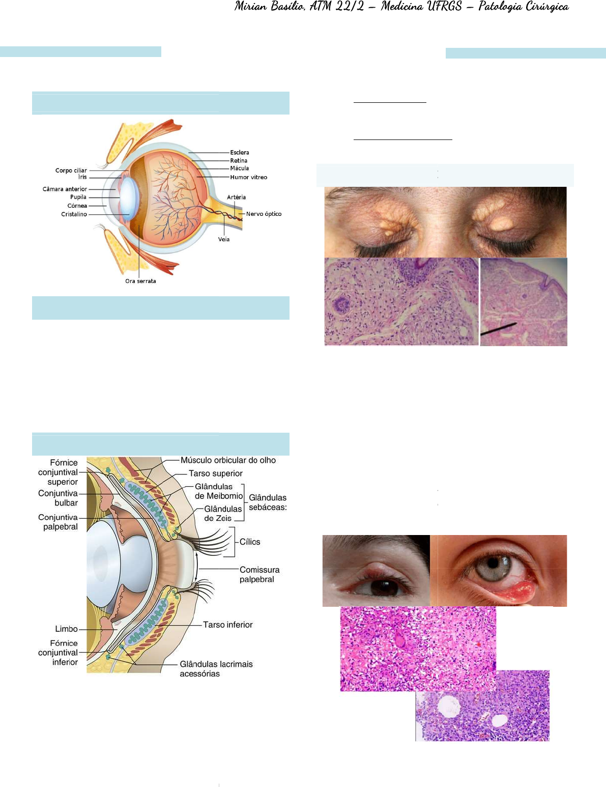 Patologia Cirúrgica Ocular ANATOMIA OCULAR O QUE O PATOLOGISTA RECEBE? O QUE O PATOLOGISTA RECEBE? Em 98% dos casos não se envia material para a patologia. Pálpebras; Conjuntiva; Córnea; Enucleações (retirada do globo ocular); Exenterações (esvaziamento de toda a câmara ocular, incluindo pálpebras). PÁLPEBRAS PÁLPEBRAS: Possui funções de prote do olho e produção da lágrima. É revestida por pele externamente e conjuntiva internamente. Na altura do fechamento das pálpebras, há uma região chamada comissura palpebral. Essa região é importante porque é a parte que fica menos protegida pelas pálpebras da radiação solar. Na sua porção interior há a musculatura orbicular e dois conjuntos de glândulas sebáceas modificadas Patologia Cirúrgica Ocular RECEBE? Em 98% dos casos Exenterações (esvaziamento de toda a câmara ocular, funções de proteção física evestida por pele conjuntiva internamente. Na altura do fechamento das pálpebras, há uma região chamada comissura palpebral. Essa região é importante porque é a parte que fica menos protegida musculatura orbicular e modificadas. Glândulas de Zeis (se pronuncia essa disgraça como Záis), ficam junto à borda ciliar, sendo mais superficiais. Glândulas de Meibomio à musculatura orbicular. NÃO NEOPLÁSICO XANTELASMA: Placas amareladas elevadas, correspondentes à acúmulo de gordura, associado de maneira indireta ao metabolismo do colesterol e hipercolesterolemia. São lesões totalmente benignas. Podem ser únicas ou múltiplas, uni ou bilaterais. Microscopia: Abaixo da pele, agrupamentos de células (macrófagos espumosos) contendo lipídios no seu interior. Essas células são microscopicamente semelhantes às vistas na colesterolose. Tratamento: Excisão cirúrgica das lesões (por questões estéticas), geralmente sem complicações. CALÁZIO: Cisto das localizado longe da borda ciliar, não comprometendo os cílios. É uma inflamação crônica ductos de secreção dessas g Patologia Cirúrgica Ocular (se pronuncia essa disgraça como Záis), ficam junto à borda ciliar, sendo mais mio, mais profundas em relação à musculatura orbicular. NÃO NEOPLÁSICO Placas amareladas, discretamente correspondentes à acúmulo de gordura, associado de maneira indireta ao metabolismo do colesterol e hipercolesterolemia. São lesões totalmente benignas. Podem ser únicas ou múltiplas, uni ou bilaterais. Abaixo da pele, se acumulam de células (macrófagos espumosos) contendo lipídios no seu interior. Essas células são microscopicamente semelhantes às vistas na Excisão cirúrgica das lesões (por questões estéticas), geralmente sem complicações. Cisto das glândulas de Meibomian, localizado longe da borda ciliar, não comprometendo inflamação crônica, que obstrui os ductos de secreção dessas glândulas. Clínica: Cisto não doloroso ou com pouca dor, sem sinais flogísticos. Etiologia desconhecida. Microscopia: Pode ter células gigantes multinucleadas e o infiltrado inflamatório é linfoplasmocitário, típico de uma inflamação crônica. Pode ser uma manifestação clínica tardia do terçol, mas é mais difícil de se resolver, às vezes excisão cirúrgica. HORDÉOLO/TERÇOL: Comprometimento das de Zeis, próximo a borda ciliar. É uma inflamação aguda. Clínica: Doloroso, com edema e eritema. Etiologia traumática ou infecciosa. Tratamento: Se resolve espontaneament dias. Compressas de água quente são ótimas. MOLUSCO CONTAGIOSO: Lesão inflamatória infecciosa, causada pelo Poxvírus, que pode acometer qualquer região do corpo. Em crianças: Comum, ocorre principalmente nas mãos e na face, sendo uma doença de contágio. Em adultos: Caso ocorra na região anogenital, é considerada uma DST. Clínica: Lesão de bordas elevadas e centro deprimido (lesões umbilicadas). Não possui nenhum risco de transformação maligna. Microscopia: Marcado espessamento e hiperplasia epitelial, cujo interior há numerosas inclusões virais características. Cisto não doloroso ou com pouca dor, sem desconhecida. Pode ter células gigantes multinucleadas é linfoplasmocitário, típico Pode ser uma manifestação clínica tardia do terçol, mas é mais difícil de se resolver, às vezes precisando de etimento das glândulas Doloroso, com edema e eritema. Etiologia Se resolve espontaneamente em poucos dias. Compressas de água quente são ótimas. Lesão inflamatória infecciosa, causada pelo Poxvírus, que pode acometer Comum, ocorre principalmente nas mãos ça de contágio. Caso ocorra na região anogenital, é Lesão de bordas elevadas e centro deprimido Não possui nenhum risco de transformação maligna. Marcado espessamento e hiperplasia epitelial, cujo interior há numerosas inclusões virais NEOPLASIAS BENIGNAS ACROCÓRDON (PFE /PÓLIPO FIBRO Pequenas projeções proliferativas, papilares, elevadas, polipoides, totalmente escamoso normal benigno, de eixo conjuntivo vascular. Tratamento: Excisão cirúrgica simples, por estética. PAPILOMA ESCAMOSO: Pode ser de origem traumática (mais raro). É benigno, sem chance de ma Clínica: Lesão polipoide possui aspecto mais grosseiro, Microscopia: Epitélio escamoso muito com várias lobulações. NEOPLASIAS MALIGNAS CARCINOMA BASOCELULAR: comum na pálpebra. Possui potencial de metastatização, mas de invasão/agressividade local. face e atingir meninges/SNC. Clínica: Lesão bem delimitada, brilhosa/perolada. Inicia-se como pápula rósea. NEOPLASIAS BENIGNAS ACROCÓRDON (PFE /PÓLIPO FIBRO-EPITELIAL): Pequenas projeções proliferativas, papilares, elevadas, polipoides, totalmente revestidas por epitélio escamoso normal benigno, de eixo conjuntivo vascular. Excisão cirúrgica simples, por estética. PAPILOMA ESCAMOSO: Lesão causada pelo vírus HPV. Pode ser de origem traumática (mais raro). É benigno, sem chance de malignização. polipoide/vegetante, cuja superfície possui aspecto mais grosseiro, verrucoso e lobulado. Epitélio escamoso mu