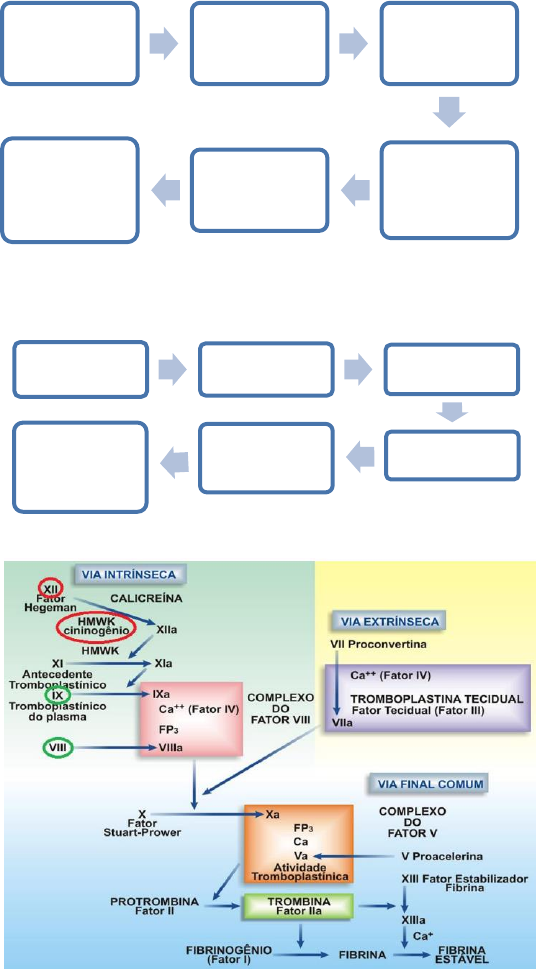 Hemostasia Hemostasia é um processo precisamente orquestrado que envolve plaquetas, fatores de coagulação e um componente vascular (endotélio). Após uma lesão tem-se a formação de um coágulo de sangue para reduzir ou cessar o sangramento. 1º evento ou vasoconstrição arteriolar: tem-se uma vasoconstrição arteriolar, sendo um efeito transitório que ocorre imediatamente e reduz o fluxo sanguíneo para a área lesada. É uma reação mediada por mecanismos neurogênicos reflexos e aumentada pela secreção de endotelina, um potente vasoconstritor derivado do endotélio. 2º evento ou hemostasia primária: tem-se a formação de um tampão plaquetário em que a rotura do endotélio expõe o fator de von Willebrand subendotelial e o colágeno (substâncias irritante que induz formação de trombo) do vaso, que fica exposto após a lesão endotelial. Expõe fatores trombogênicos, tem aderência e ativação das plaquetas (começa a ficar estrelada, expandir a área e formar uma rede maior para estancar a lesão). Tem liberação de alguns grânulos de ADP, tromboxano A2, entre outros que recrutam mais plaquetas e auxilia na formação do tampão plaquetário da lesão. 3º evento ou hemostasia secundária: tem-se deposição da fibrina, formando uma rede para estabilizar o coágulo formado pela adesão plaquetária, aumentando a eficiência de tamponamento. Ocorre exposição do fator tecidual, uma proteína pró-coagulante que é expressa por células subendoteliais (músculo liso e fibroblastos) na parede do vaso. Além disso, também se expõe fosfolípides da membrana, que na corrente sanguínea é trombogênico. Esse fator tecidual se liga ao fator VII, criando uma cascata de reações que culminam na formação da trombina. A trombina cliva fibrinogênio em fibrina insolúvel e forma uma malha que agrega mais plaquetas, tendo a consolidação do tampão primário na lesão. 4º evento ou estabilização do coágulo: polímeros de fibrina e alguns agregados de plaquetas se contraem e forma um coágulo sólido permanente. Além disso, eritrócitos e leucócitos se aderem na rede de fibrina através da P- selectina. Ocorre a ativação de mecanismos contra- regulatórios que limitam a formação do coágulo (ativador do plasminogênio tecidual-Tpa), para que a esse mecanismo de homeostasia não seja lesivo e passe a obstruir algum vaso. Por fim, tem-se a reabsorção e reparo do tecido. Componentes do processo de hemostasia Após a injúria do endotélio expõem-se componentes da MEC como colágeno IV, proteoglicanos, fibronectina e glicoproteínas, que são componentes estranhos ao meio, culminando na ativação das plaquetas, as primeiras a chegarem ao local de lesão. Essa ativação é mediada pelo fator de von Willebrand, que serve de ponte entre receptores de adesão das plaquetas (GbIb) e o colágeno. Desse modo, ocorre alteração de forma das plaquetas, que causa mudanças na conformação de GpIIb-IIa (proteínas de membrana das plaquetas, em que agem alguns anticoagulantes) e aumenta afinidade dessas com o fibrinogênio. Além disso, a ação dos fosfolípides facilita a integração entre o cálcio e fatores de coagulação. Depois de expostas aos fatores as plaquetas se aderem ao fator de von Willebrand no endotélio e secretam grânulos plaquetários alfa (p-selectina, fatores de coagulação e de crescimento) e delta (ADP, cálcio e histamina). O ADP induz uma mudança na glicoproteína GIIb-IIIa, que começa a se ligar nas moléculas de fibrinogênio e fazer uma rede. Além disso, o ADP juntamente com o tromboxano A2 (vasoconstrição) são importantes agregadores. Coagulação sanguínea A via intrínseca é ativada por colágeno, complexos Ag-Ac, endotoxina e fosfolípides. Um processo inflamatório também irá ativar essa via. A presença dos cofatores calicreína e de cininogênio de alto peso molecular (HMWK) irá ativar o fator XII, que ativa o fator XI, que ativa o fator IX, que na presença de cálcio e do fator VIII ativam o fator X. A via extrínseca é mais rápida e ativada após lesão tecidual pela liberação do fator tecidual. Ativação do fator XII Ativação do fator XI Ativação do fator IX Na presença de cálcio e de fator VII se ativa o fator X Clivagem da protrombina em trombina Trombina converte o fibrinogênio em fibrina Liberação do fator tecidual Ativação do fator VII Ativação do fator IX Ativação do fator X Clivagem da protrombina em trombina Trombina converte o fibrinogênio em fibrina Os fatores II, VII, IX e X são dependentes de cálcio. Ambas as vias irão culminar na ativação do fator X, numa via comum. A trombina tem vários estímulos locais além da transformação de fibrinogênio em fibrina, como induzir a ativação de monócitos e de linfócitos para o processo inflamatório. Fibrinólise Simultaneamente ao sistema de coagulação existe-se o sistema fibrinolítico, que contrabalanceia a formação de fibrina, degradando o coágulo. É composto por enzimas ativadoras e reguladoras produzidas por diversos sistemas, sendo a plasmina a principal enzima ativadora. A plasmina é formada a partir de um precursor: o plasminogênio produzido pelo fígado. A degradação da fibrina e fibrinogênio pela plasmina produz produtos de degradação da fibrina (PDF) que atuam como inibidores da coagulação que atuam sobre o fator V e VIII degradando-os. D-dímero: produto de degradação da fibrina, sendo um marcador de trombose. Sistema endotelial O endotélio também impede o contato das plaquetas com a matriz subendotelial trombogênica. Além disso, produz prostraciclina e óxido nítrico para a vasodilatação e degrada o ADP. Como efeitos anticoagulantes a trombomodulina converte diretamente a trombina em proteína anticoagulante, o complexo proteína C/proteína S inibe os fatores Va e VIIIa, moléculas heparina-like (ou antitrombina III) inativam a trombina e o inibidor do Fator Tecidual (TFPI), que impede a decor
