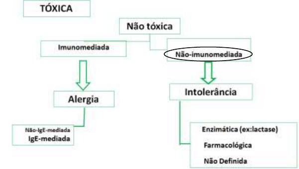 Ana Clara Quirino – 69 Página | 1 FACULDADE DE MEDICINA DE BARBACENA GASTROENTEROLOGIA, CLÍNICA MÉDICA I AULA 8 – Prof. José Eugênio INTOLERÂNCIA ALIMENTAR Conceitos: são coisas diferentes o Intolerância: Comprovada por exames e prova terapêutica (tratamento leva a melhora); Não imunológica Existe uma incapacidade de digerir algumas substâncias (principais: lactose, frutose, rafinose); Sintomas: distensão abdominal (inchaço da barriga), flatulência (gases) diarreia; Testes cutâneos negativos; Teste H2 expirado positivo. o Hipersensibilidade: Relação com mecanismos imunológicos (tipo III mediada IgG, tem memória, ou retardada tipo IV); Reação não tóxica Sintomas tardios (1/2 hrs depois de comer); Testes cutâneos negativos; Teste H2 expirado negativo; Quadro + leve que intolerância. o Alergia alimentar: Mecanismos imunológicos (tipo I IgE). Uma pequena quantidade pode desencadear resposta; Reação não tóxica; Sintomas imediatos (15/20 min): prurido, asma, dermatite atópica Testes cutâneos positivos; Exame de sangue: IgE positivo especifico para trigo, carne de porco, gema, camarão e vários outros alimentos. Sensibilidade não muito alta (pode dar negativo, mas o teste cutâneo confirma). Ana Clara Quirino – 69 Página | 2 Carboidratos SIMPLES: Monossacarídeos: Glicose; Frutose; Galactose. COMPLEXOS: Oligossacarídeos: Rafinose; Dissacarídeos: Lactose, Maltose e Sacarose. Principais intolerâncias: Quadro clínico: INTOLERANCIA À LACTOSE, FRUTOSE, RAFINOSE o Bastante variável na intensidade e sintomas; o Por vezes somente gases e distensão mais comum; o Em alguns casos cólica e diarreia; o Náuseas e/ou vômitos em crianças e adolescentes; o Diagnóstico Diferencial: principalmente com doenças funcionais, sobretudo síndrome do intestino irritável (principal, é comum ter os dois) e super crescimento bacteriano intestinal (relacionado à intolerância a lactose). Ana Clara Quirino – 69 Página | 3 1. INTOLERÂNCIA À ACÚCARES Lactose, sacarose e maltose são fracionadas pelas enzimas lactase, sacarase e maltase, que estão localizados na mucosa do intestino delgado; As enzimas clivam em açúcares simples (glicose) que são absorvidos pela parede intestinal; Porém na ausência das enzimas os açúcares mantêm-se no intestino delgado, aumentando a osmolaridade da luz, levando a exagerada secreção de água para o intestino, causando fermentação de bactérias e provocando sintomas. As mais conhecidas são: Intolerância a lactose Intolerância a frutose Intolerância ao sorbitol Intolerância a sacarose 2. INTOLERÂNCIA À LACTOSE Deficiência congênita de lactase: Grave, muito semelhante à APL (alergia proteína leite); Rara; Tratada pelo pediatra. Deficiência primária (em adultos): 90% asiáticos, 50% sul americanos, 30% USA/Europa Piora com a idade, o idoso quase no tem lactase (acomete 80% dos idosos aos 80 anos) produz H+ e tem gases, solta pum. Às vezes é oligossintomático, não incomoda. Deficiência secundária: Quando o paciente tem enterovirose, giardia, doença celíaca, Crohn, supercrescimento bacteriano intestinal. Papel da microbiota: por isso repõe lactobacilos Intolerância à Lactose: Teste diagnóstico POSITIVO Sintomas (distensão, gases) durante o teste: PRESENTES Má Absorção à Lactose: Teste diagnóstico POSITIVO Sintomas durante o teste: AUSENTES Ana Clara Quirino – 69 Página | 4 TESTE DO HIDROGENIO EXPIRADO (Gastrolyser): o paciente ingere o substrato (lactose) e o aparelho mede a quantidade de hidrogênio que sai pela expiração. a) Faz a medida do basal, antes de oferecer a lactose (em jejum) b) Oferece 25/50g de lactose diluído em 250 ml de água c) Realiza medidas de 30 em 30 minutos (com 1 hr já esta no duodeno, com 1:30 hr já esta no jejuno) d) Positivo: valores 20 ppm acima do valor basal (ex: basal 2 negativo se der menos de 22) e) Sintomas podem ocorrer até 8 horas após o teste TESTE POSITIVO 1. INTOLERÂNCIA A LACTOSE: TESTE POSITIVO + SINTOMAS PRESENTES DURANTE O TESTE 2. MÁ-DIGESTÃO DA LACTOSE: TESTE POSITIVO + SEM SINTOMAS DURANTE O TESTE TESTE DE TOLERÂNCIA À LACTOSE POR EXAME DE SANGUE Exame falho. Funciona pela medida de glicemia, após ingestão de lactose; Paciente toma leite lactose chega ao delgado lactase absorve a lactose e trás de dentro da luz intestinal para o sangue se quebra em glicose e galactose glicemia sobe; Laboratório: deve subir 20mg/dl da glicemia jejum; Na ausência de lactase a lactose é degradada pelas bactérias e formam muito H+ Ana Clara Quirino – 69 Página | 5 Se passar do basal de 80 p 100mg/dl: ótimo, tinha lactase que degradou lactose e jogou glicose p sangue; Sugere intolerância a lactose quando a glicemia não sobe (não houve absorção). Falso positivo: Quando faz medida de 30 e 60 minutos apenas. O momento certo seria 2h após ingestão (a lactose chega ao delgado) Falso negativo: Reserva natural de glicose: a glicose pode subir p mecanismo DM: começa a abaixar a glicemia Usa quando o paciente não pode pagar pelo outro, esse de sangue o SUS dá; Usado mais para rastreio (se vier positivo, pede o teste do H+ expirado) 3. INTOLERÂNCIA À FRUTOSE o Intolerância a frutose ou má absorção a frutose é uma condição benigna que ocorre quando a quantidade de frutose ingerida ultrapassa a capacidade de metabolização e absorção do intestino; o A prevalência e de 50% em indivíduos adultos normais; o Depende da quantidade que é ingerida (presente em fruta, cereal, mel); o A frutose não absorvida pode levar a sobrecarga osmótica (diarreia) ou fermentação bacteriana (flatulência, distensão abdominal e náuseas); o Corresponsável por sintomas da SII e na doença celíaca – às vezes ajuda a piorar a SII; o A má absorção de frutose pode associar-se a baixas concentrações de triptofano (aminoácido precursor da serotonina) com consequente depressão em crianças e adolescentes; o Diagnóstico: teste de tolerância à fru